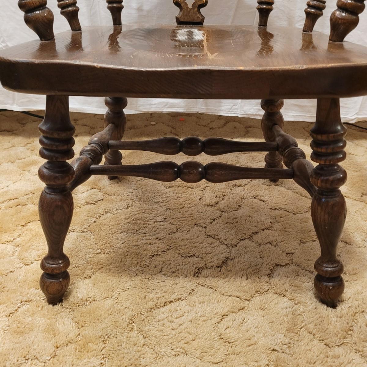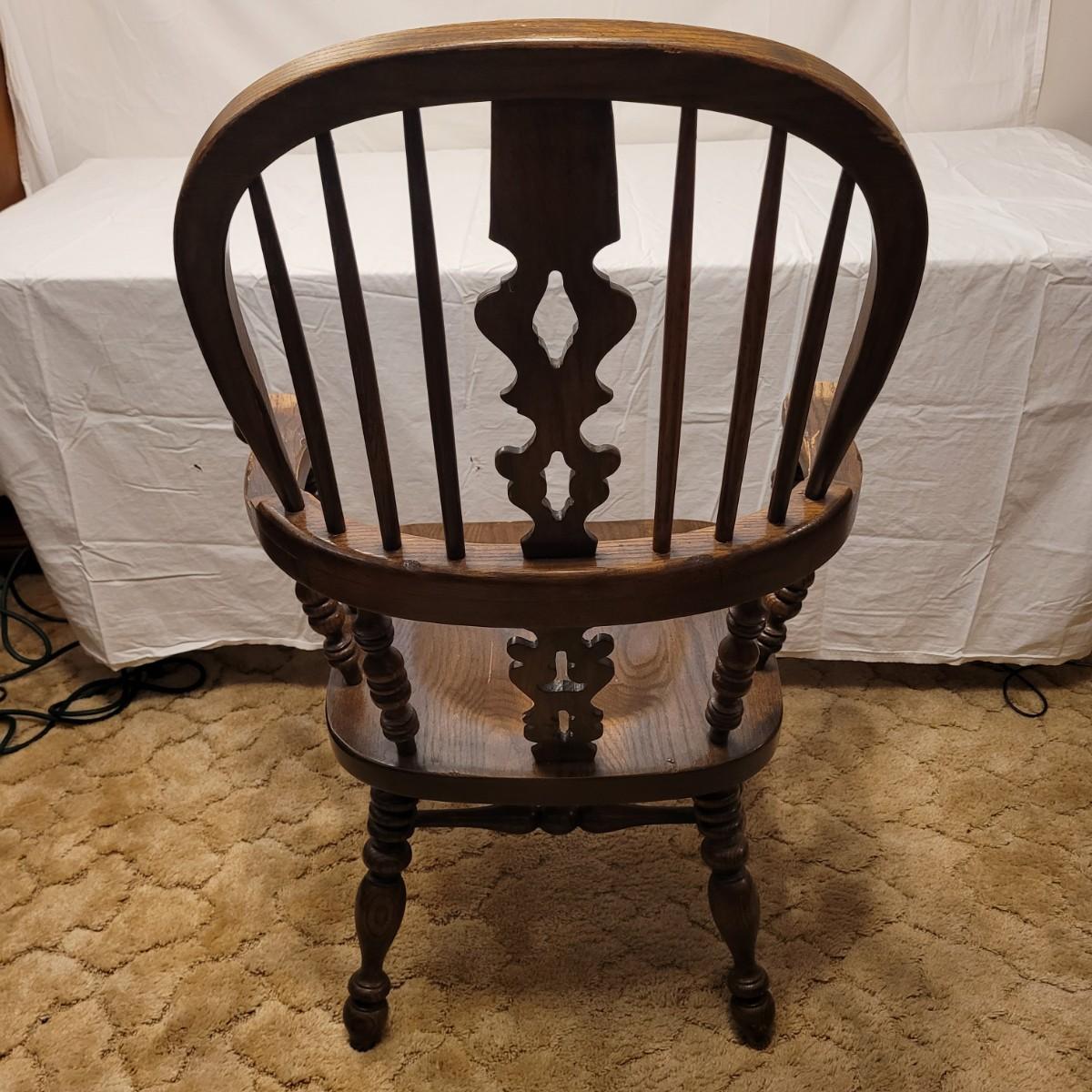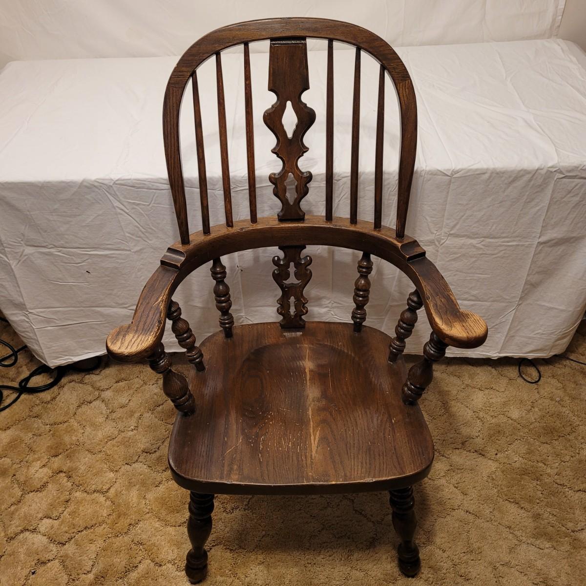 This lot includes a pair of matching solid wood armchairs. The armchairs are very solid and sturdy. They feature ornate carved wood pillars and arms. Individually, the chairs measure 27" x 21" x 42"H with a seat height of 17".