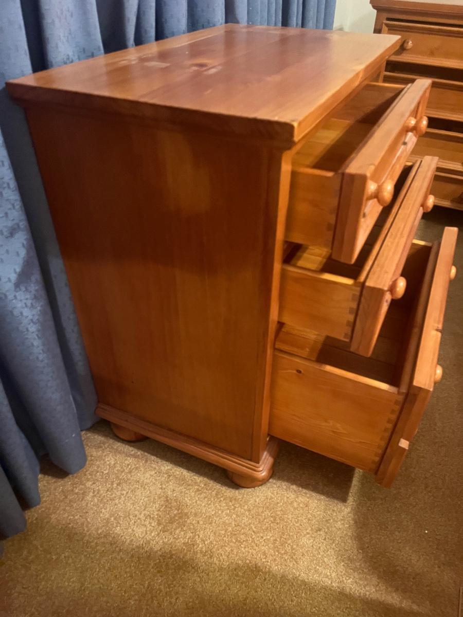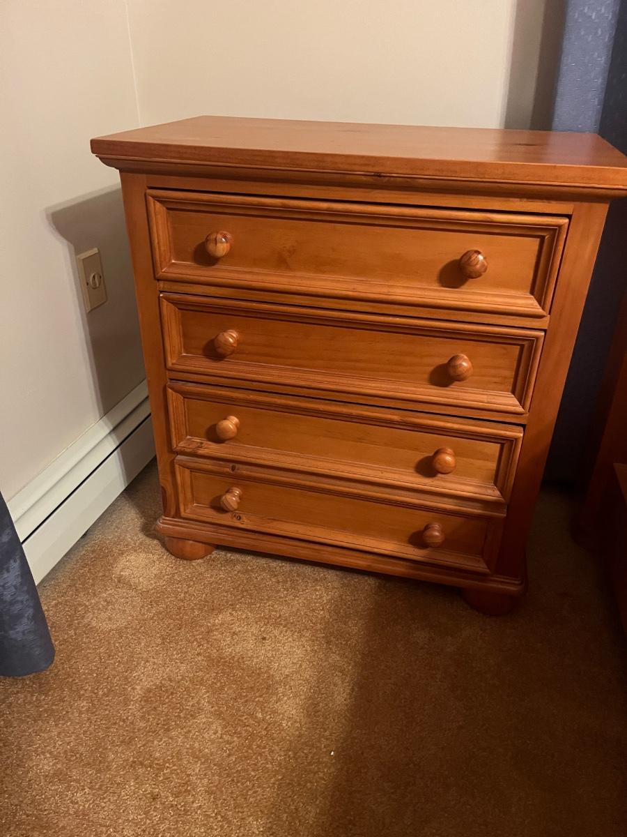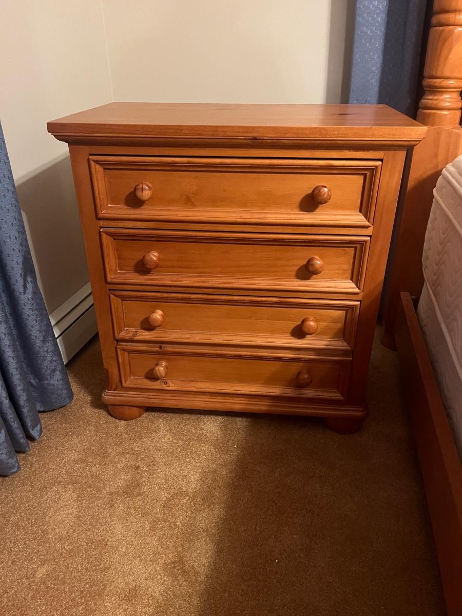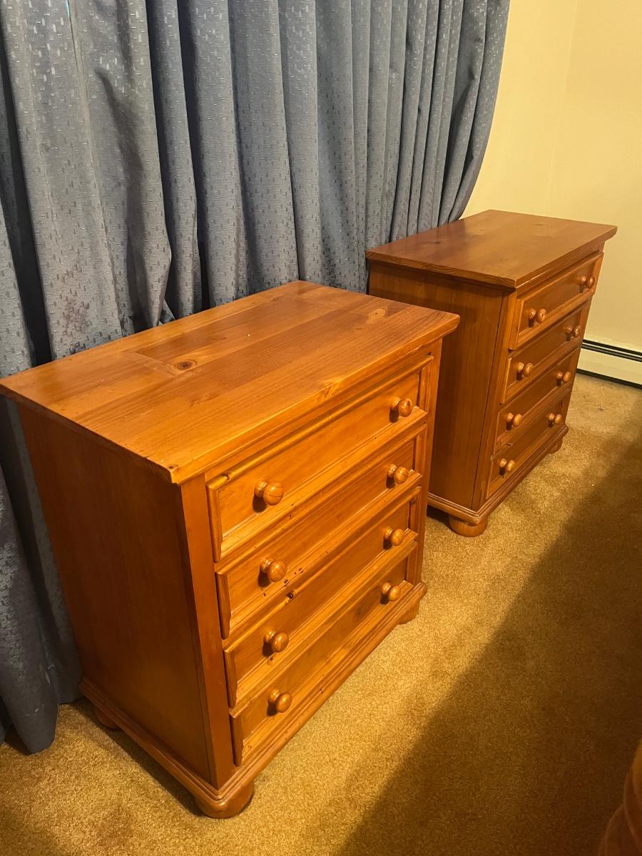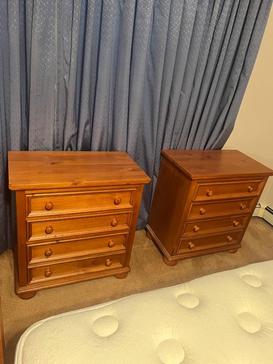 Lot includes two solid wood light colored (maybe Pine) end tables each with three dovetailed drawers. Tables measure 28” x 17” x 29.5”H. These items are part of a bedroom suite that are also in the auction.