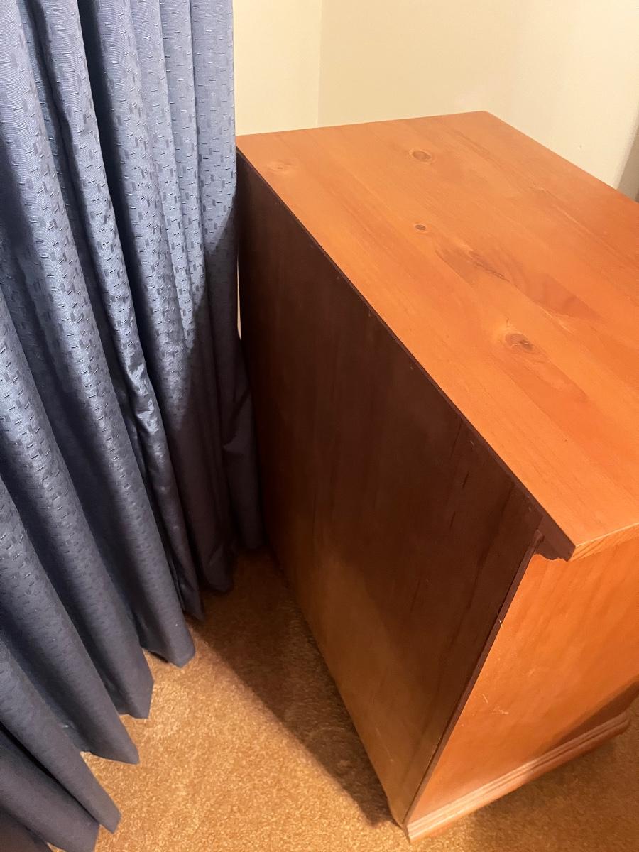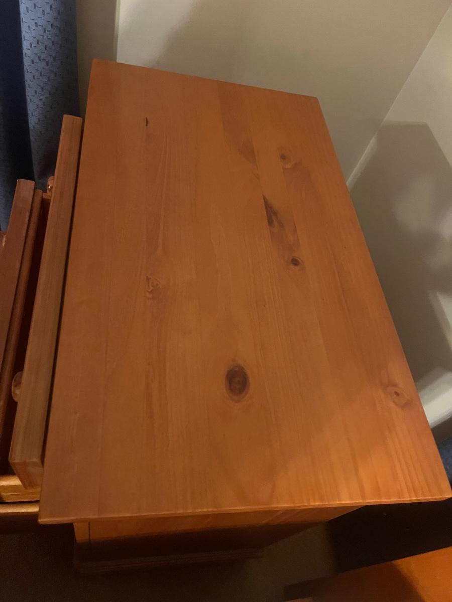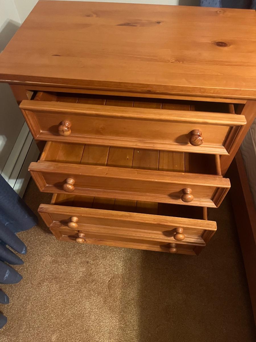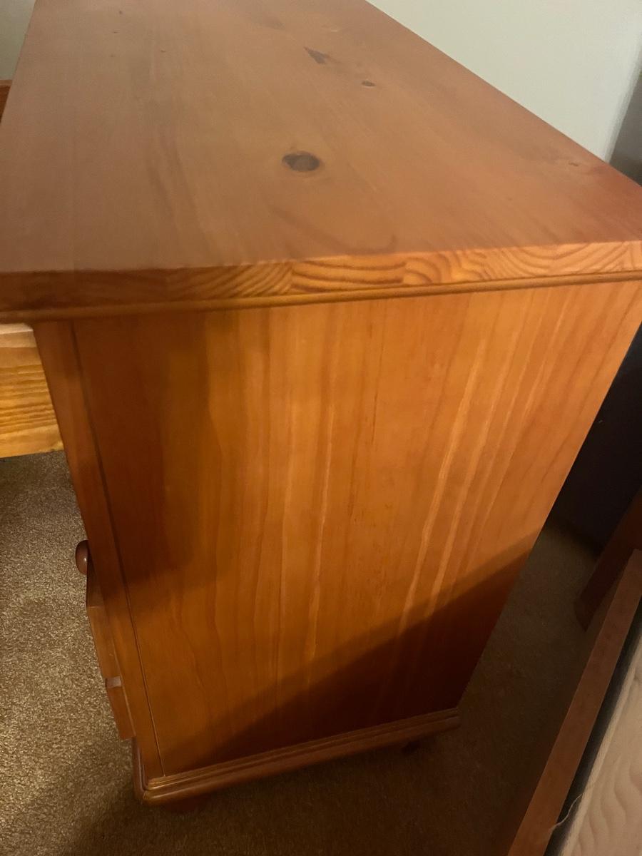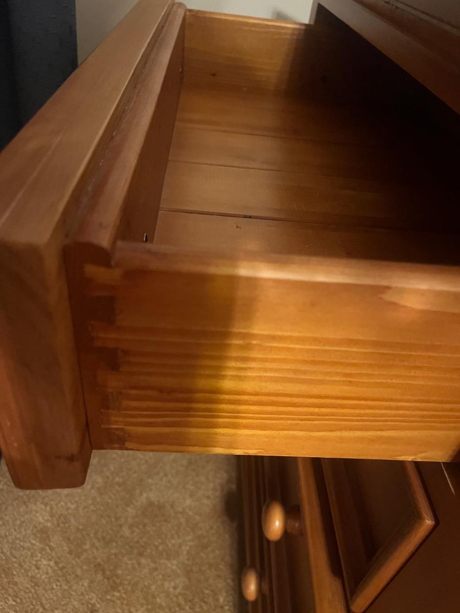 Lot includes two solid wood light colored (maybe Pine) end tables each with three dovetailed drawers. Tables measure 28” x 17” x 29.5”H. These items are part of a bedroom suite that are also in the auction.