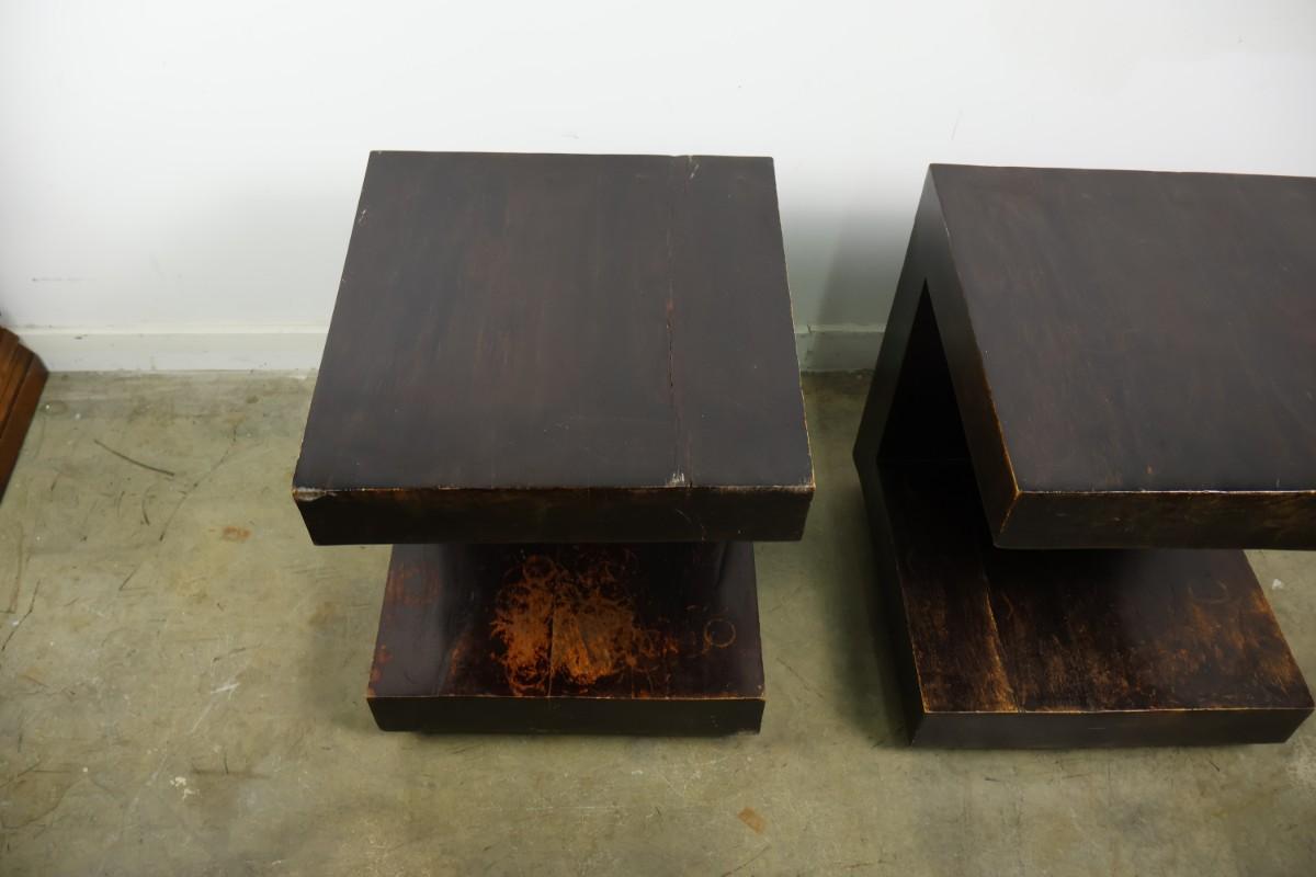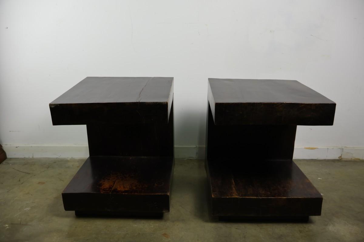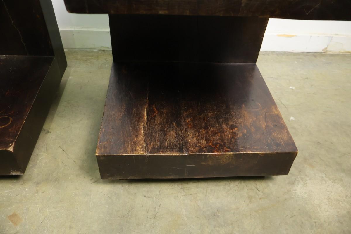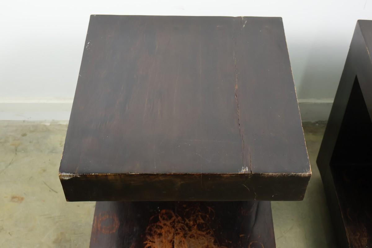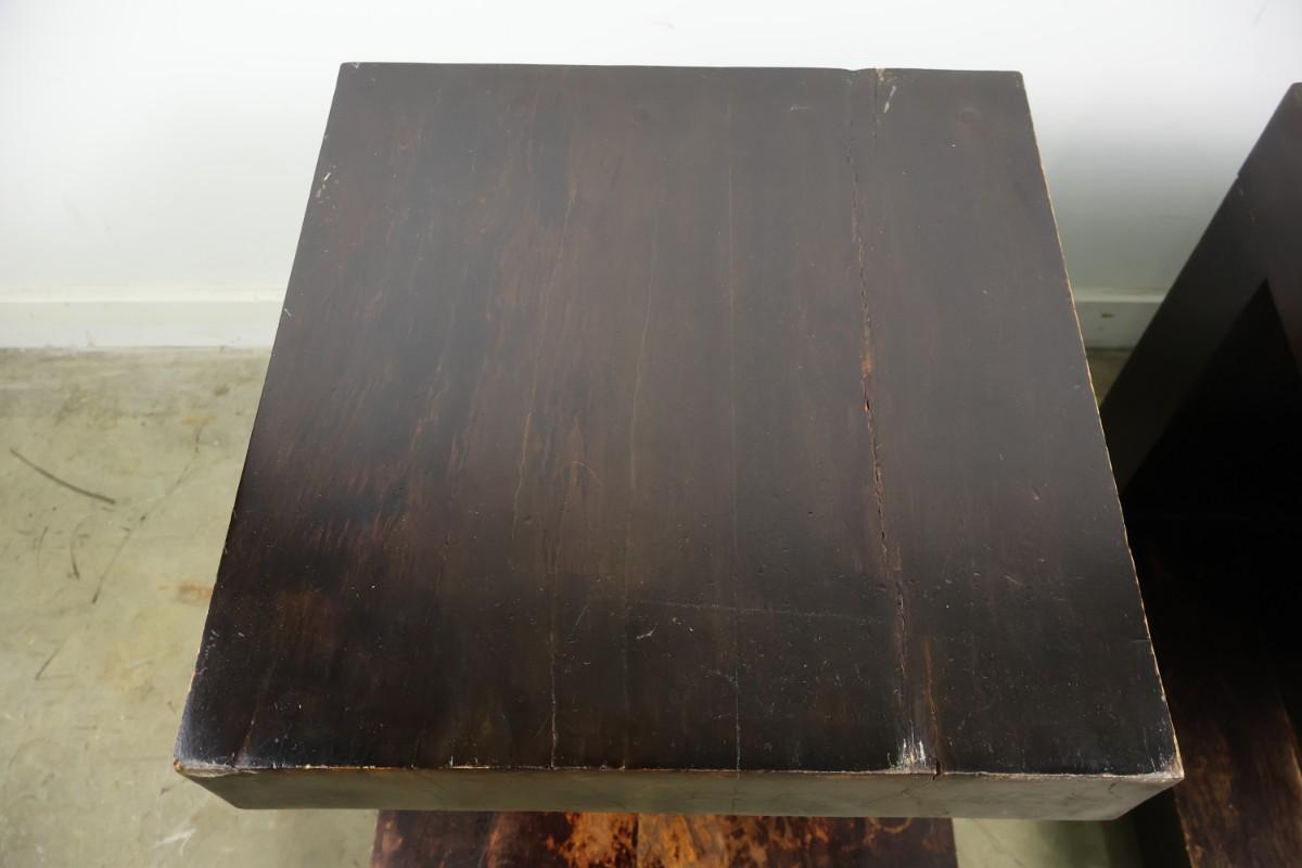 These tables are extremely heavy, solid wood tables from South Africa. They show extensive wear but are excellent candidates for refinishing. Each is 19 1/4" x 20" x 23" high.