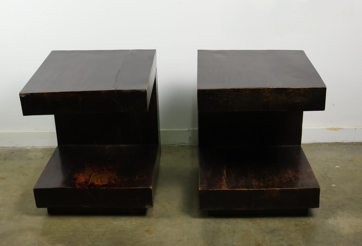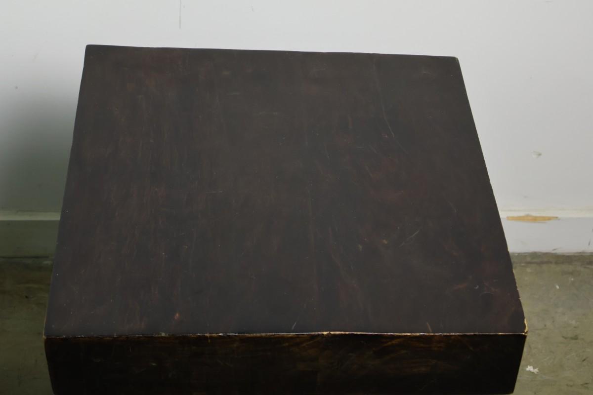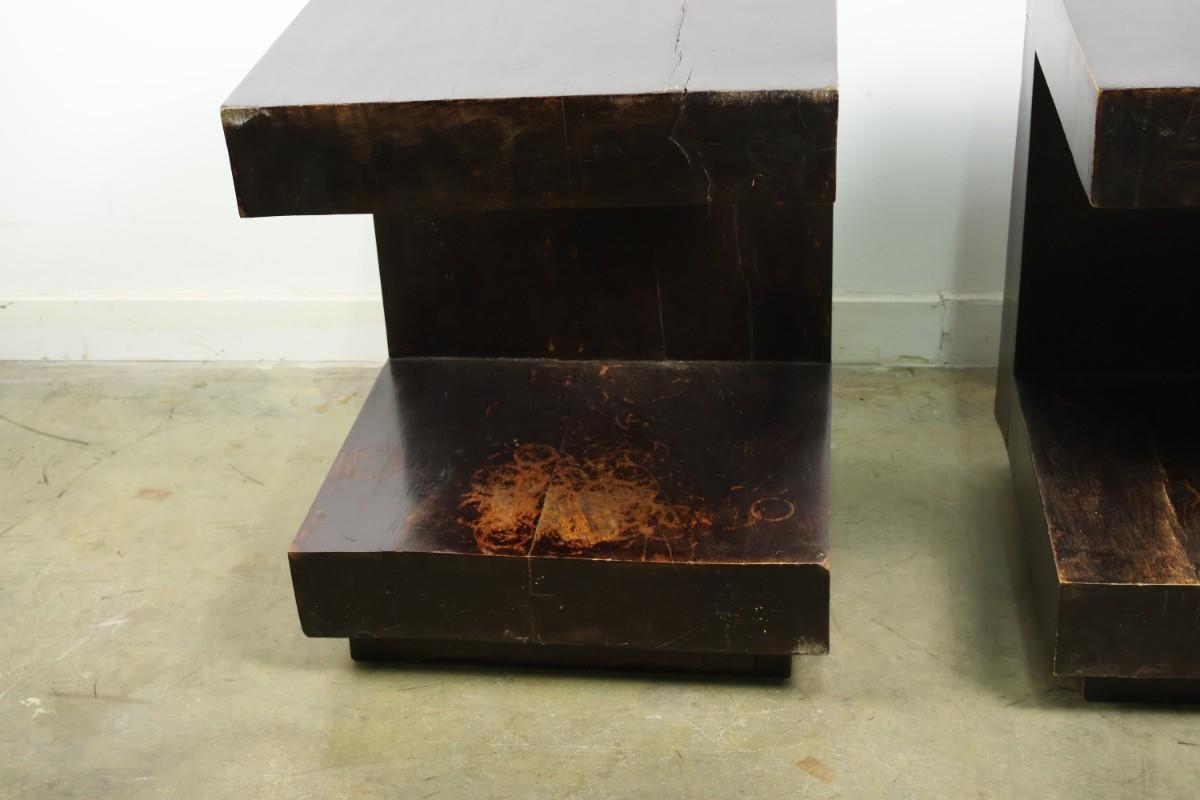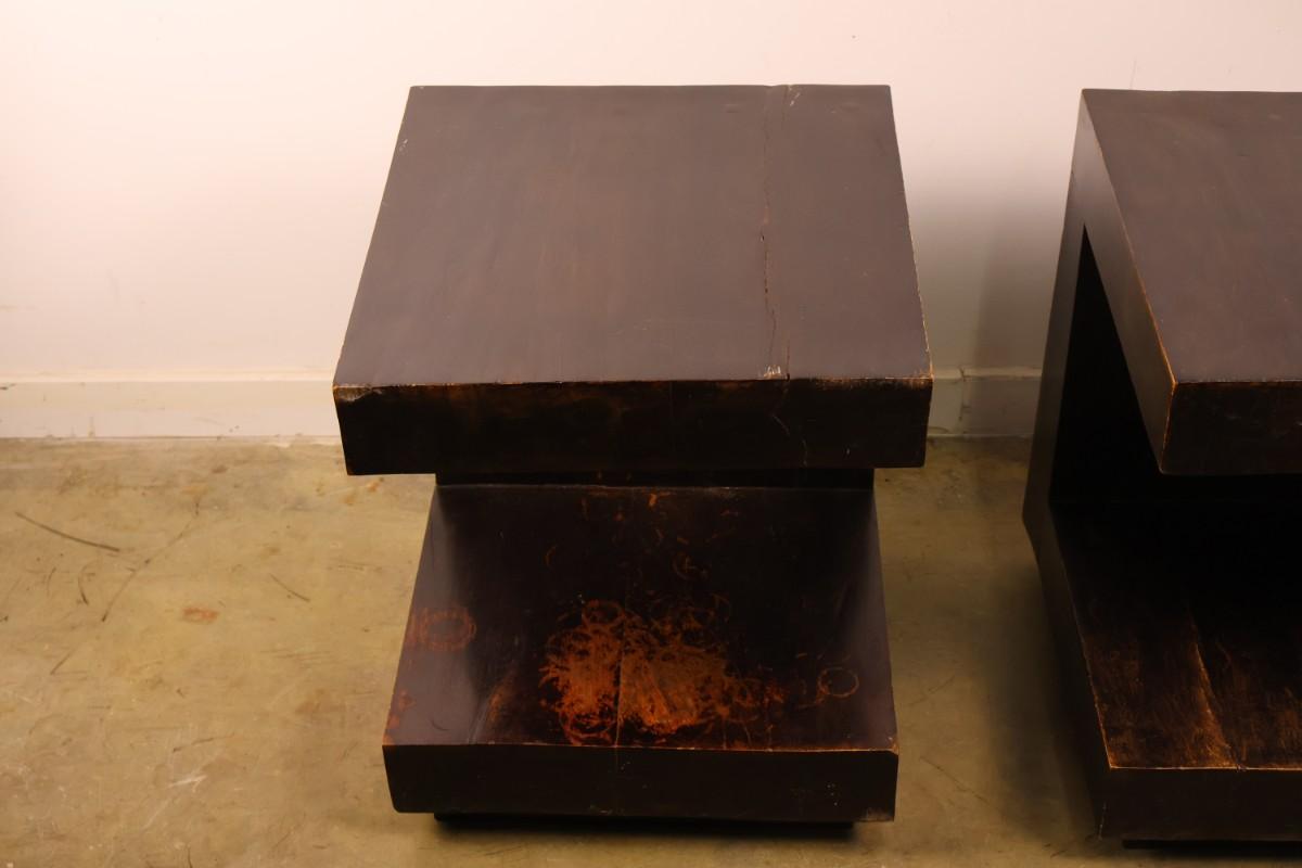 These tables are extremely heavy, solid wood tables from South Africa. They show extensive wear but are excellent candidates for refinishing. Each is 19 1/4" x 20" x 23" high.