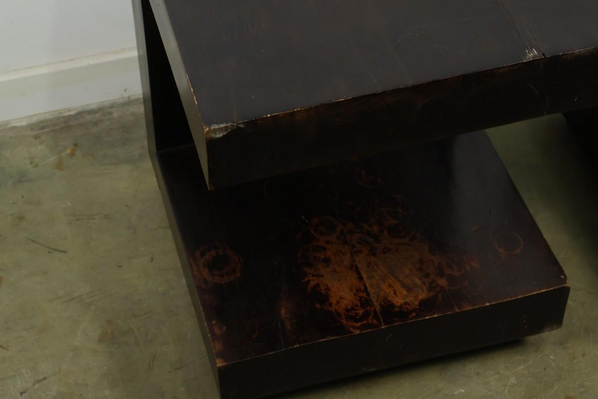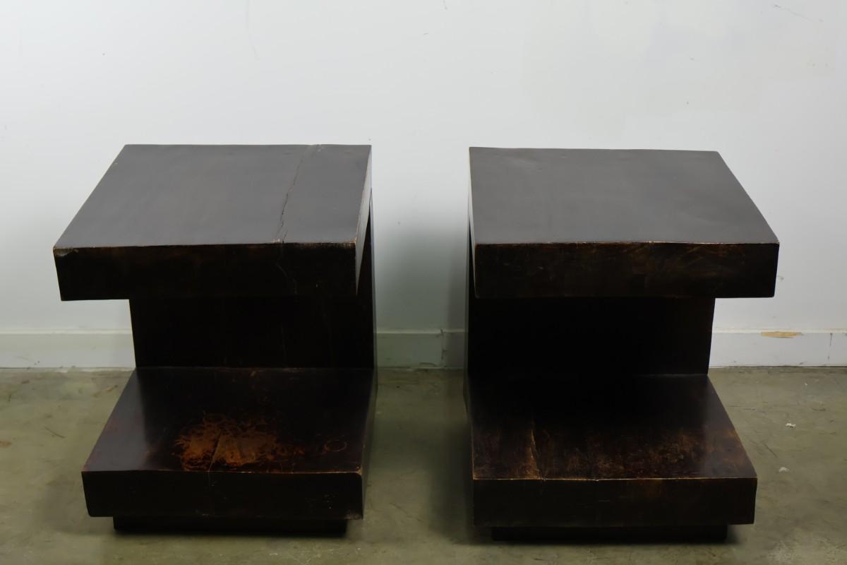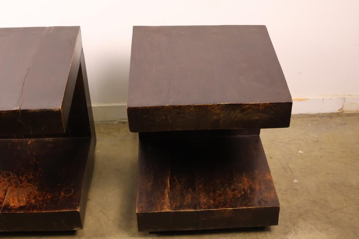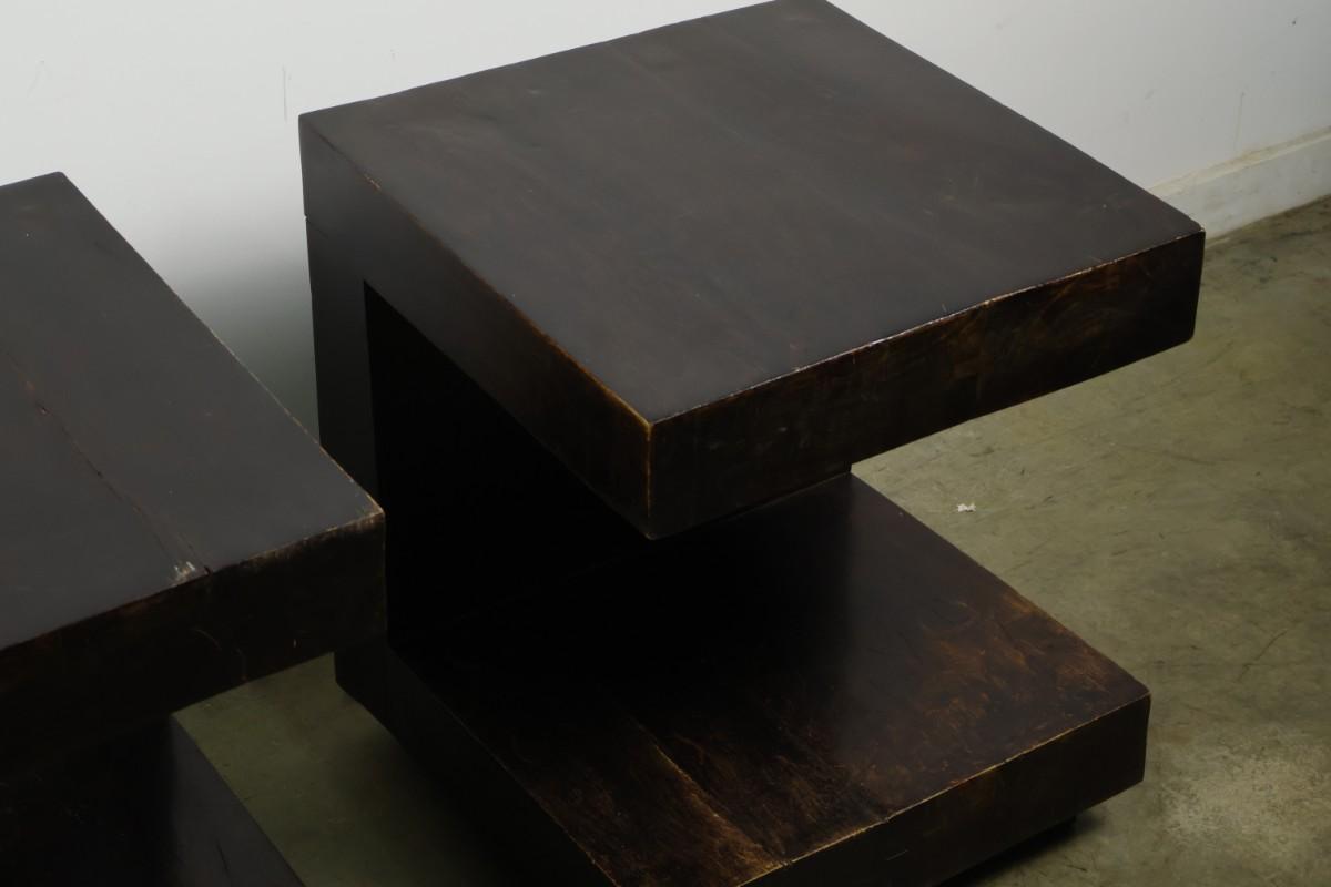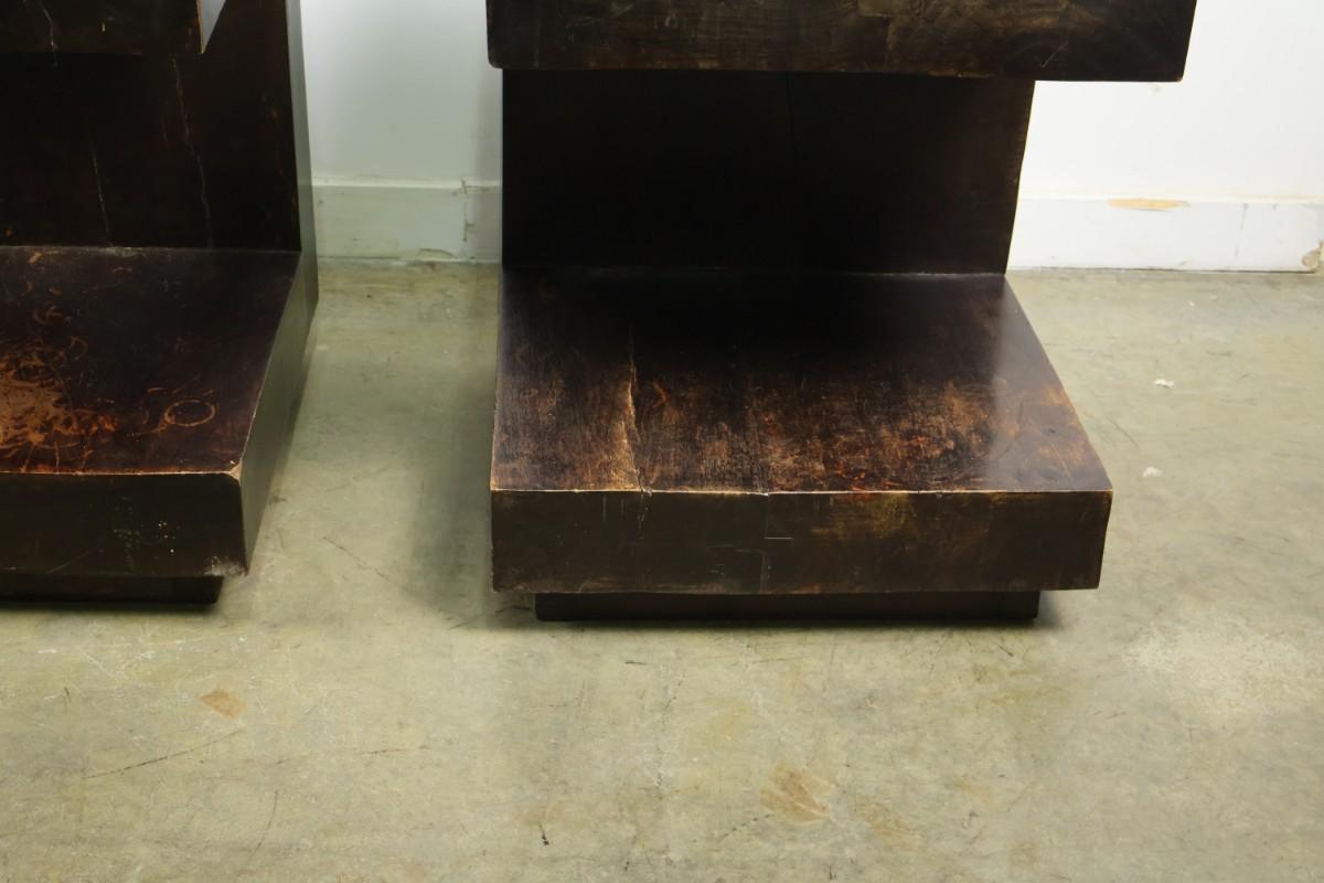 These tables are extremely heavy, solid wood tables from South Africa. They show extensive wear but are excellent candidates for refinishing. Each is 19 1/4" x 20" x 23" high.