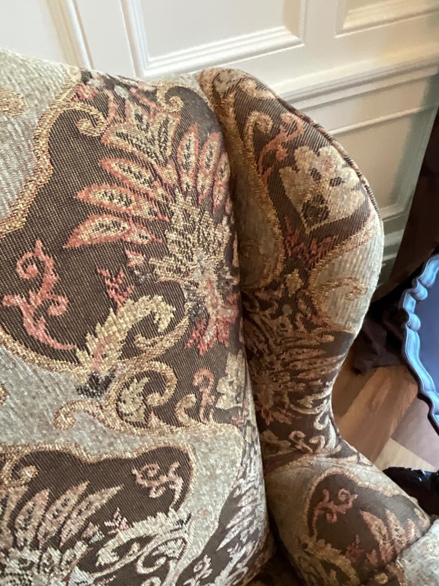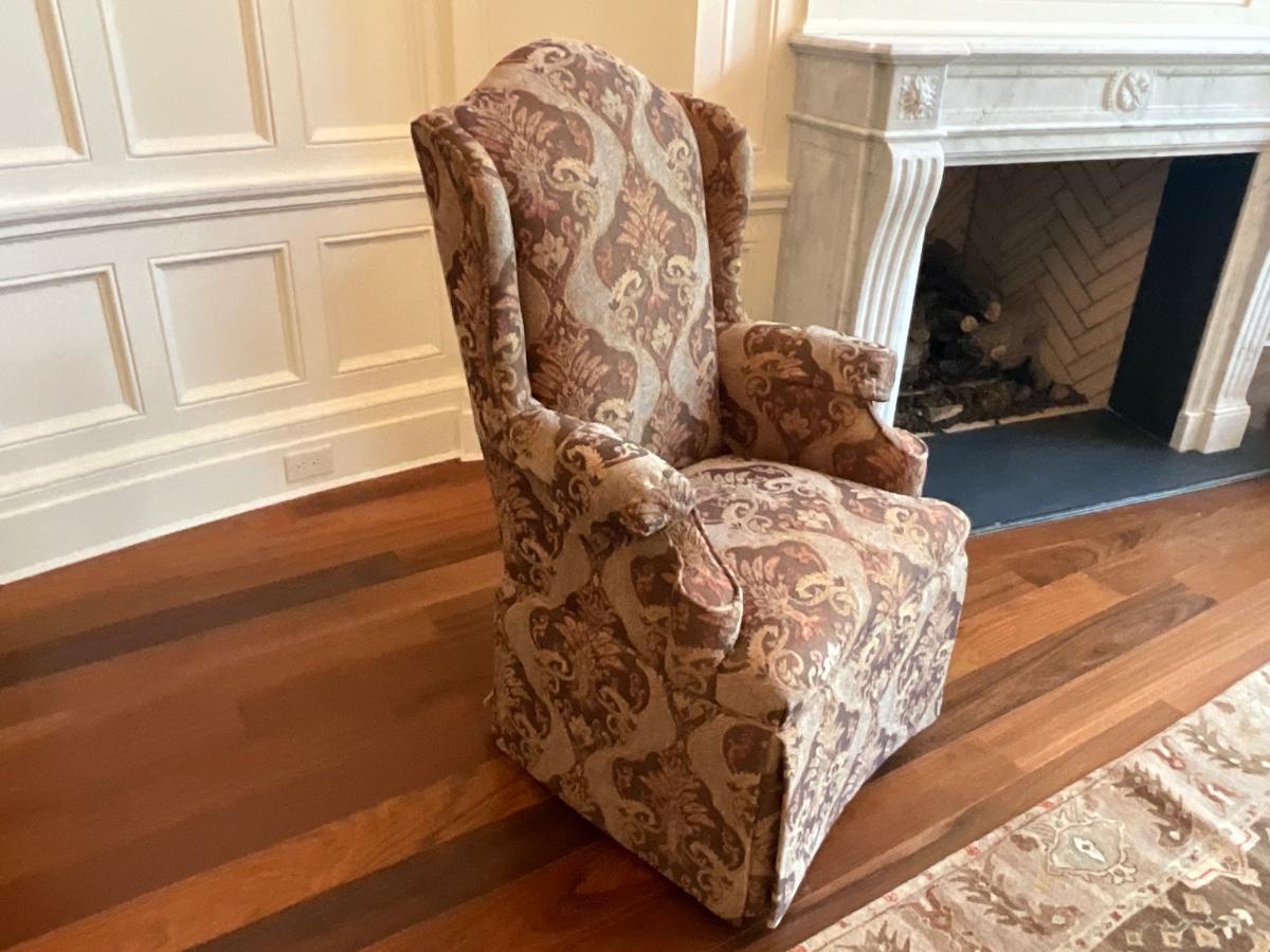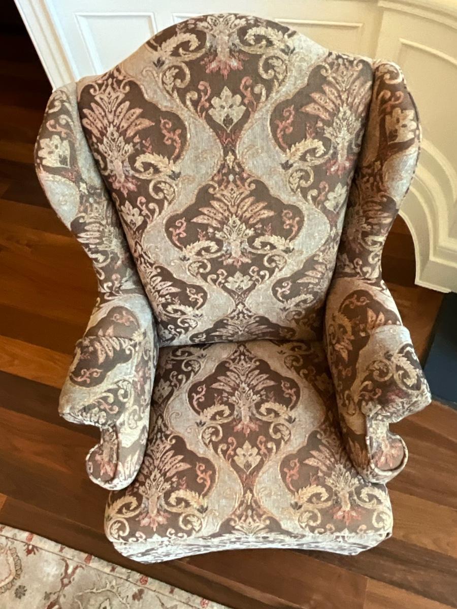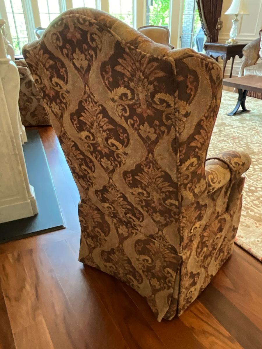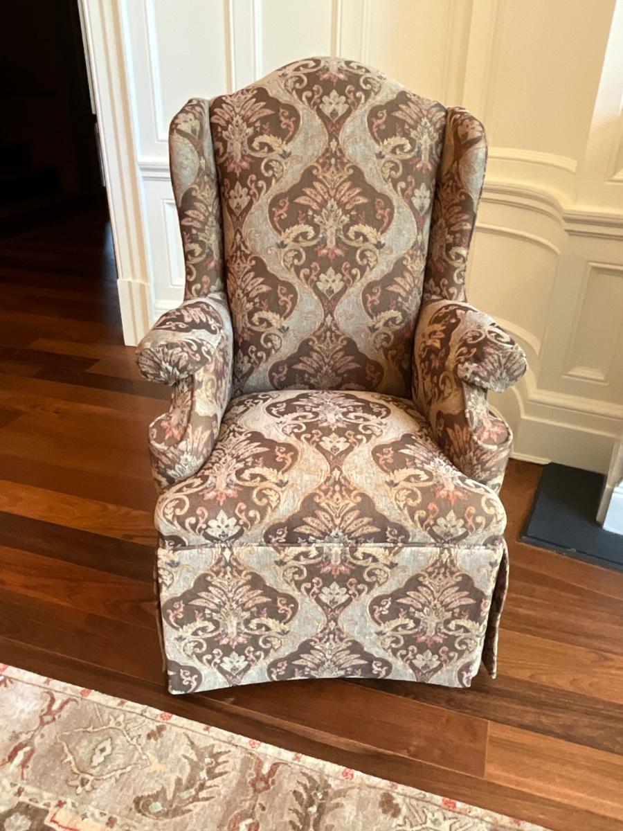Pair of Southwood wing back accent chairs. They are 25 inches deep, 46 inches tall, 29 inches wide. Seat depth is 17 inches, seat width is 17 inches, and it’s 19 inches from the floor to the seat.