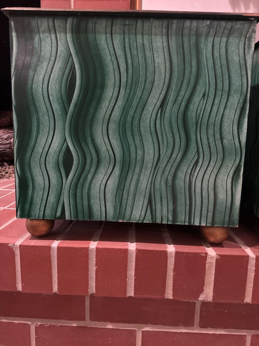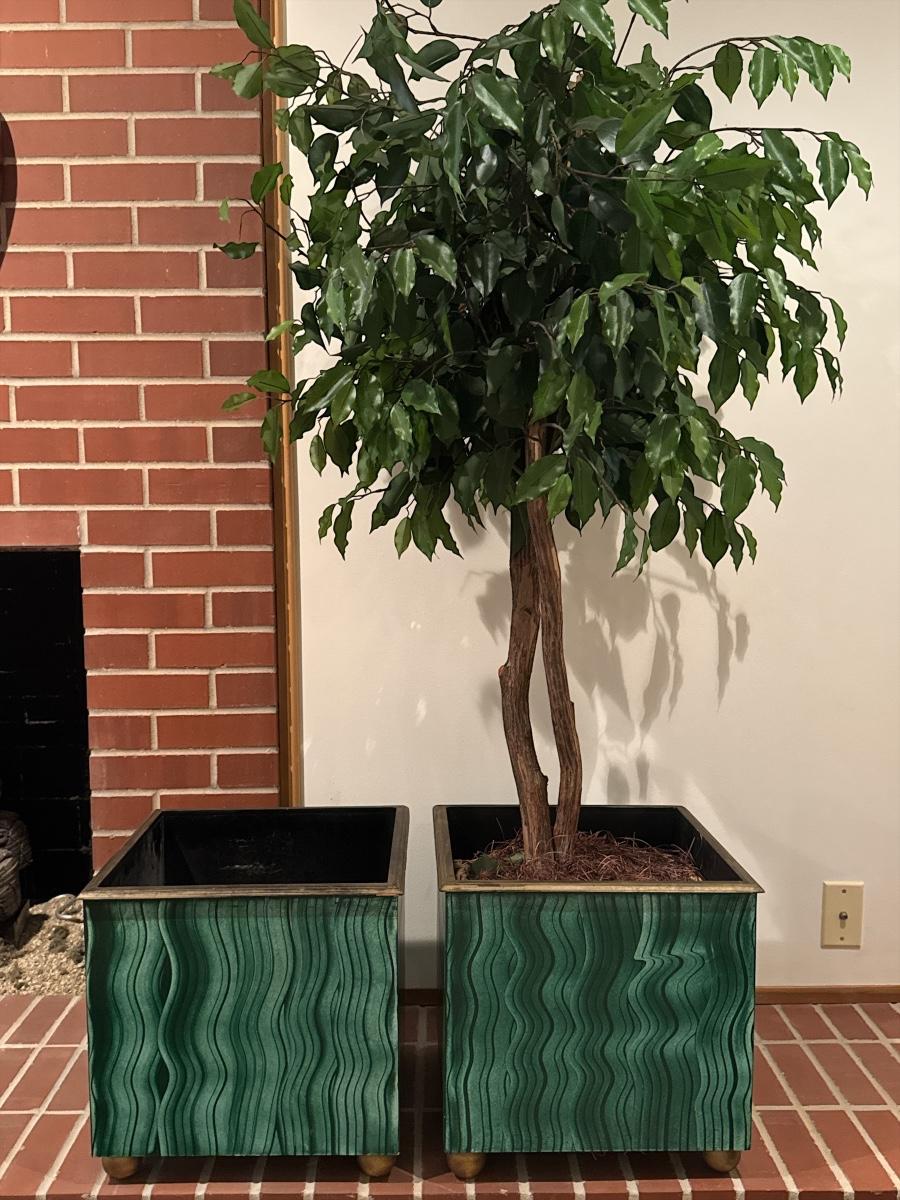 Approximately 15 1/2” x 15 1/2” square metal planters with faux ficus plant.