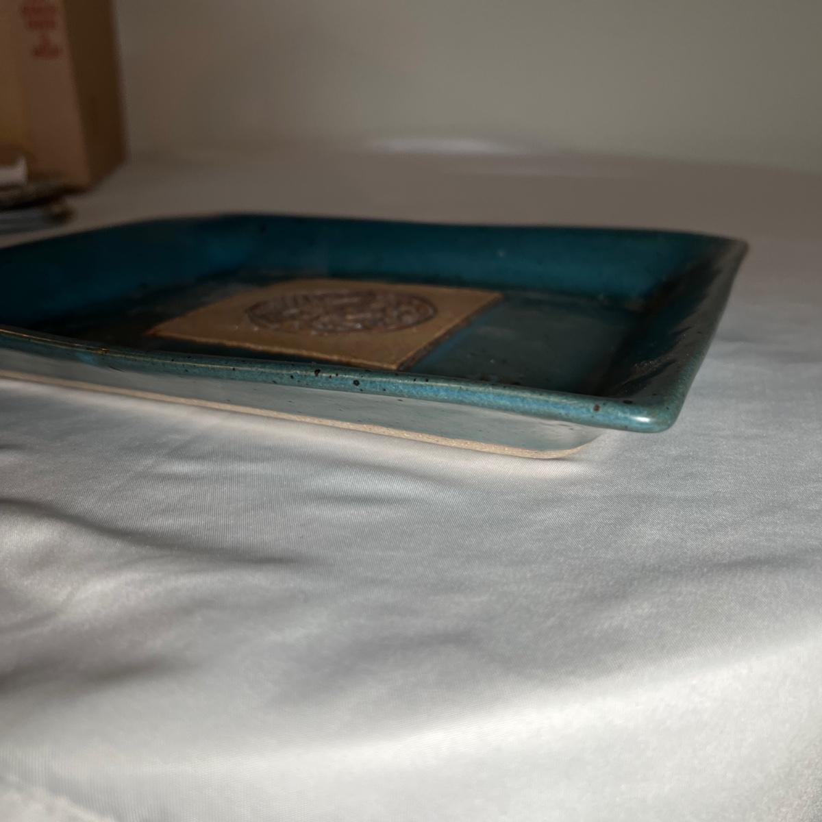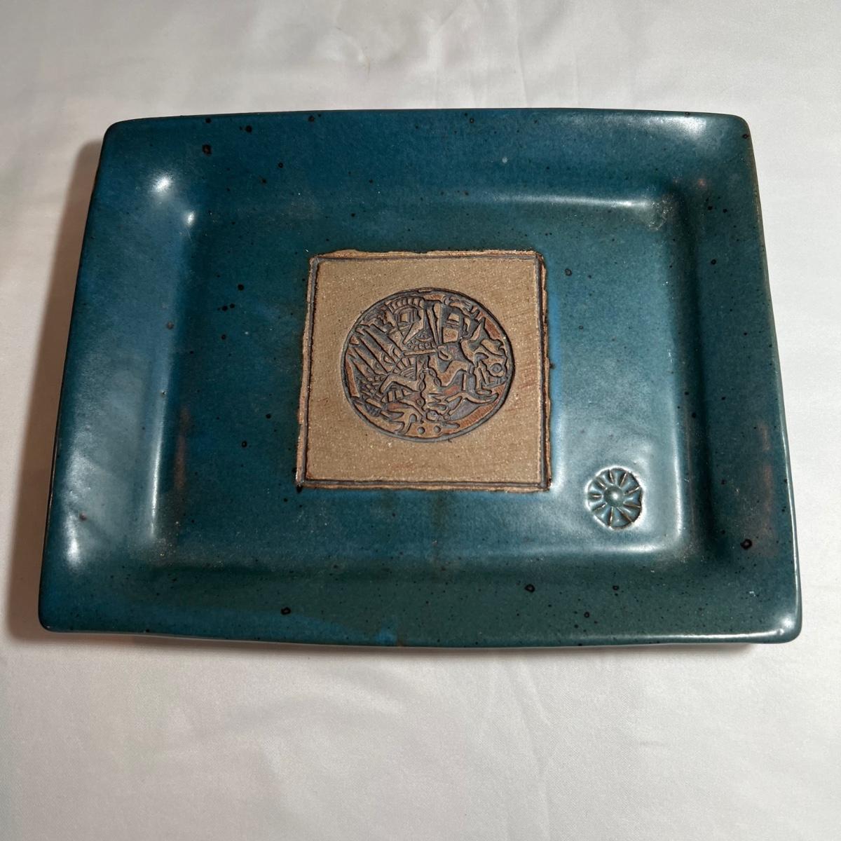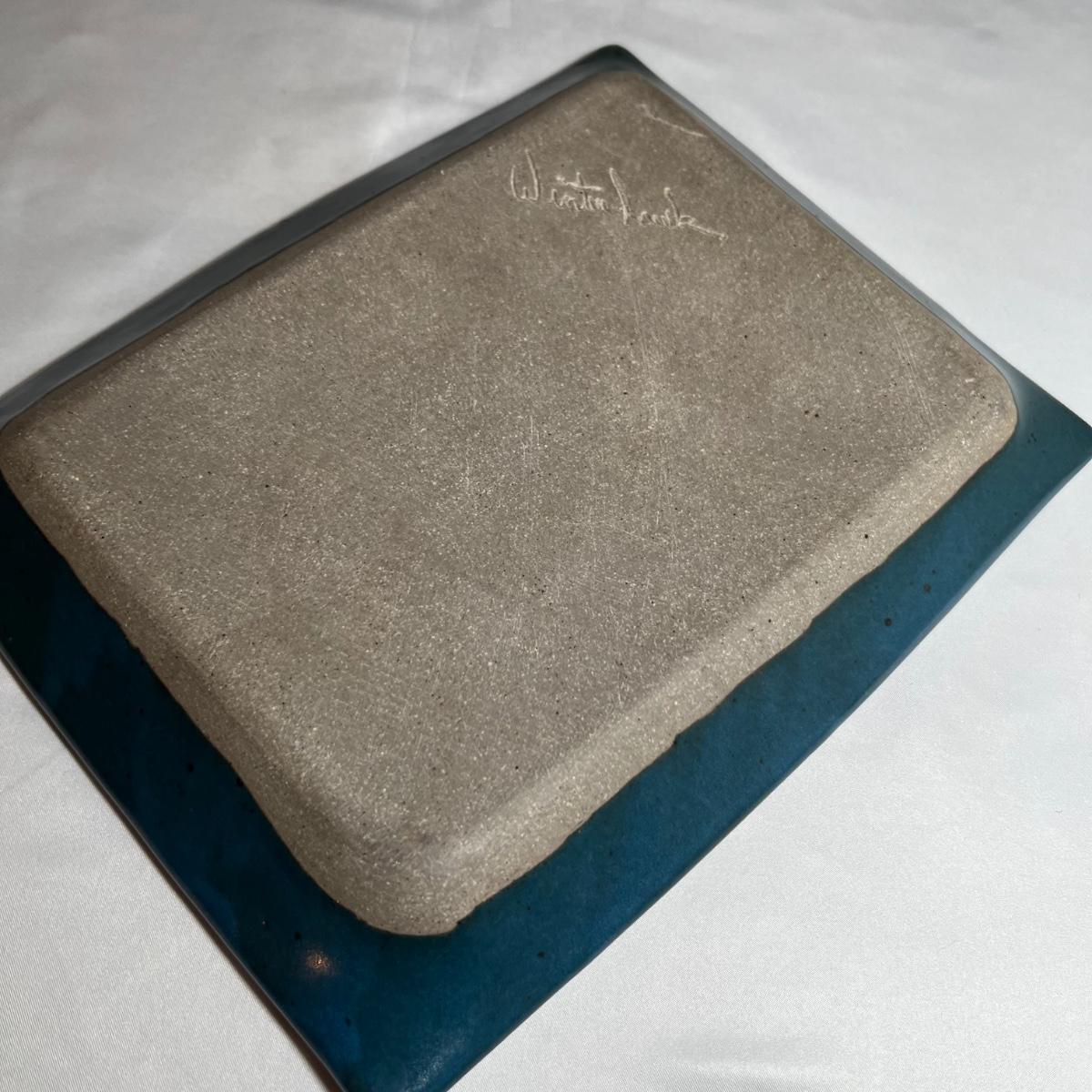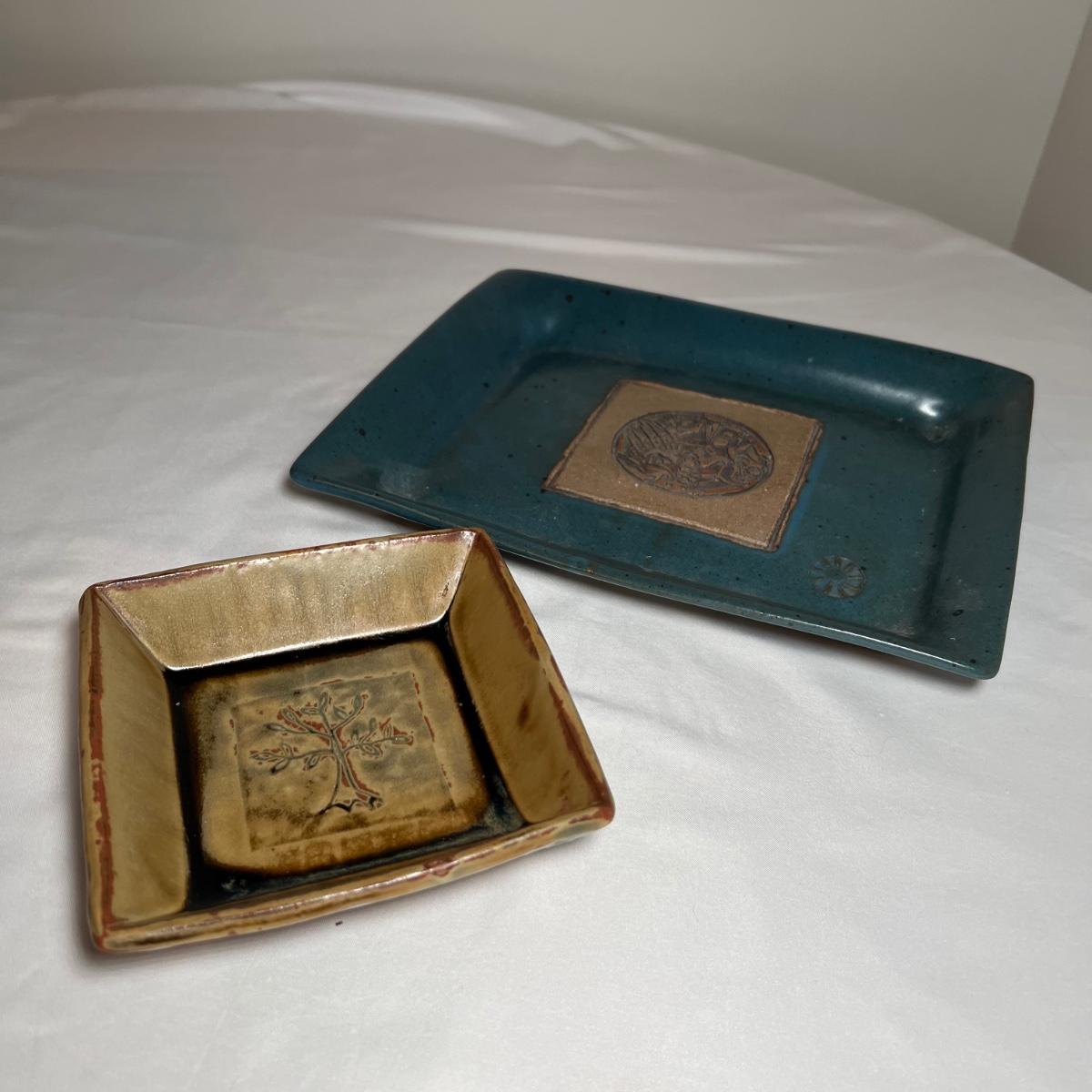 A pair of hand made pottery dishes here that includes a small square dish with a tree design that has the makers stamp on its base and a pretty blue larger dish that has a unique stamped middle section which the potter has kept unglazed to show off the incredible detail. The base of this piece is signed with what appears to say Winter Hawk. It measures 8” x 10”. Both are in very good condition with no chips, cracks or crazing.