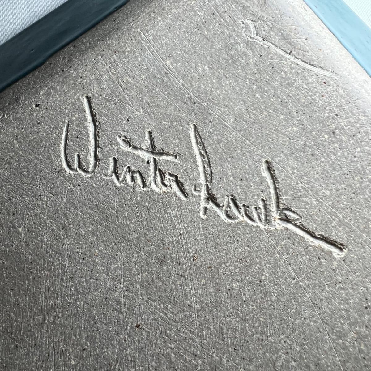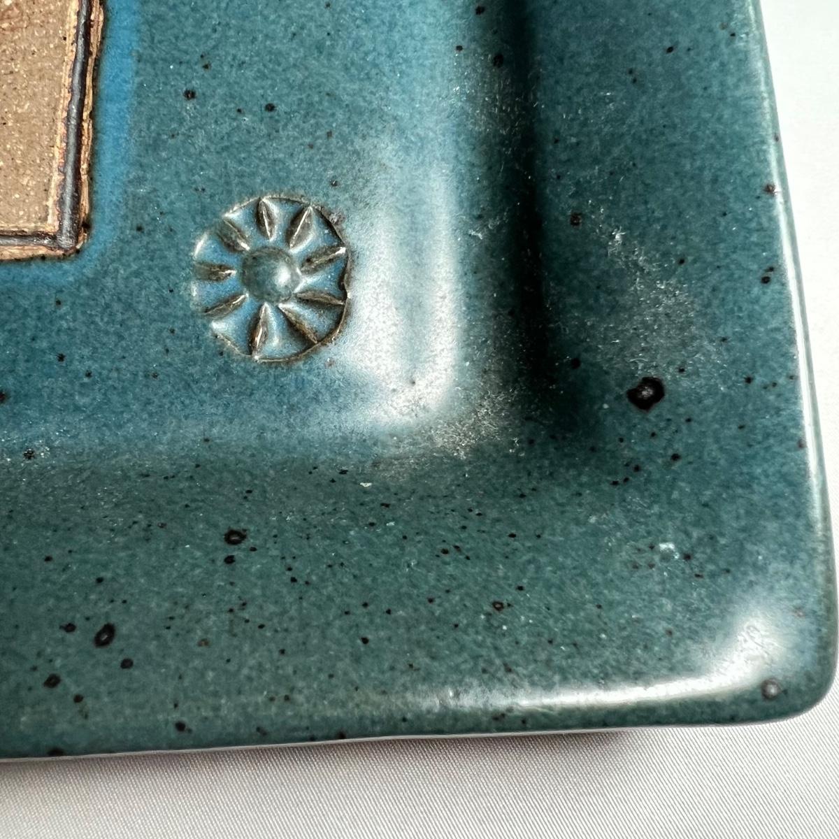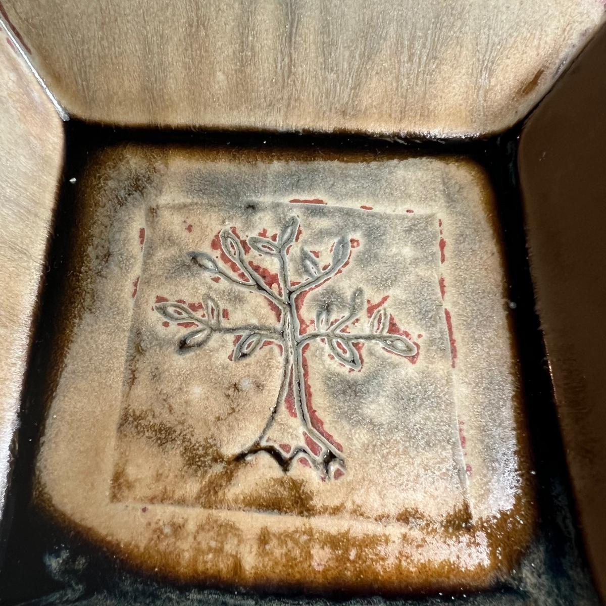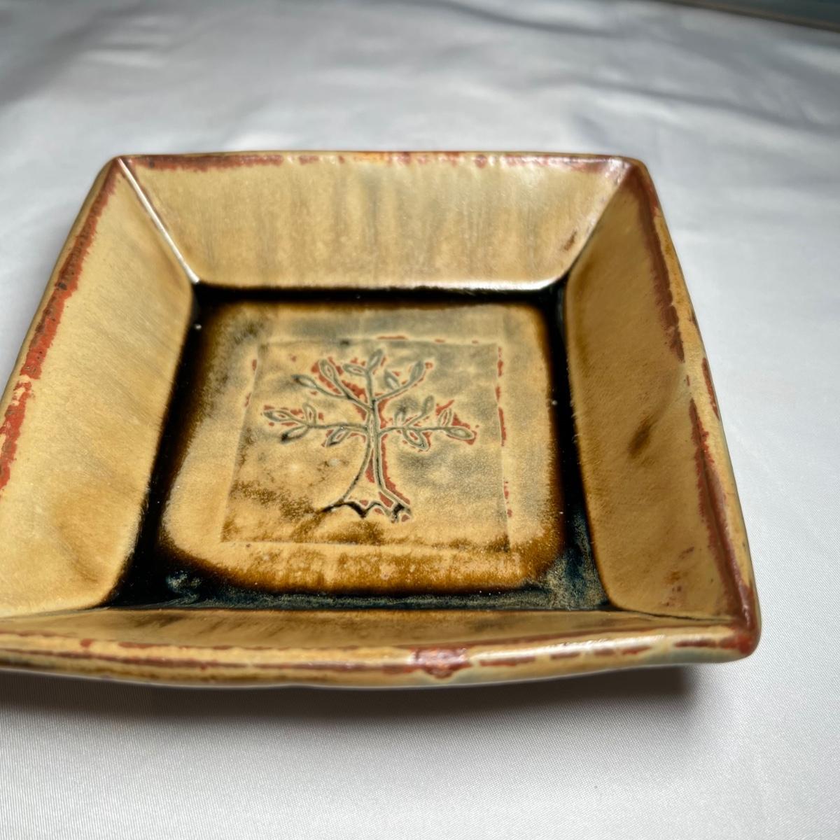 A pair of hand made pottery dishes here that includes a small square dish with a tree design that has the makers stamp on its base and a pretty blue larger dish that has a unique stamped middle section which the potter has kept unglazed to show off the incredible detail. The base of this piece is signed with what appears to say Winter Hawk. It measures 8” x 10”. Both are in very good condition with no chips, cracks or crazing.