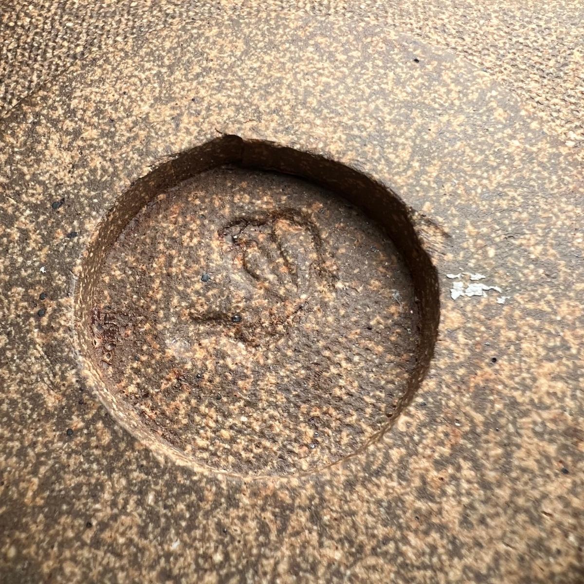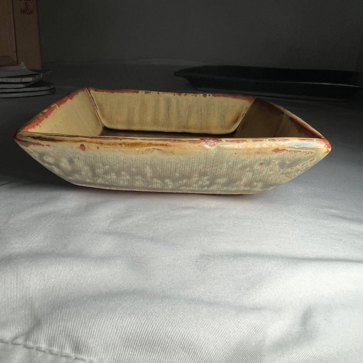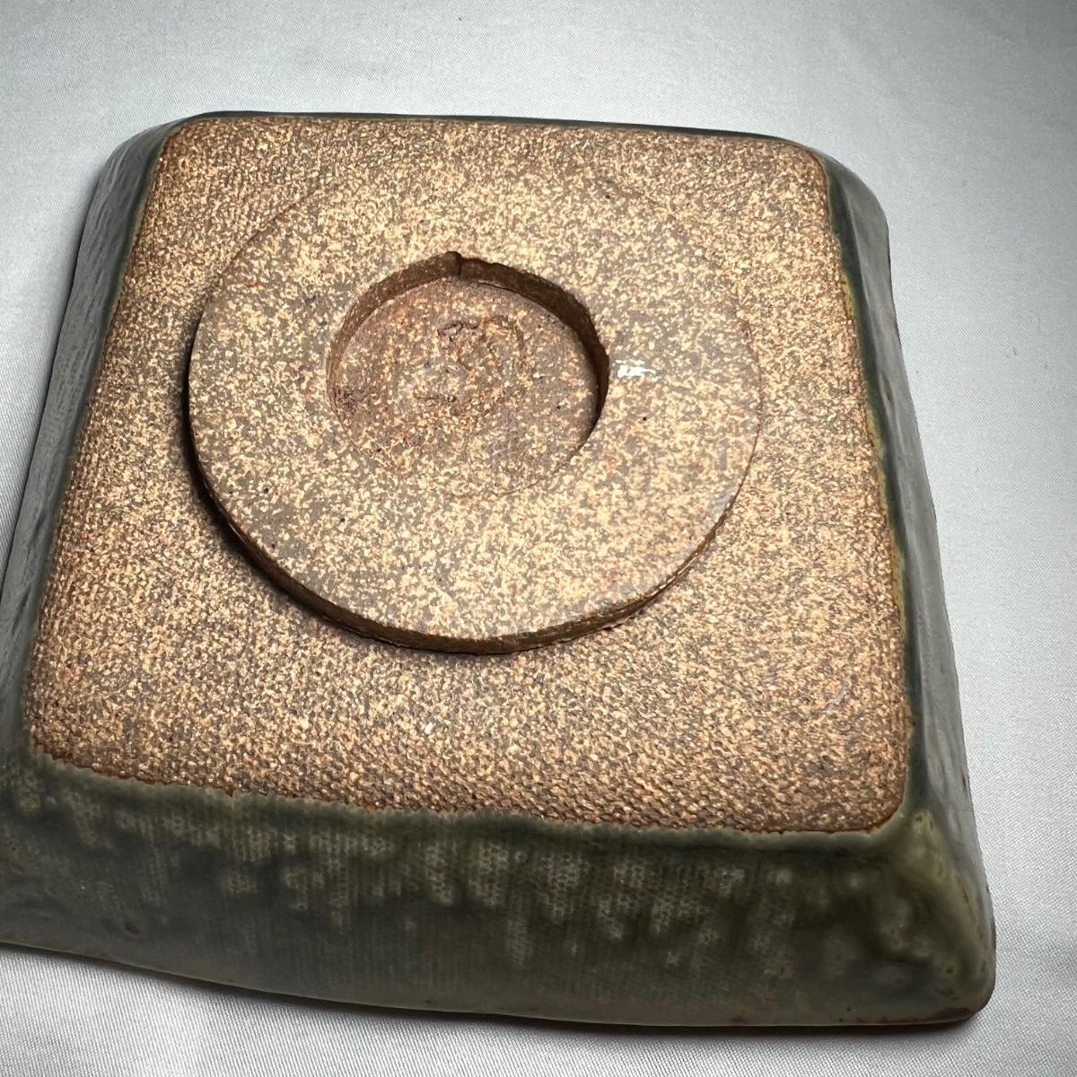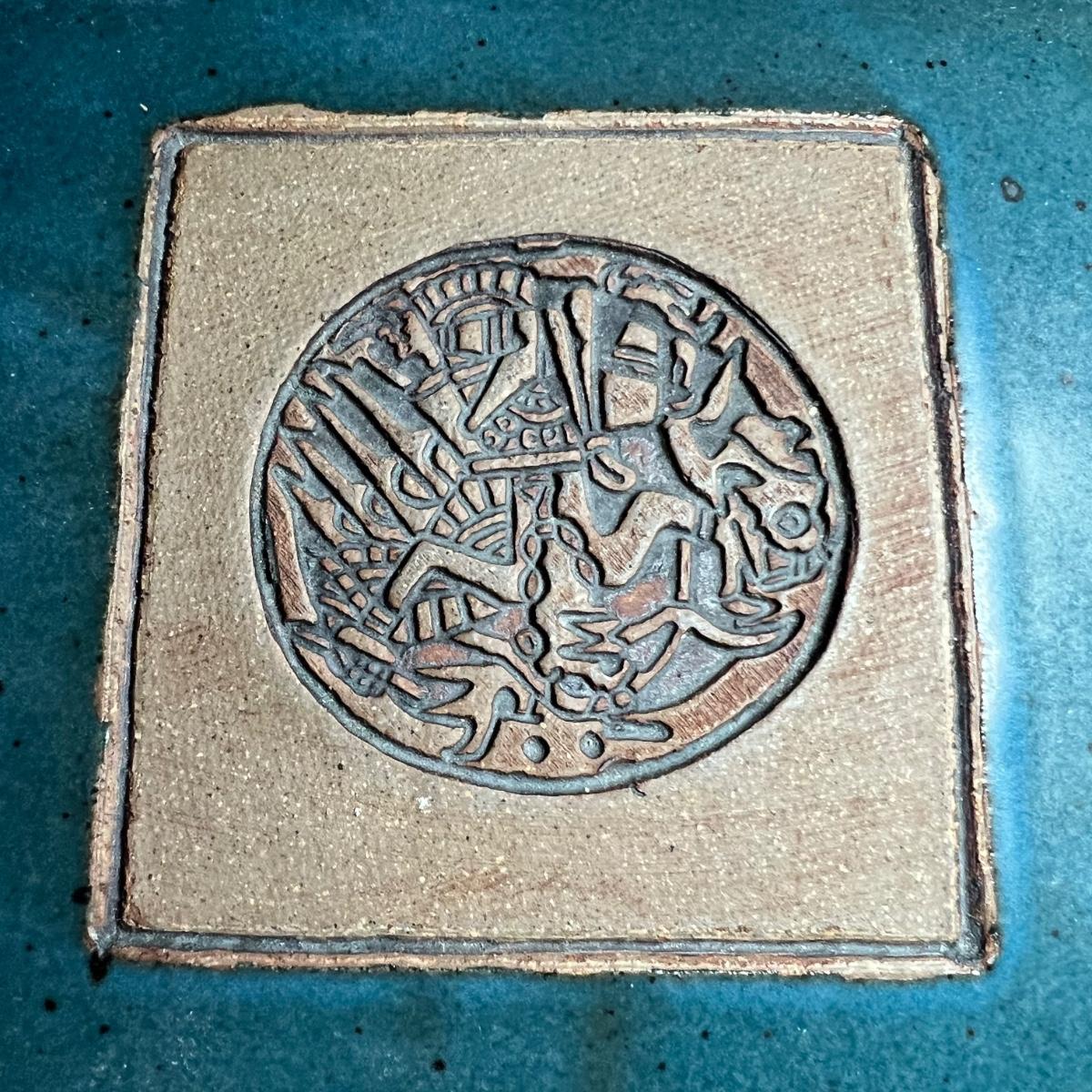 A pair of hand made pottery dishes here that includes a small square dish with a tree design that has the makers stamp on its base and a pretty blue larger dish that has a unique stamped middle section which the potter has kept unglazed to show off the incredible detail. The base of this piece is signed with what appears to say Winter Hawk. It measures 8” x 10”. Both are in very good condition with no chips, cracks or crazing.