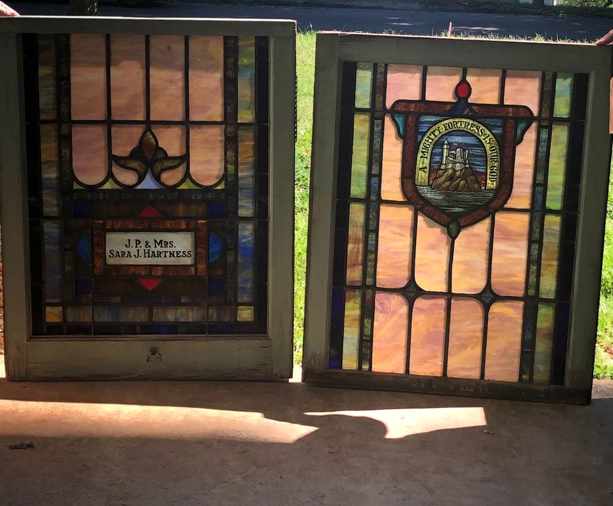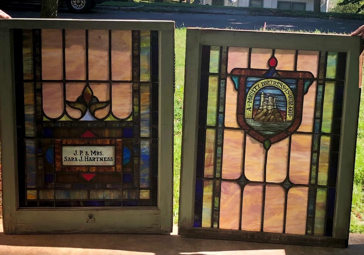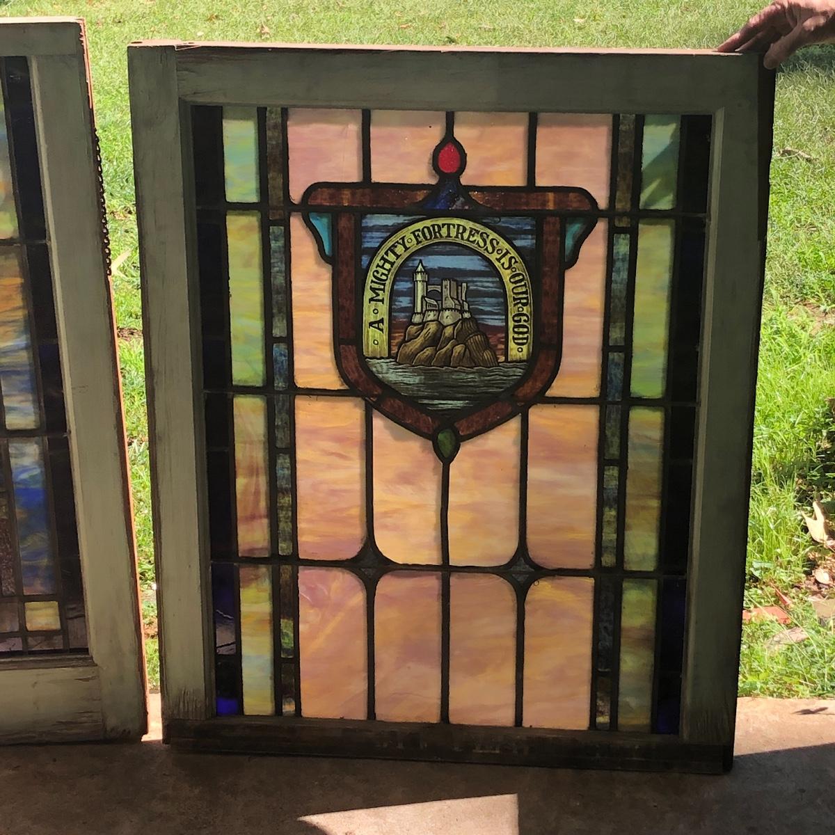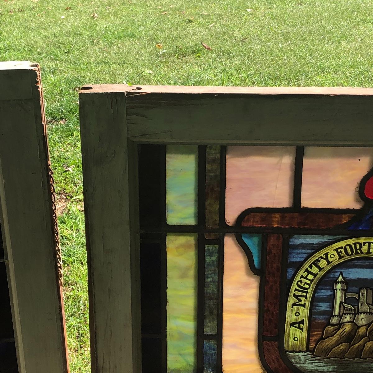 Beautiful stained glass windows that we are told are from a church. This is lot 1 of 10. One window would have been the bottom the other the top but these didn’t necessarily go together originally. Some glazing is missing on the backs and the window hardware is missing on one window. The Mighty Fortress piece has a small 4” crack that runs vertically in one of the top sections, see images.