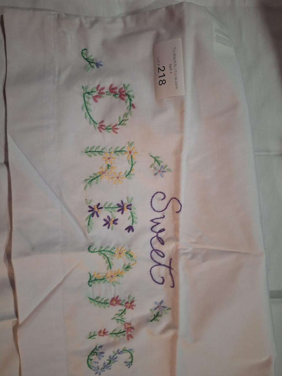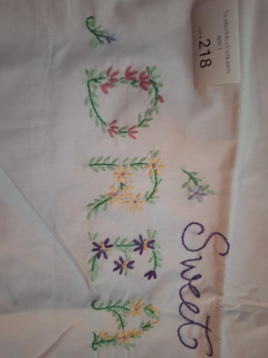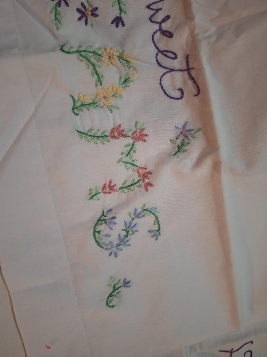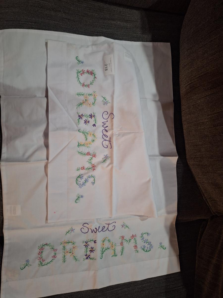 pair of stamped embroidery pillowcases with a "Sweet Dreams" floral design.