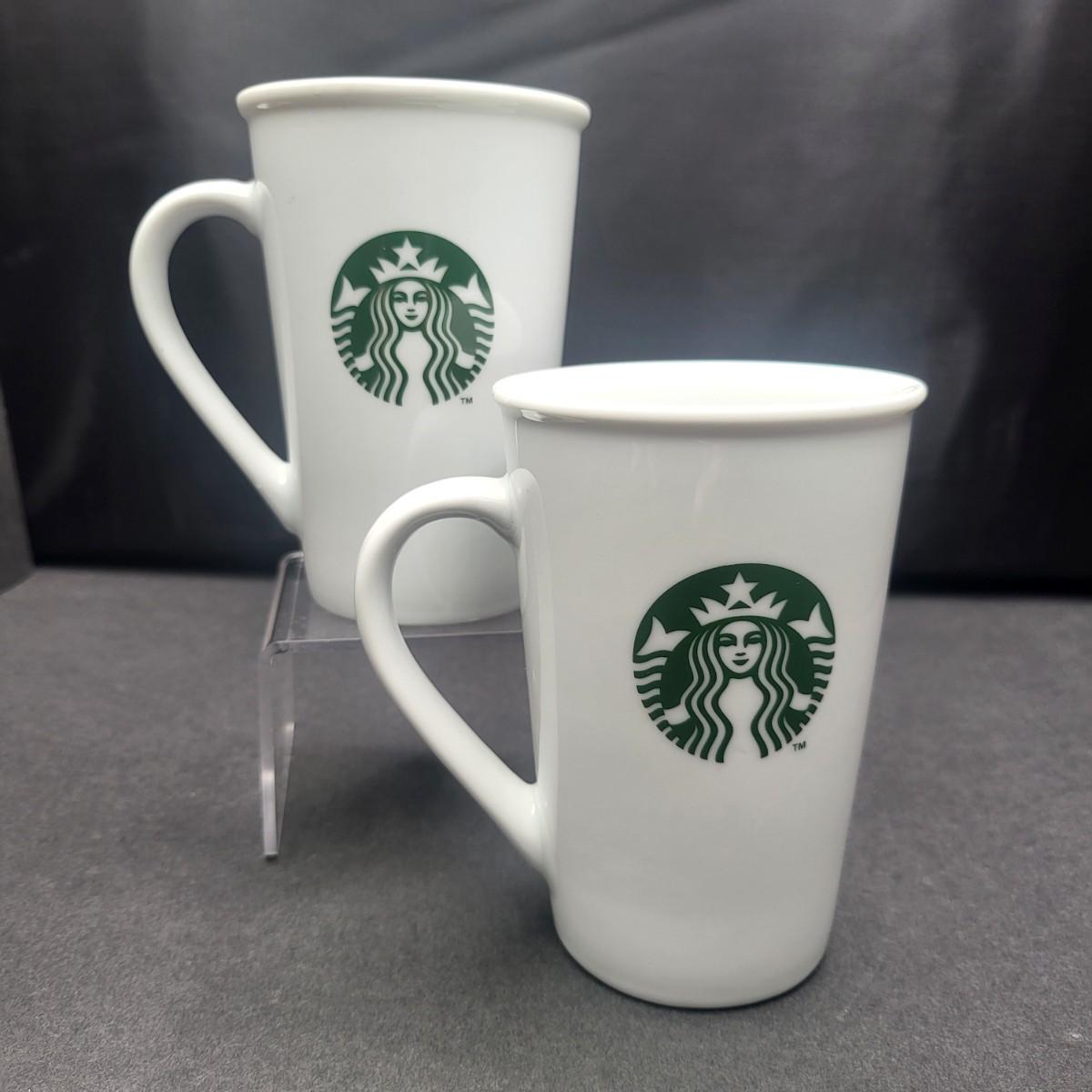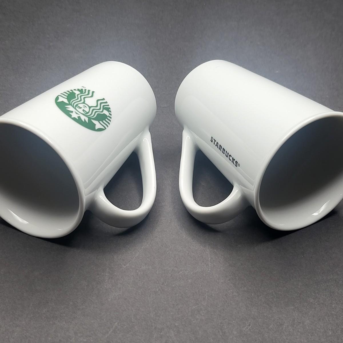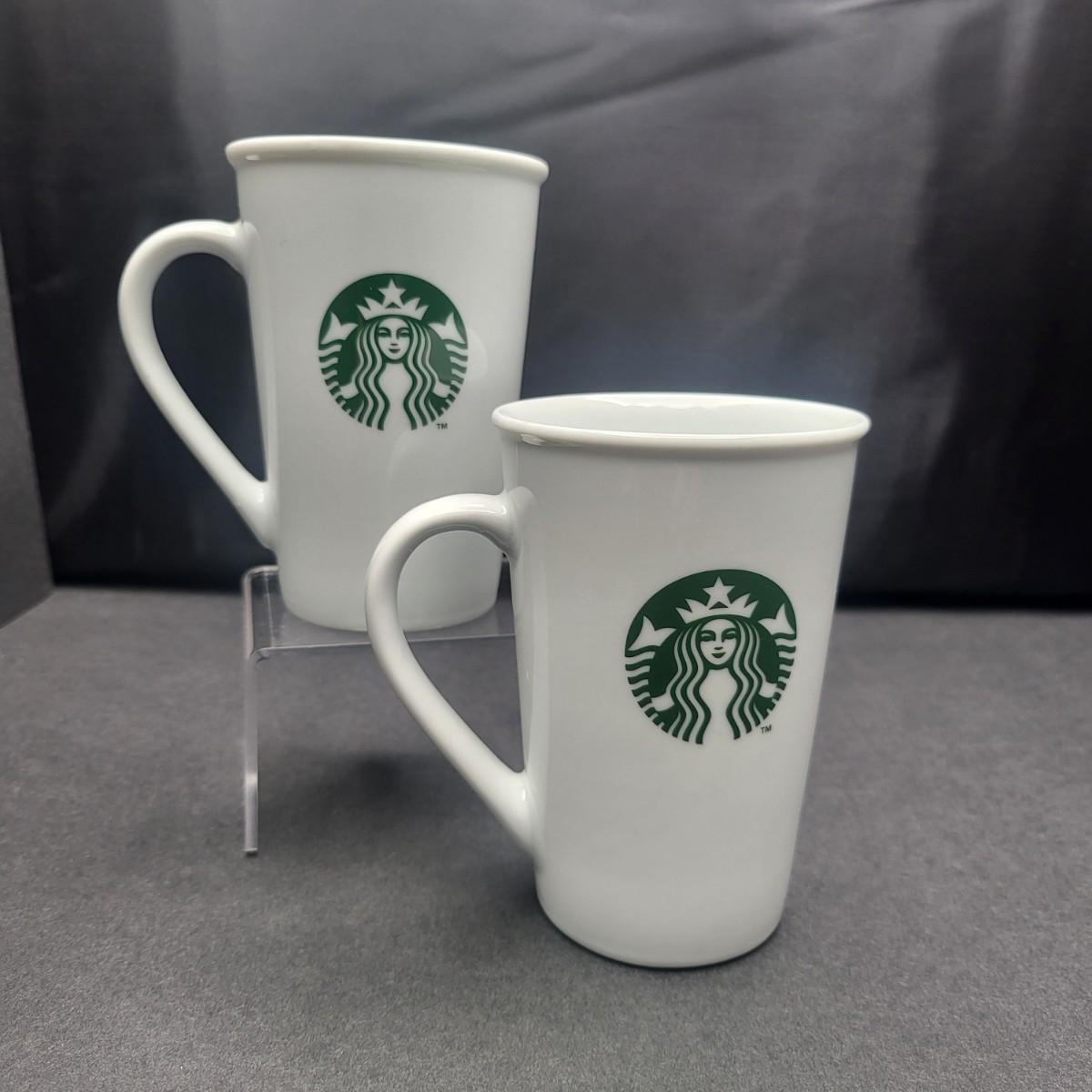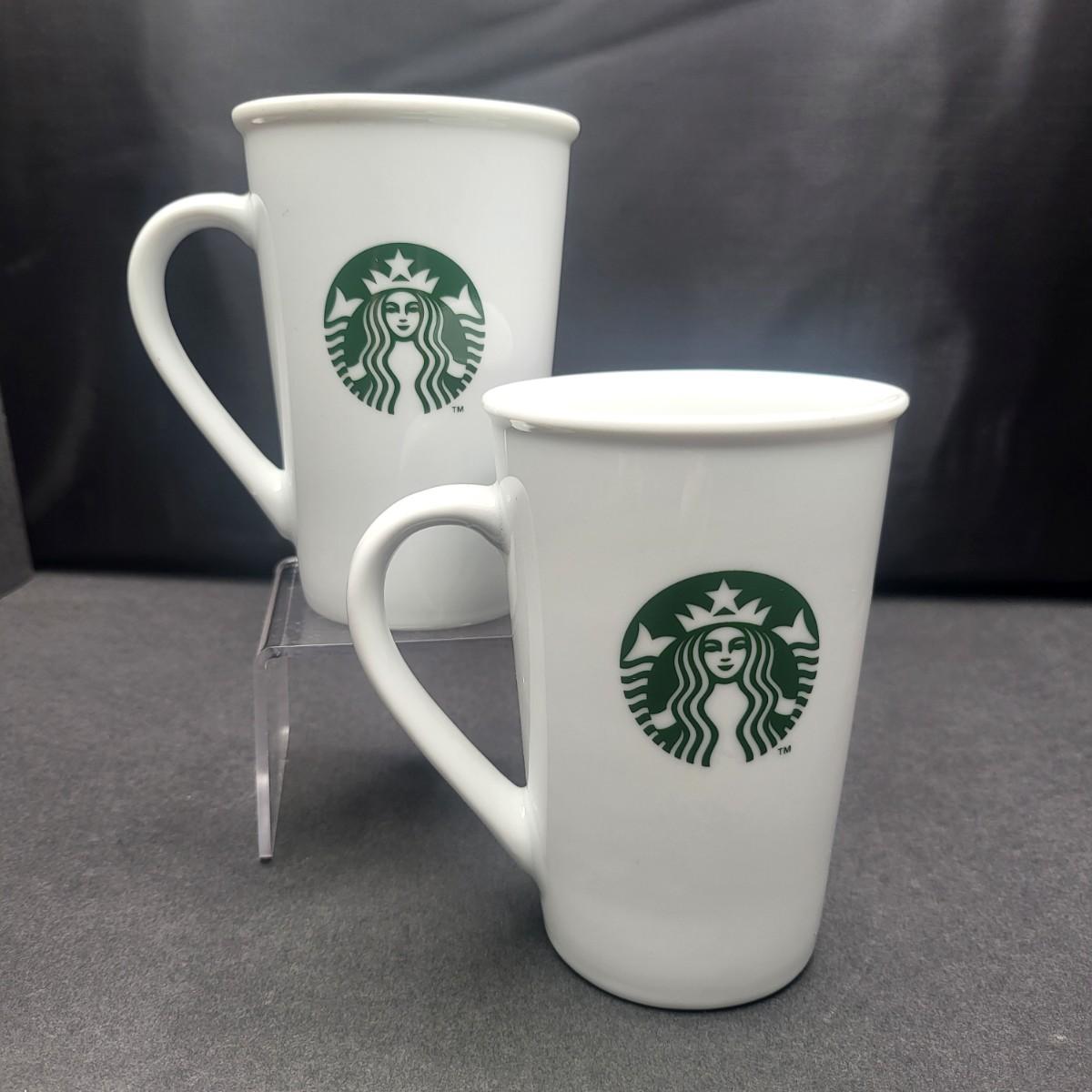 Pair of 4" T x 3" W white ceramic with green maiden logo graphics, Starbucks mugs. Holds 12oz.