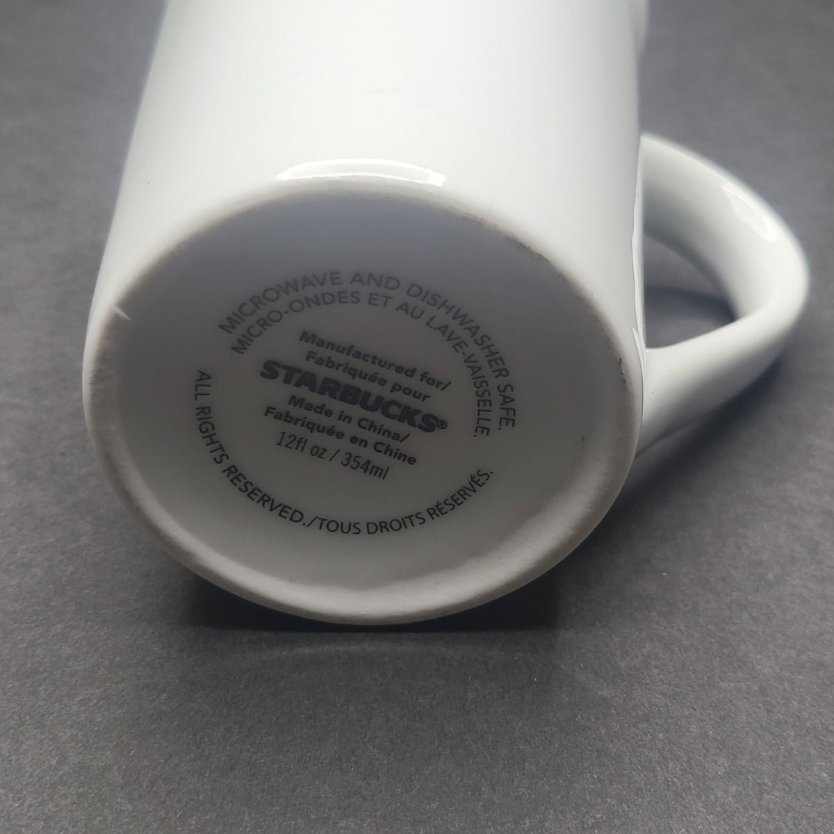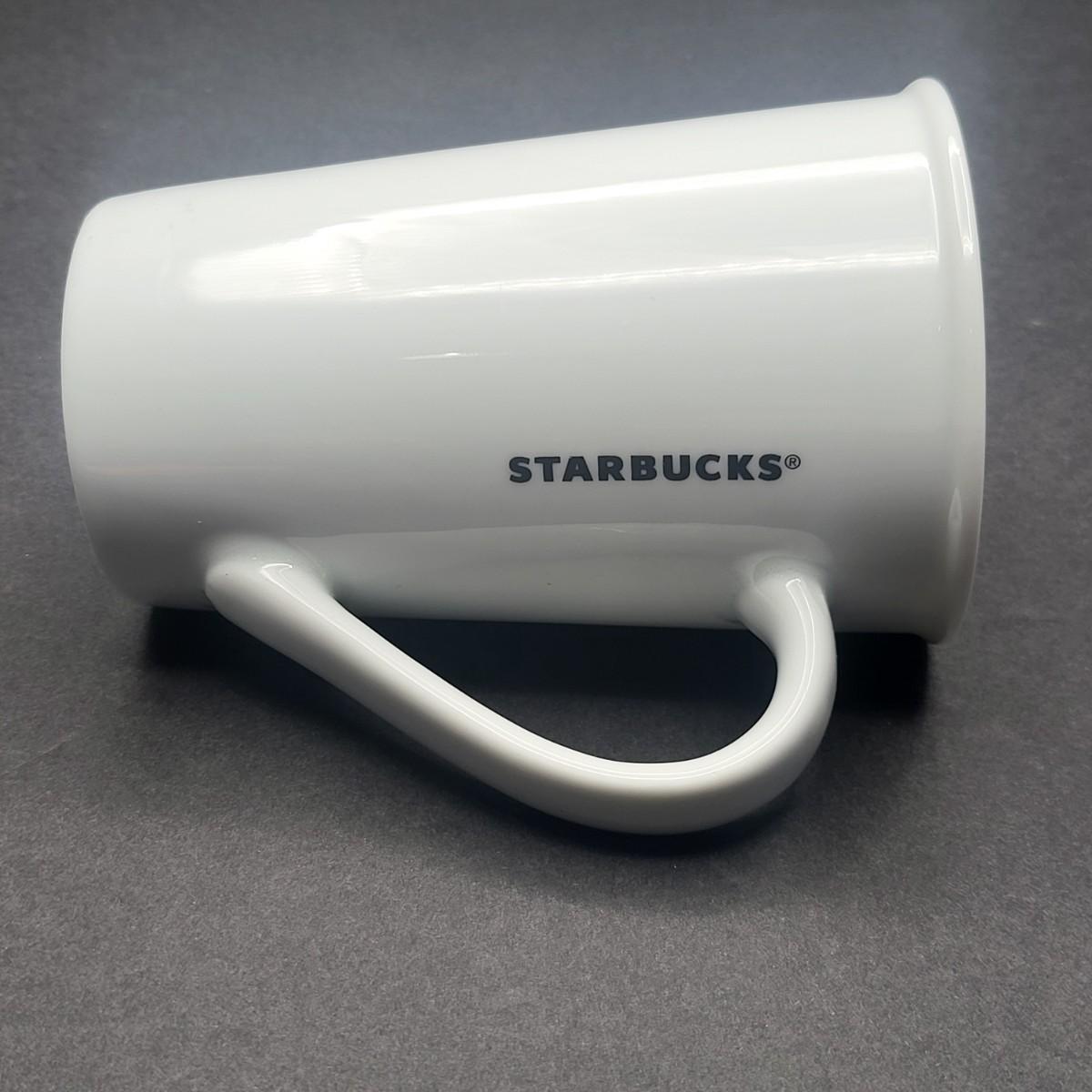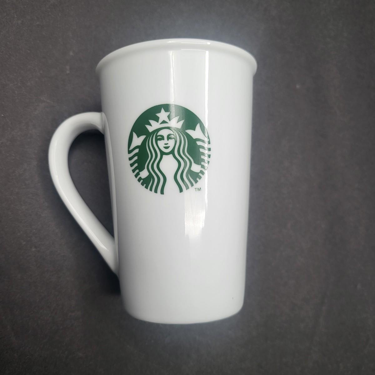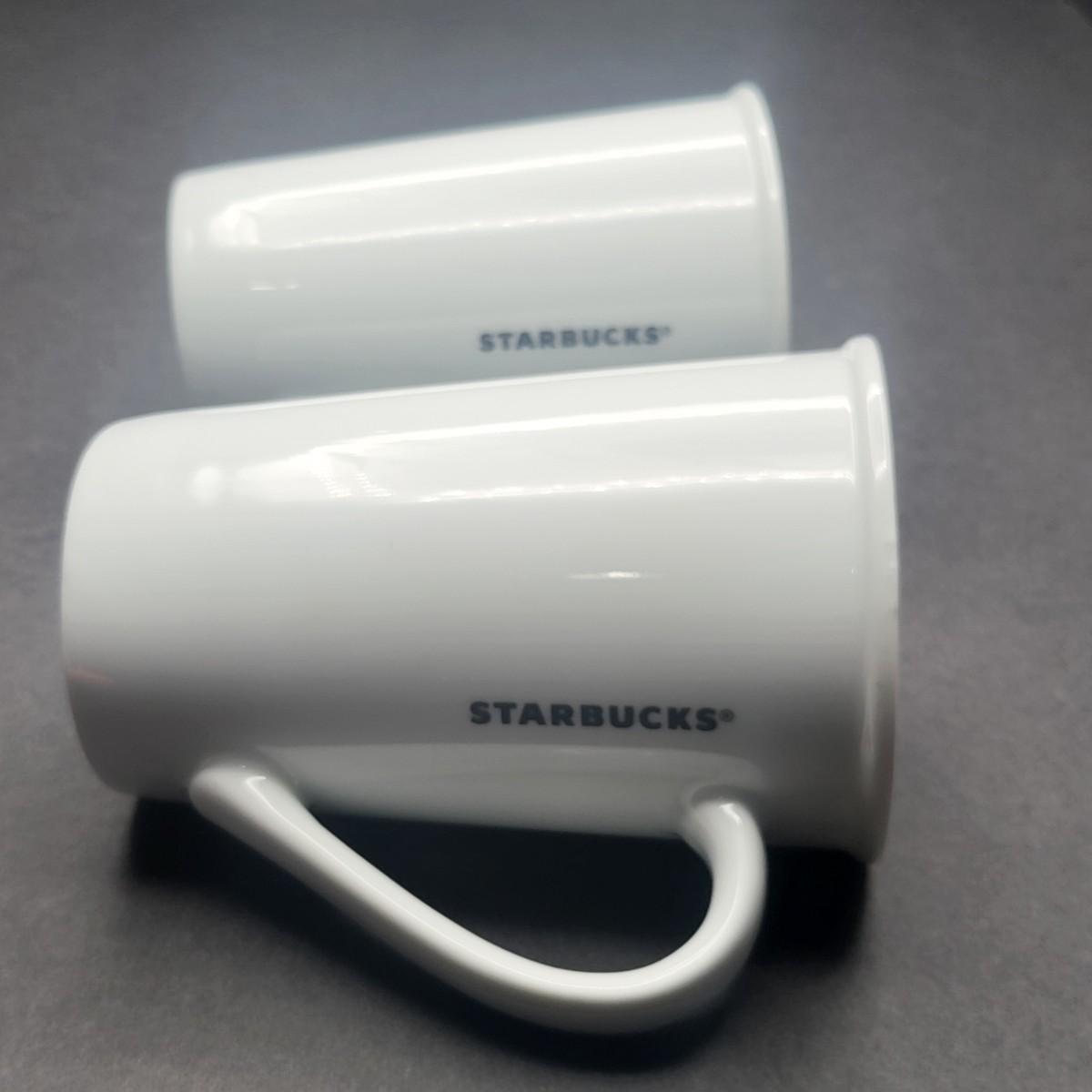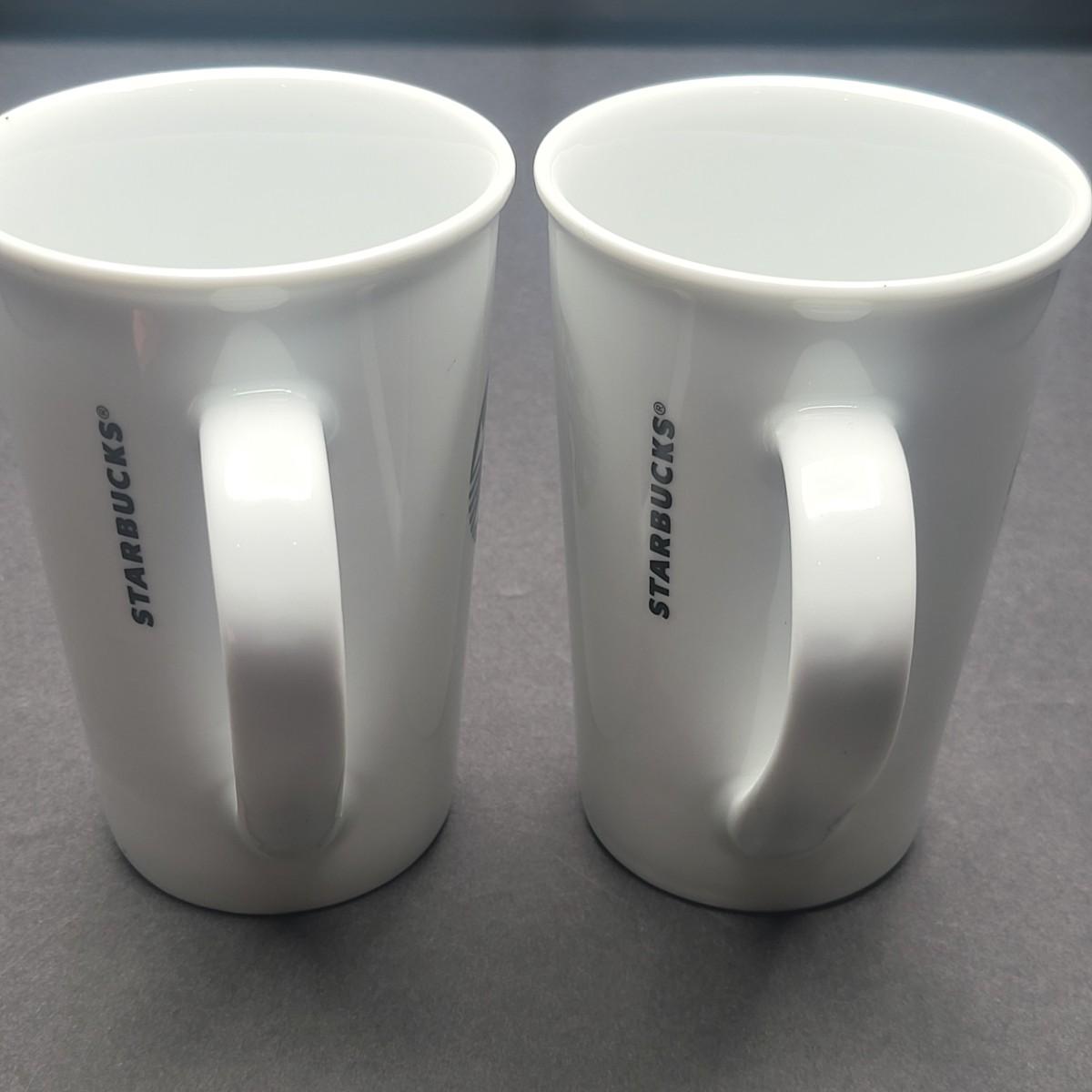 Pair of 4" T x 3" W white ceramic with green maiden logo graphics, Starbucks mugs. Holds 12oz.