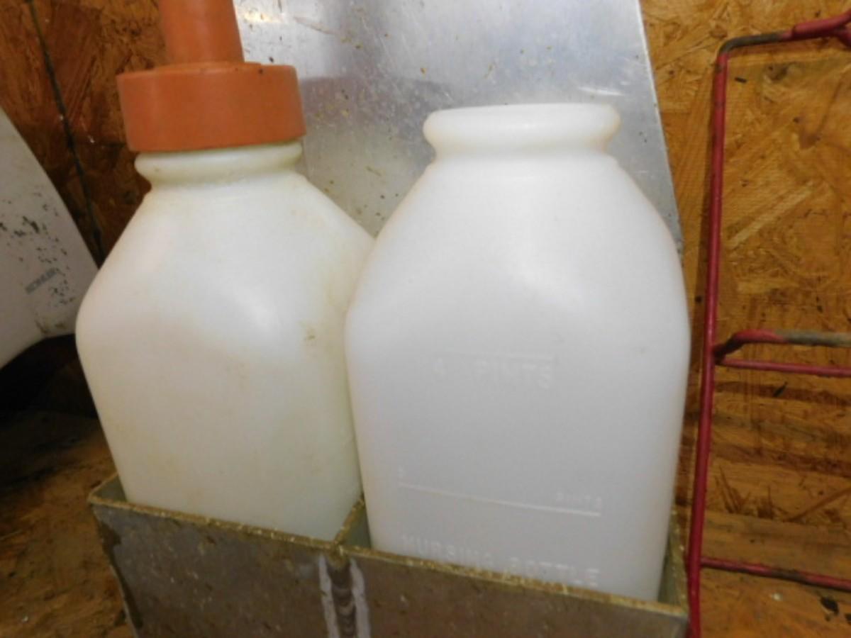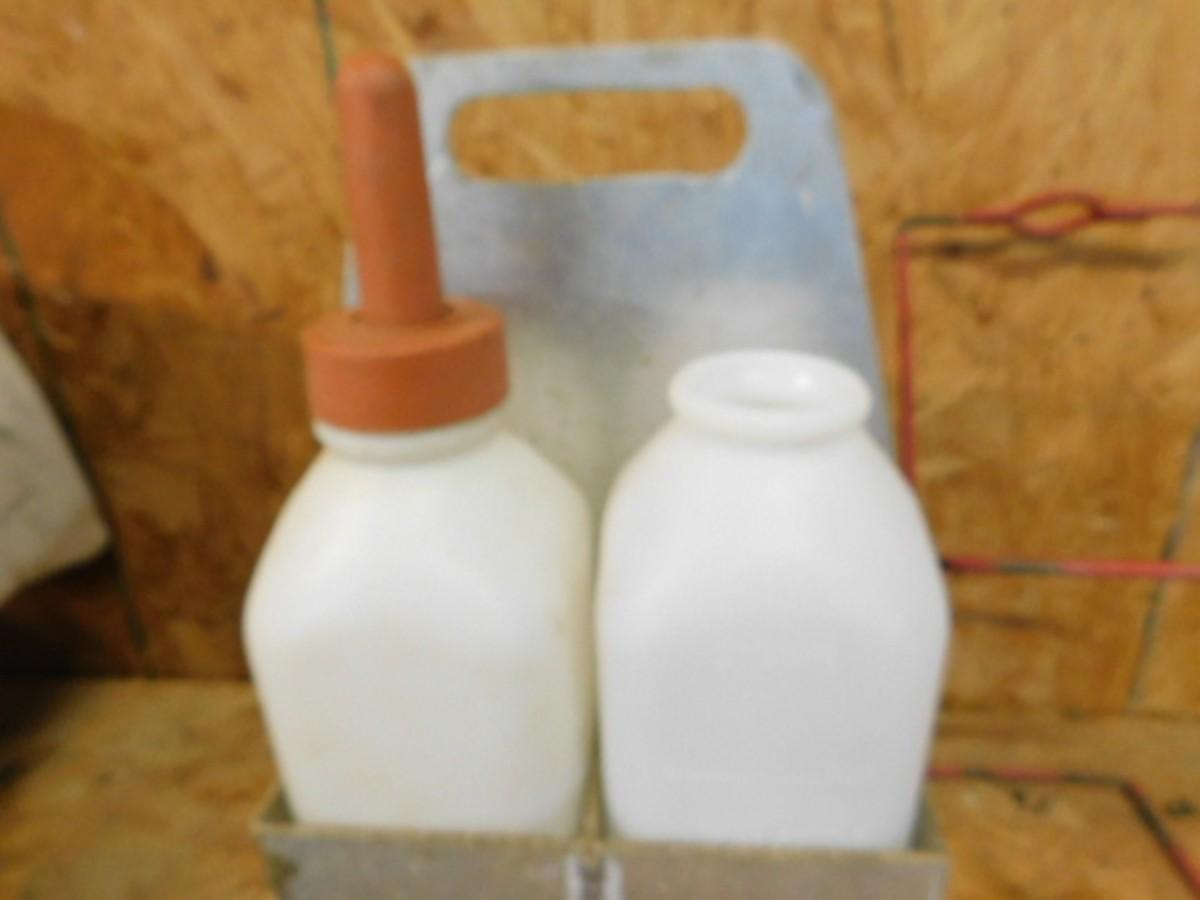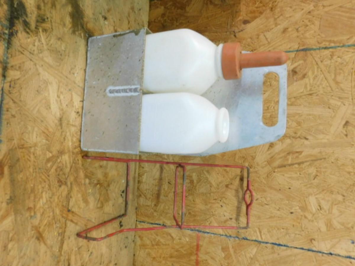 Pair of Steel Caddies and Plastic Livestock Feeding Bottles includes Bottle Stands (See all pictures) 7 bottles, two caddies, two bottle stands, and one rubber nipple