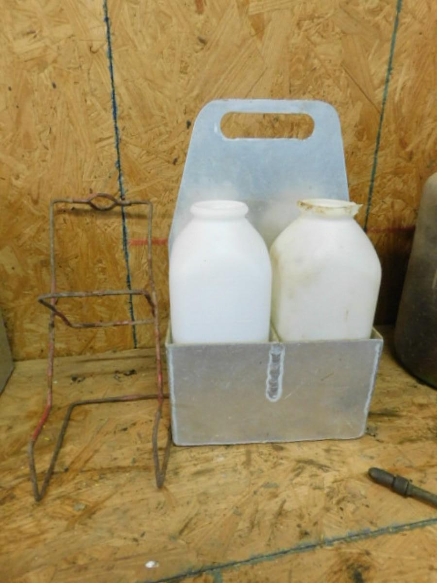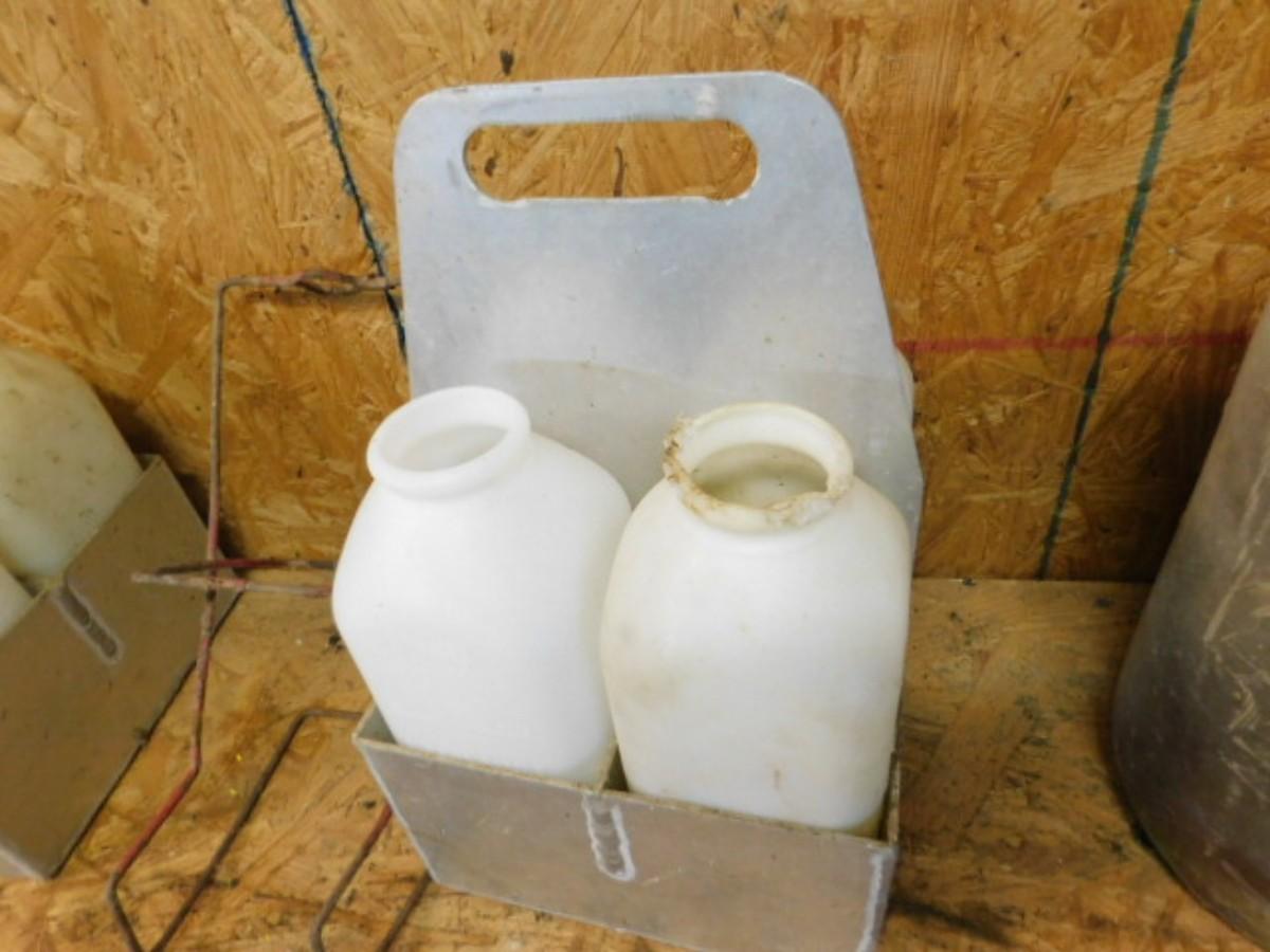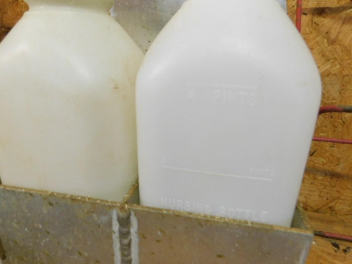 Pair of Steel Caddies and Plastic Livestock Feeding Bottles includes Bottle Stands (See all pictures) 7 bottles, two caddies, two bottle stands, and one rubber nipple