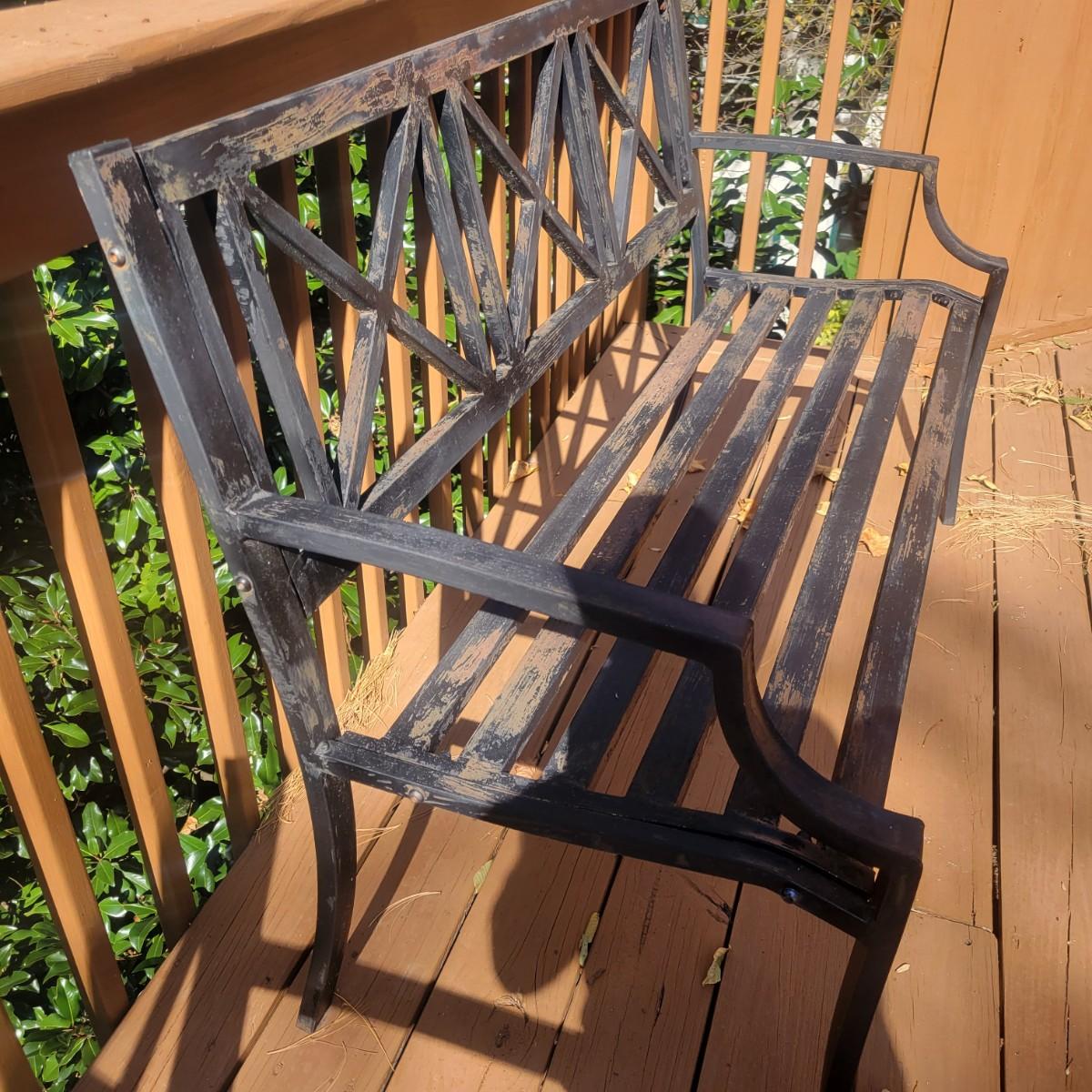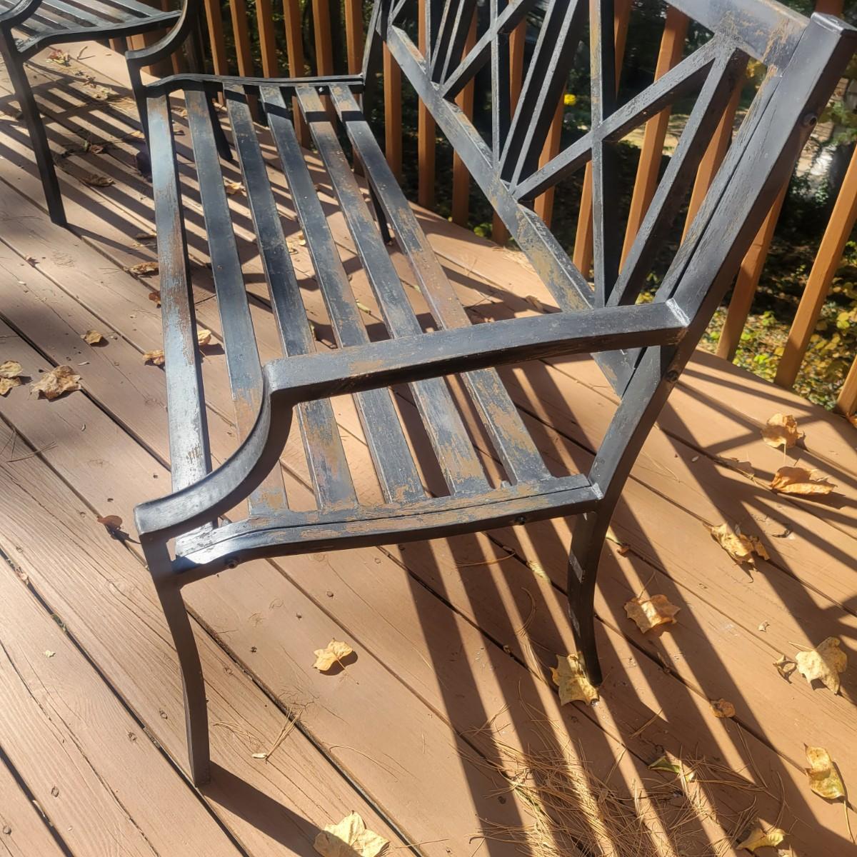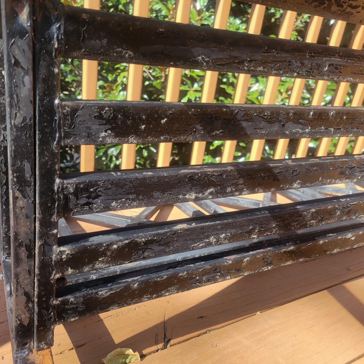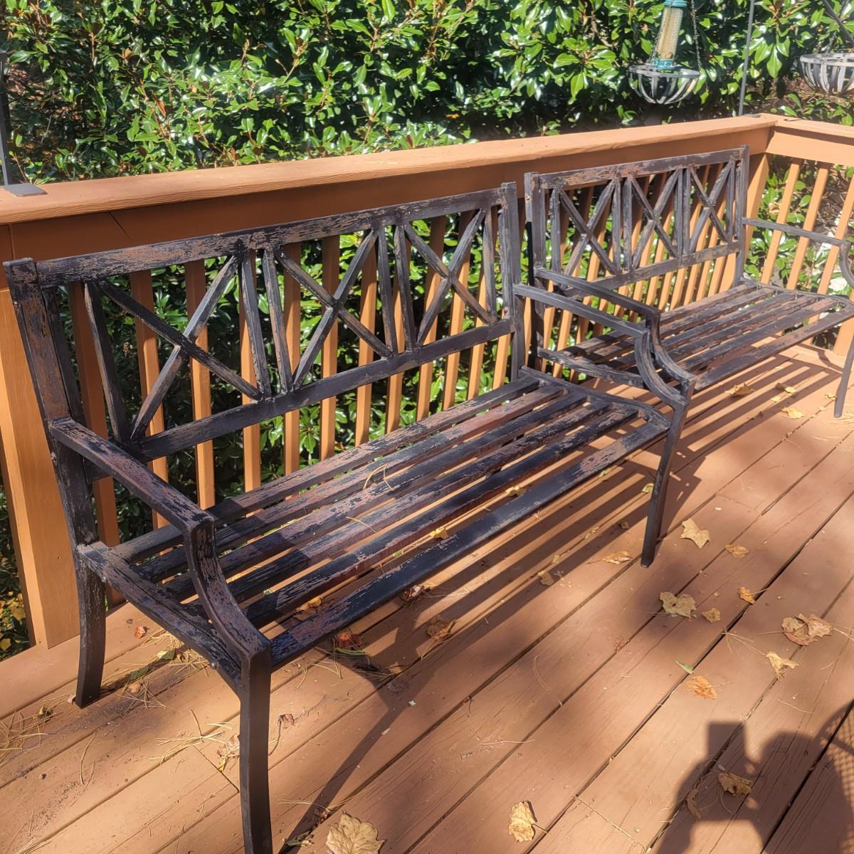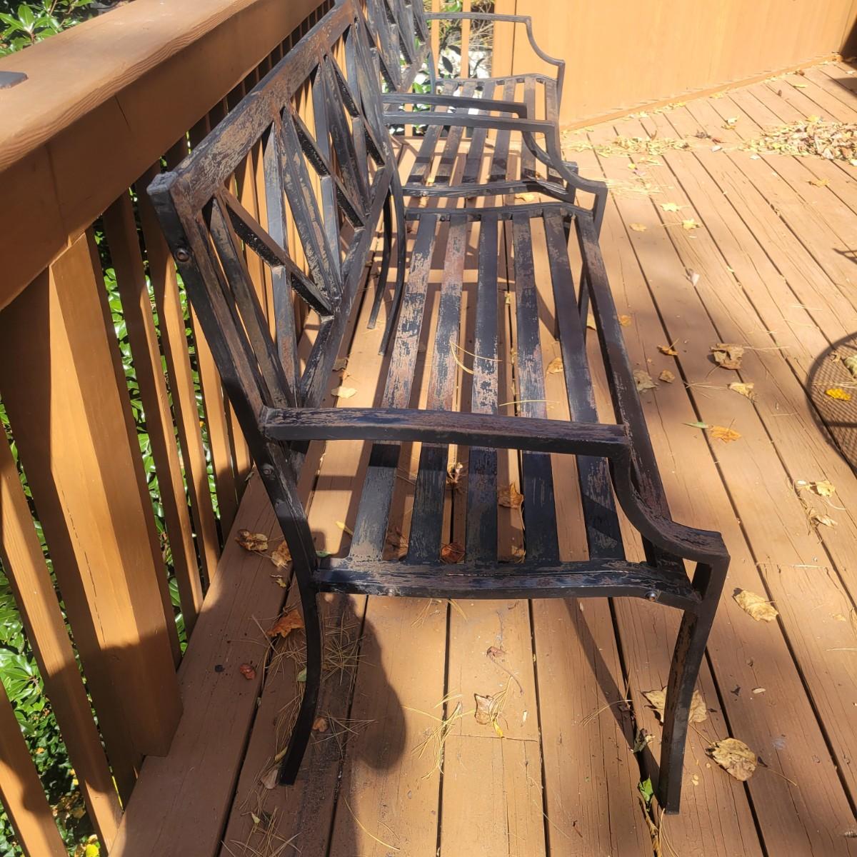 A pair of painted metal outdoor benches in good condition, but there is some rusting and the black paint is peeling in many areas. These benches are made of tube steel and are structurally sound. They could easily be sanded sealed and painted to bring them many years of life. Each bench measures approximately 50.5" x 21" x 34" with a seat height of 17". Winning bidder will need to bring assistance as these items are bulky. Local pickup only