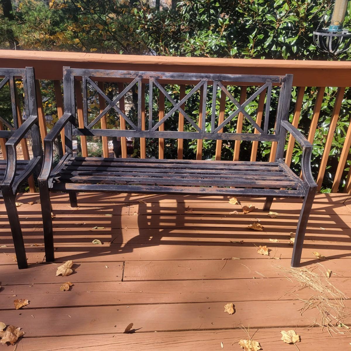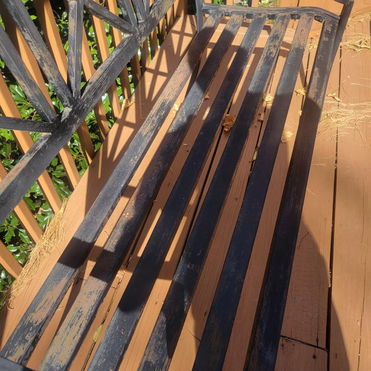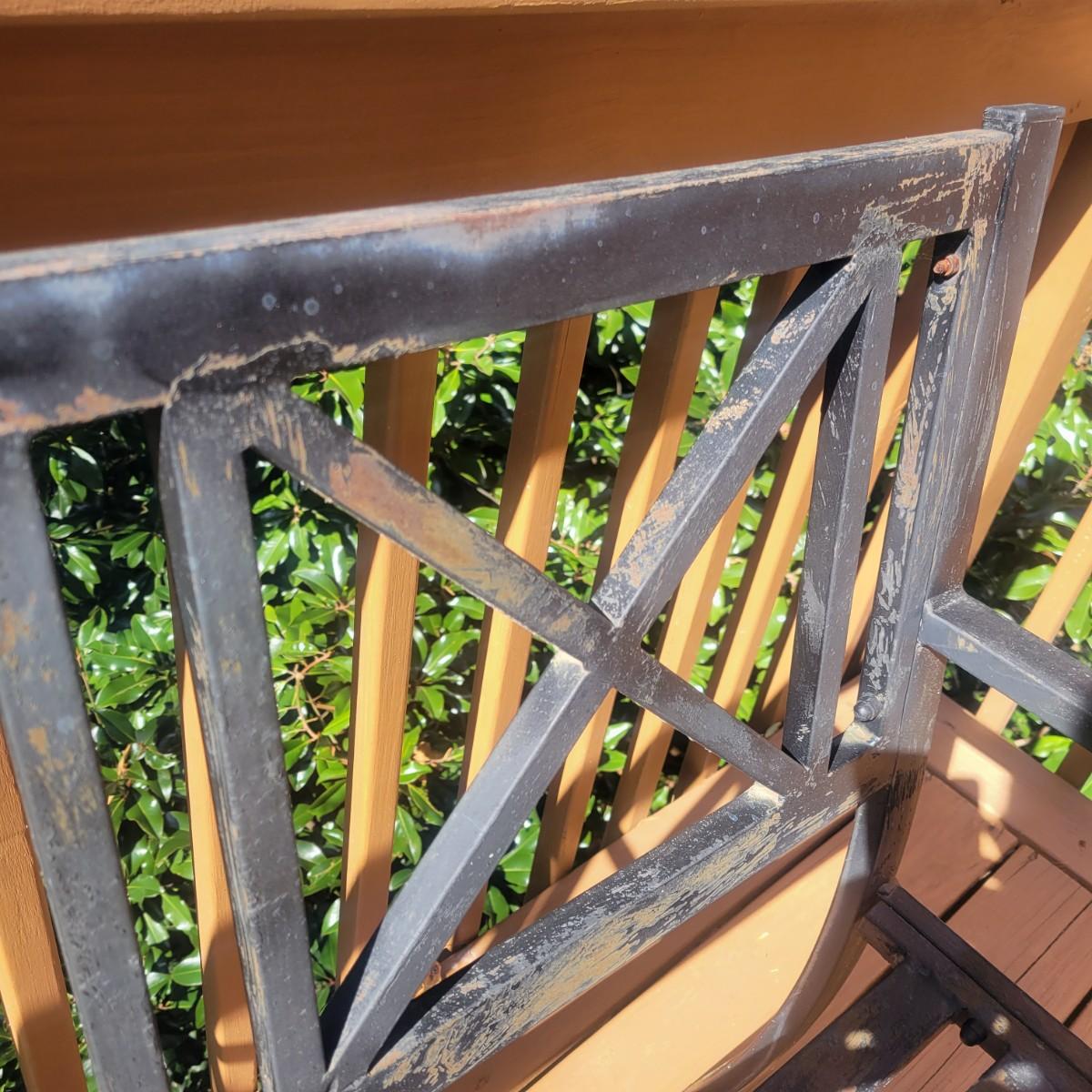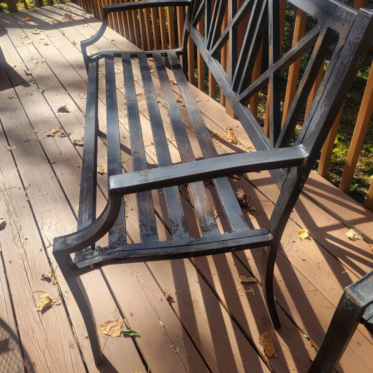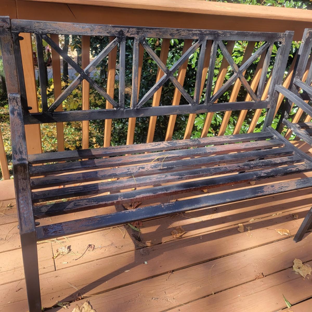 A pair of painted metal outdoor benches in good condition, but there is some rusting and the black paint is peeling in many areas. These benches are made of tube steel and are structurally sound. They could easily be sanded sealed and painted to bring them many years of life. Each bench measures approximately 50.5" x 21" x 34" with a seat height of 17". Winning bidder will need to bring assistance as these items are bulky. Local pickup only