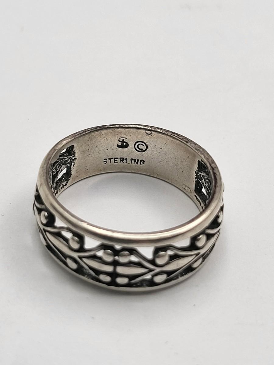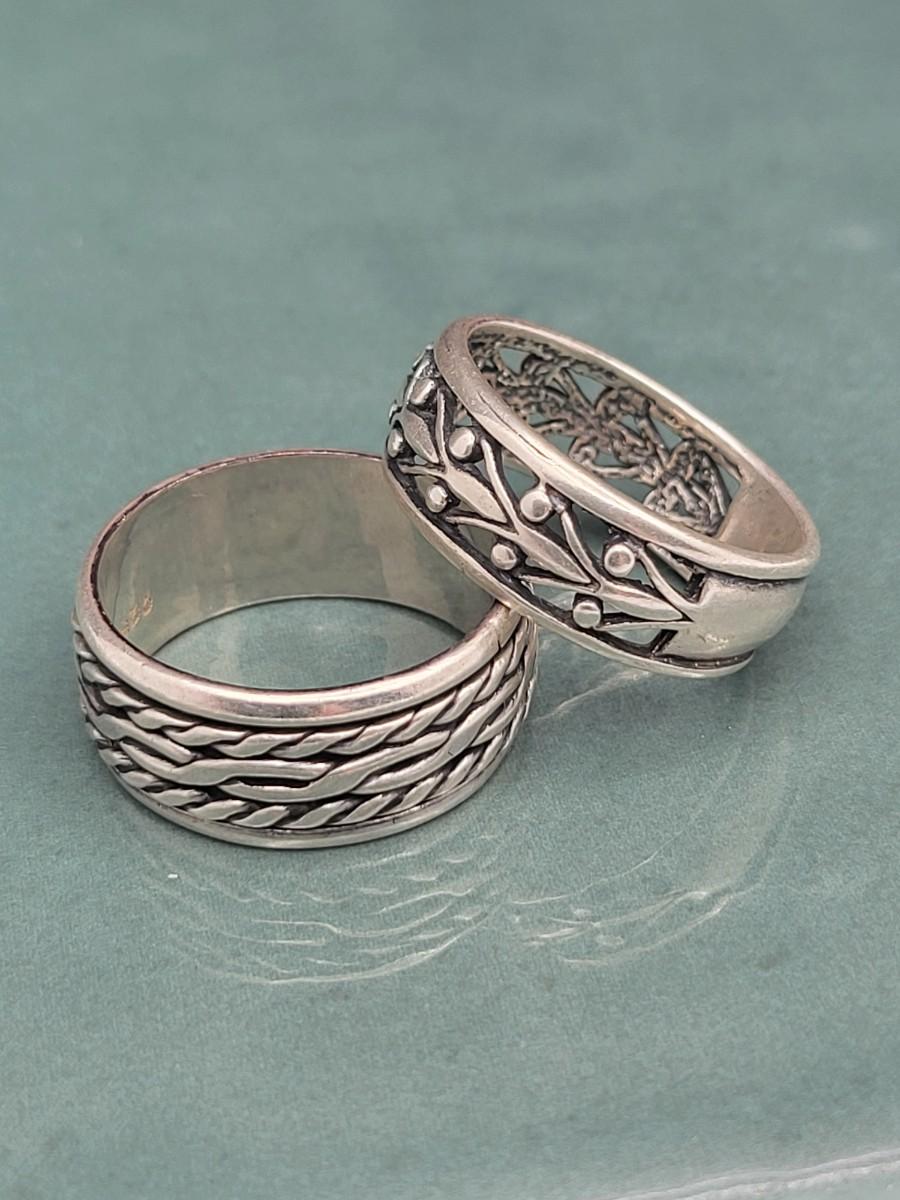 Two Sterling bands: Open work 2/3rd of the (5mm) band. Makers mark stamped, sterling silver, size 9. The other is a 6mm sterling silver spinner ring size 9. Total weight is 10.8 grams.