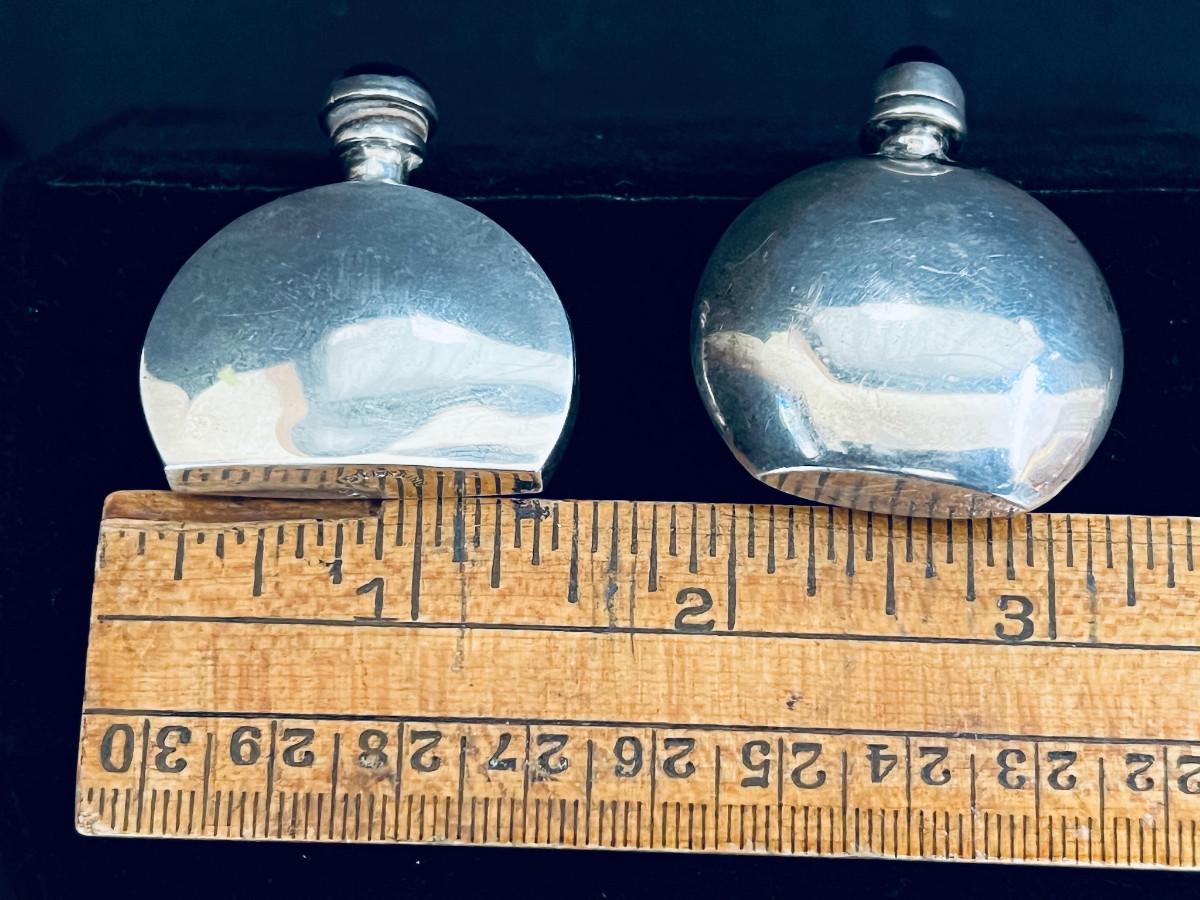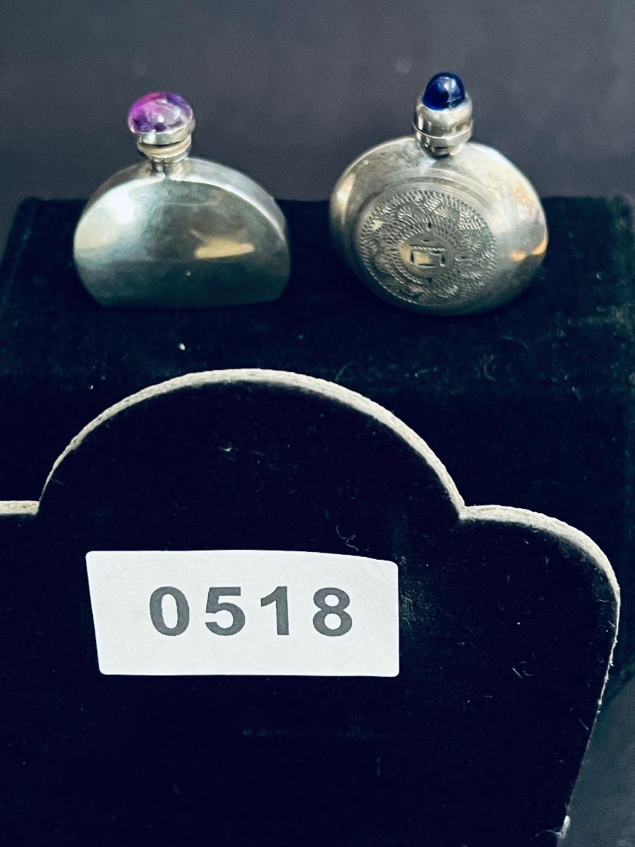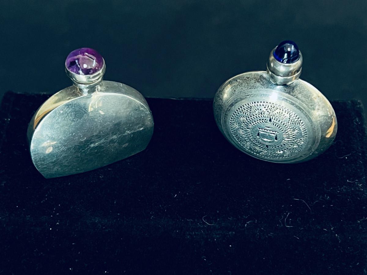 Adorable pair of Sterling Silver mini bottles - one without decoration and perhaps an amethyst cap and one is decorated with a design on one side and a fine stone cap