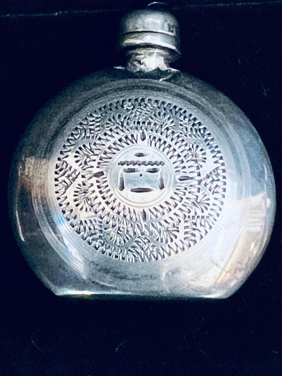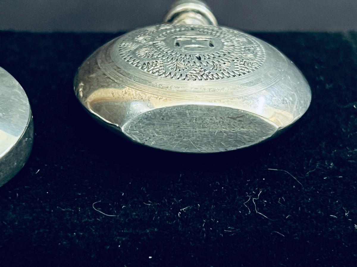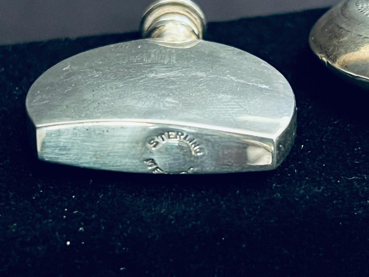 Adorable pair of Sterling Silver mini bottles - one without decoration and perhaps an amethyst cap and one is decorated with a design on one side and a fine stone cap