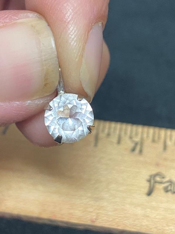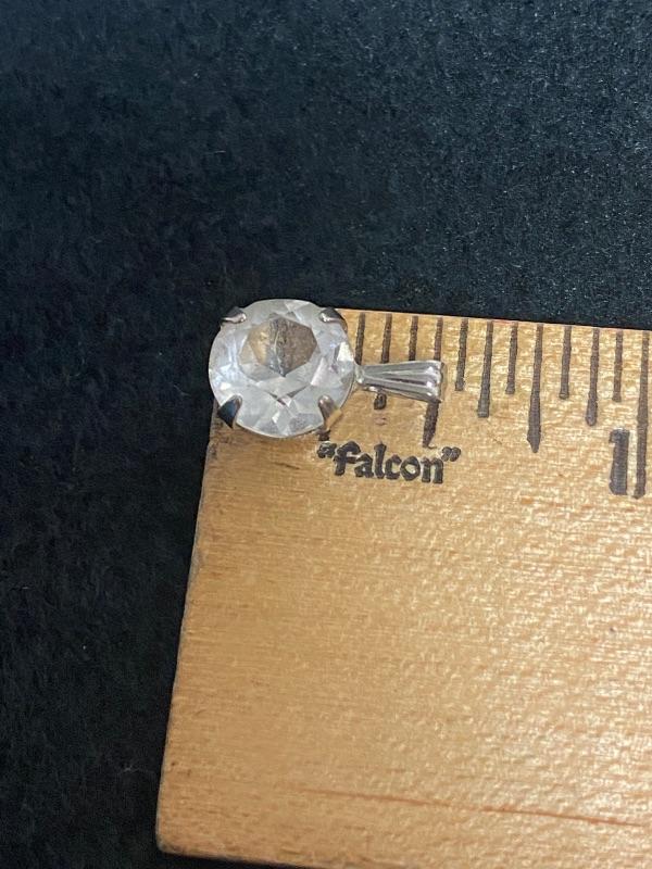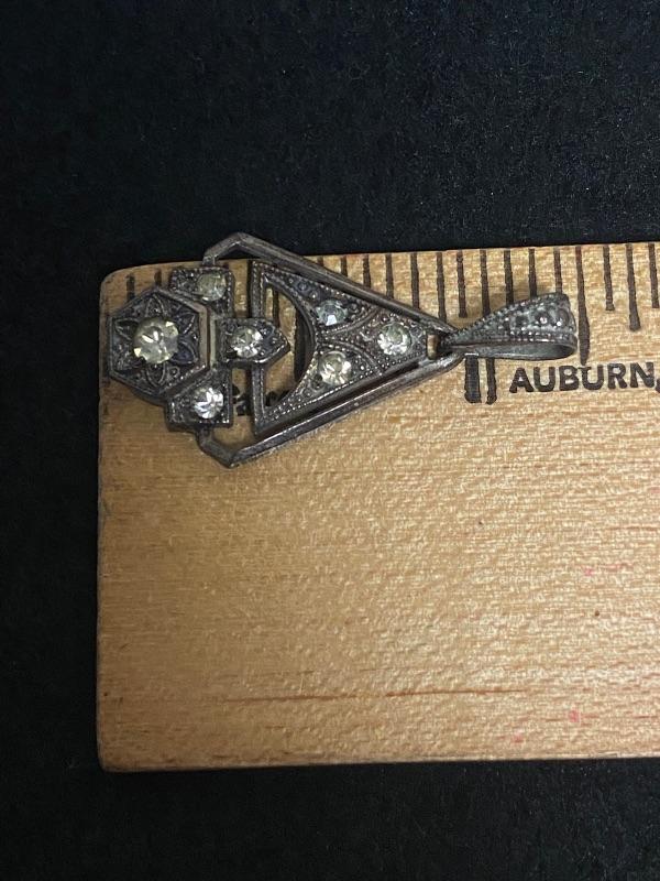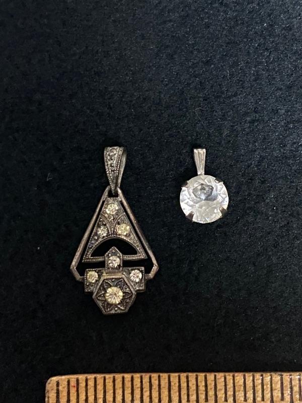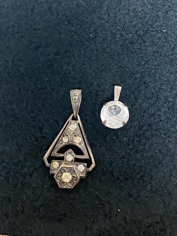 Pair of sterling pendants. One is a simple solitaire, possibly cubic zirconia. The other has an Art Deco look to it. Both have sterling stamped on the back.