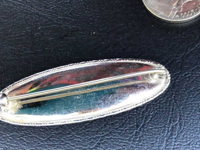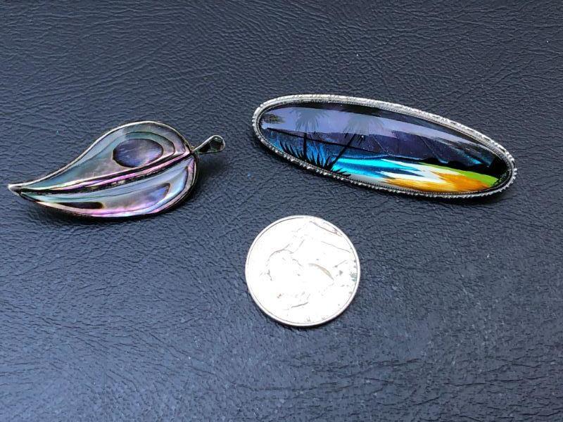 Beautiful Tranquil Beach Scene on Elongated Sterling Silver Brooch/Pin with An Abalone Shell Curved Leaf Brooch/Pin