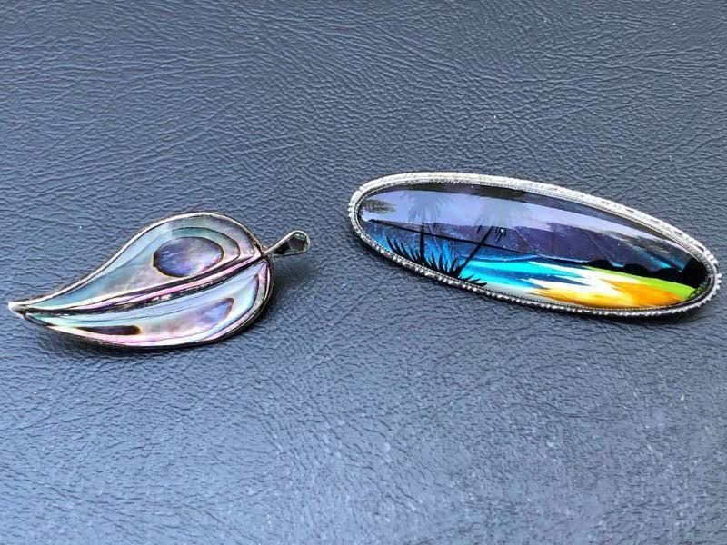 Pair of Sterling Silver Abalone and Painted Enamel Brooches Pins