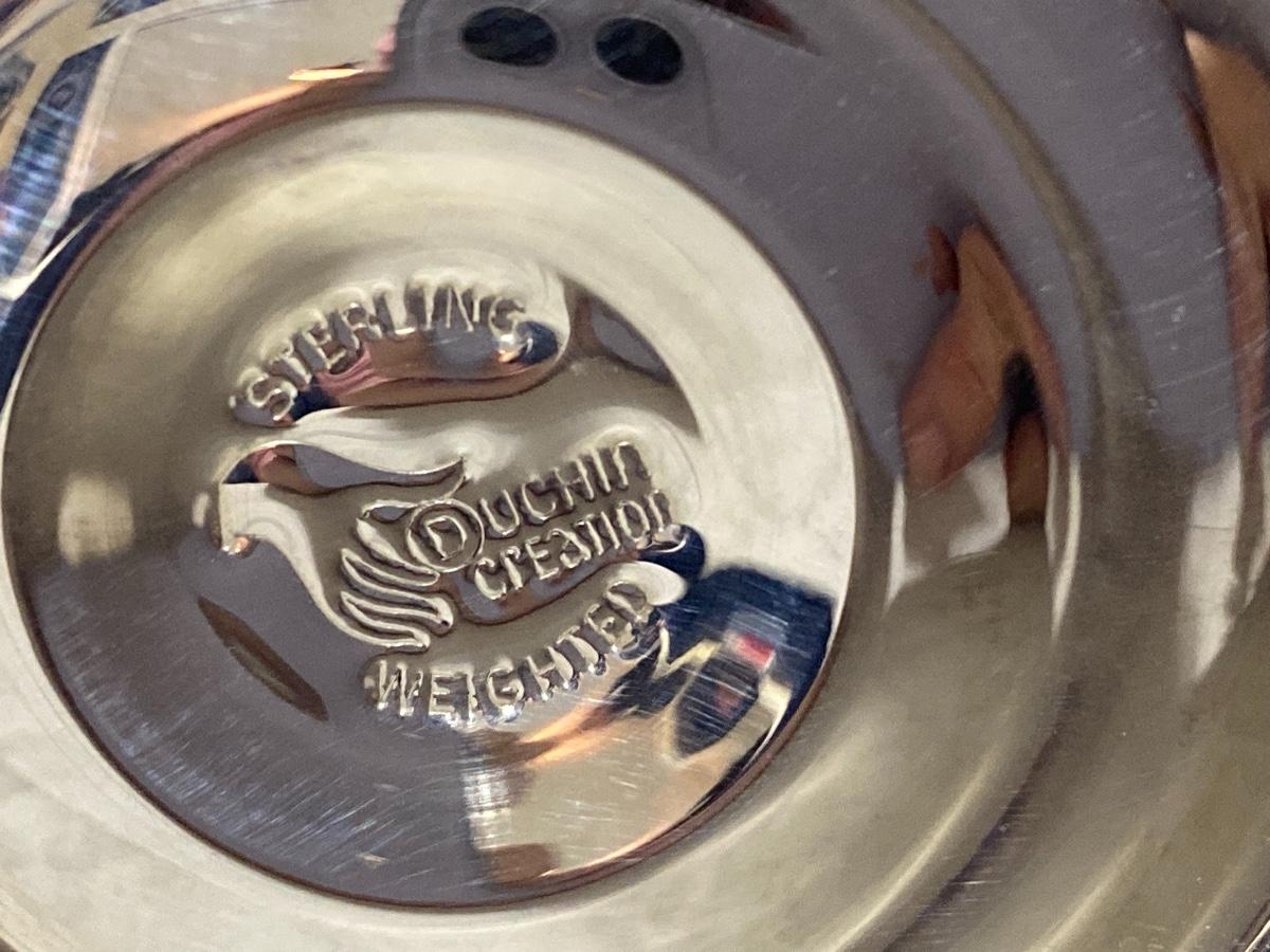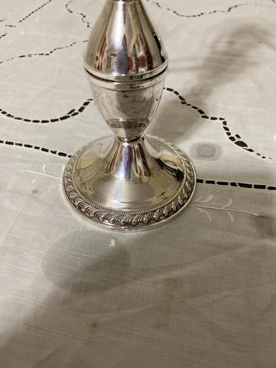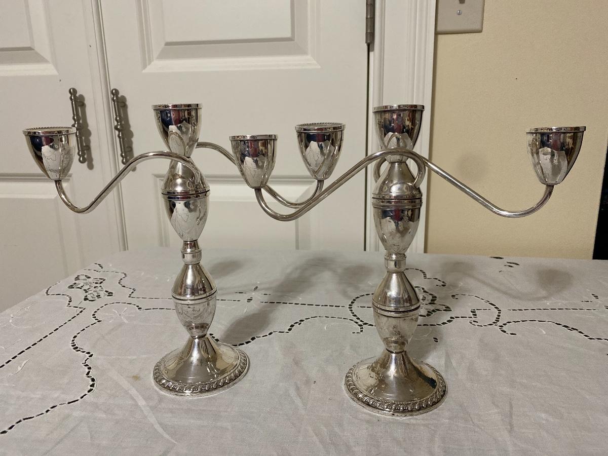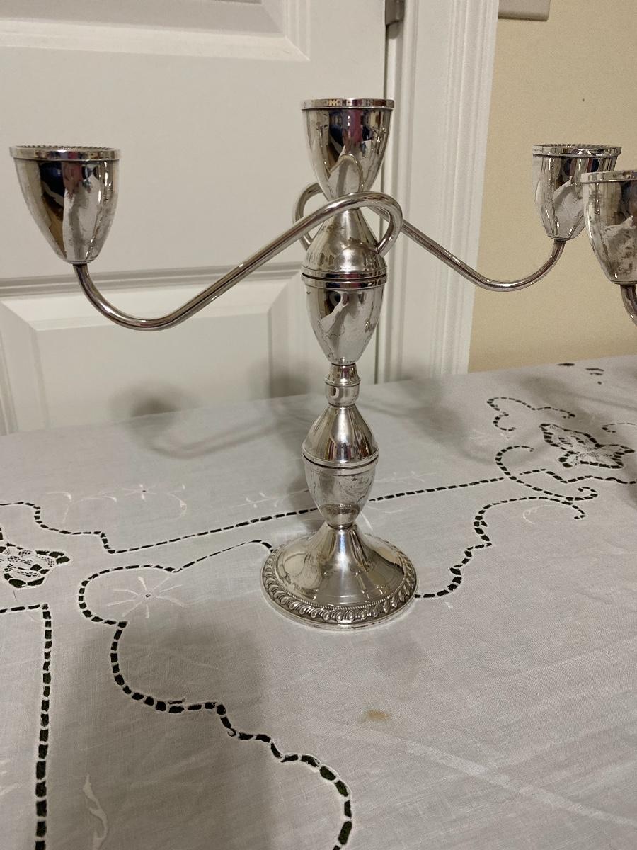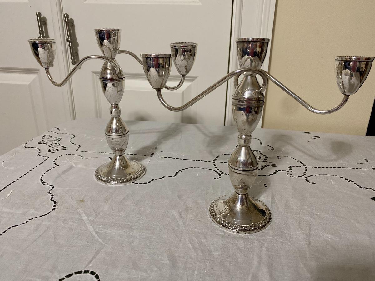 A pair of weighted sterling silver candelabras stamped Sterling Duchin Creation Weighted. One of the candelabra requires repair. It is in four parts that need to be repaired. . They each measure 9 3/4” high x 10.5” wide. The total weight for both is 802.2 dwt and 1247.4 grams. These are weighted.