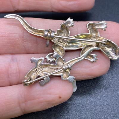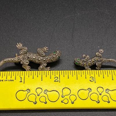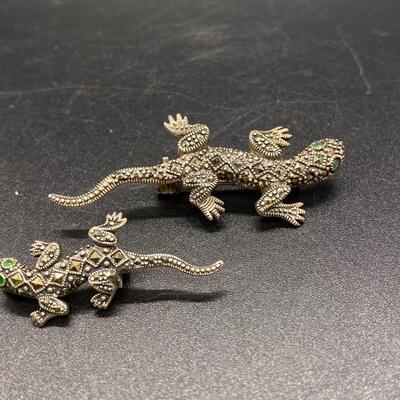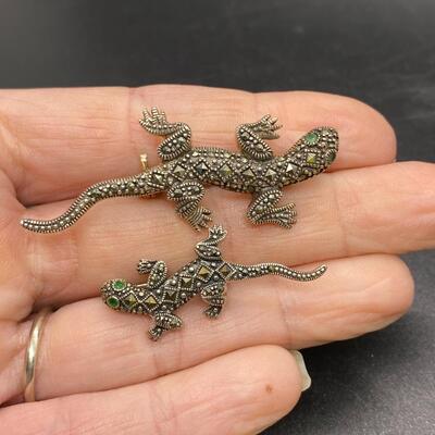 Pair of sterling silver retile pins. Marcasite covered lizards with emerald eyes. Larger one is about 2" and the smaller is 1.5" size. Stamped on the back. Made in Thailand.