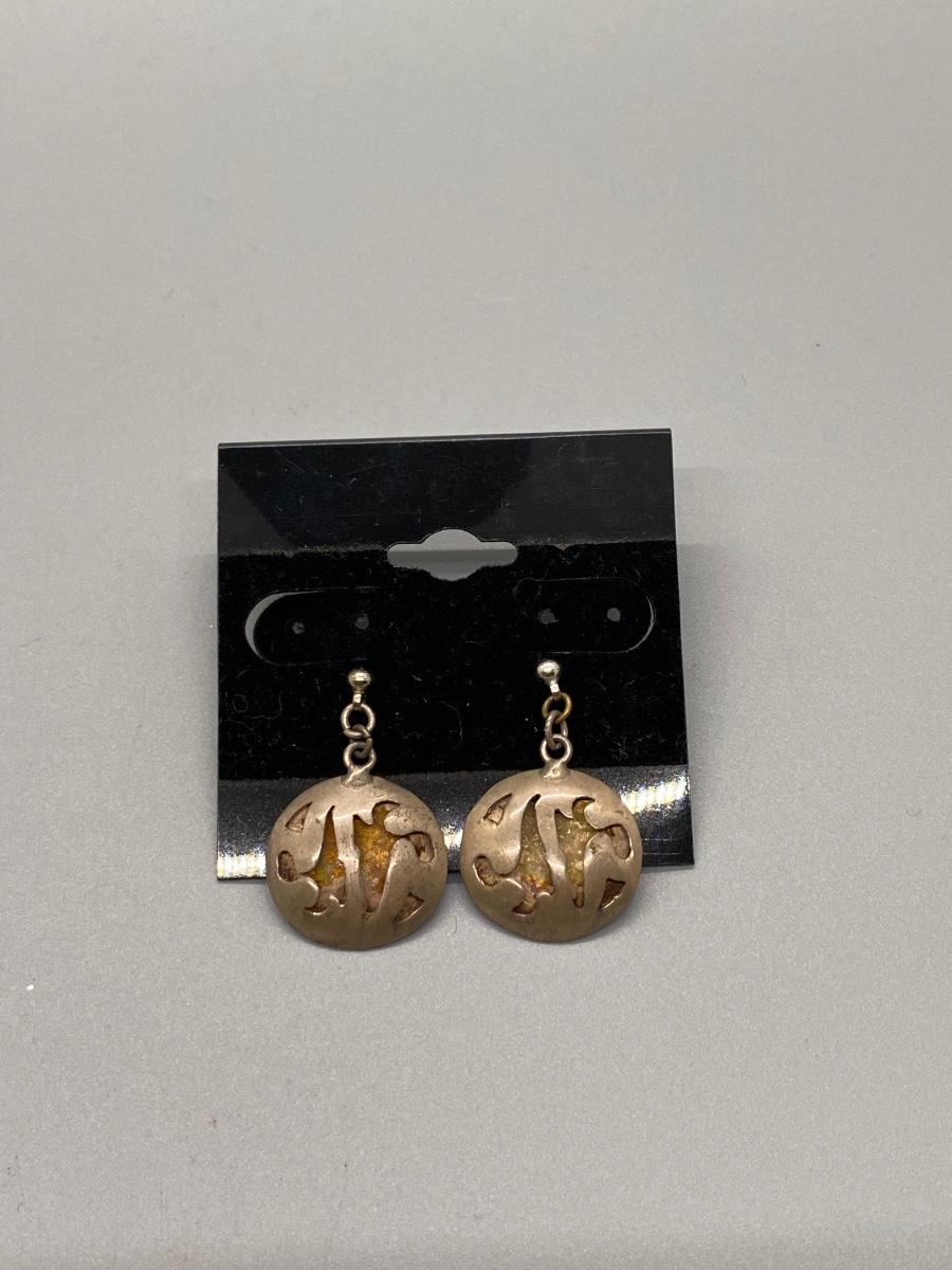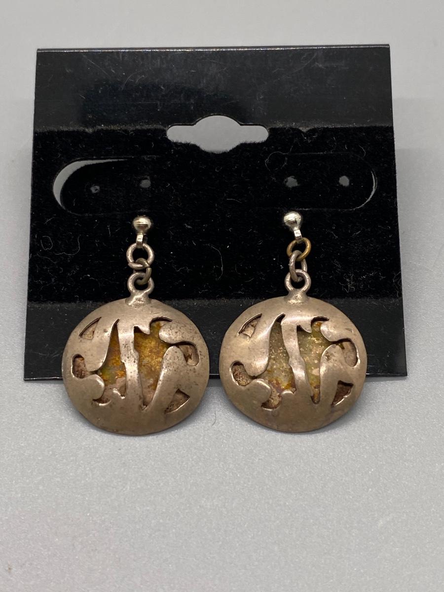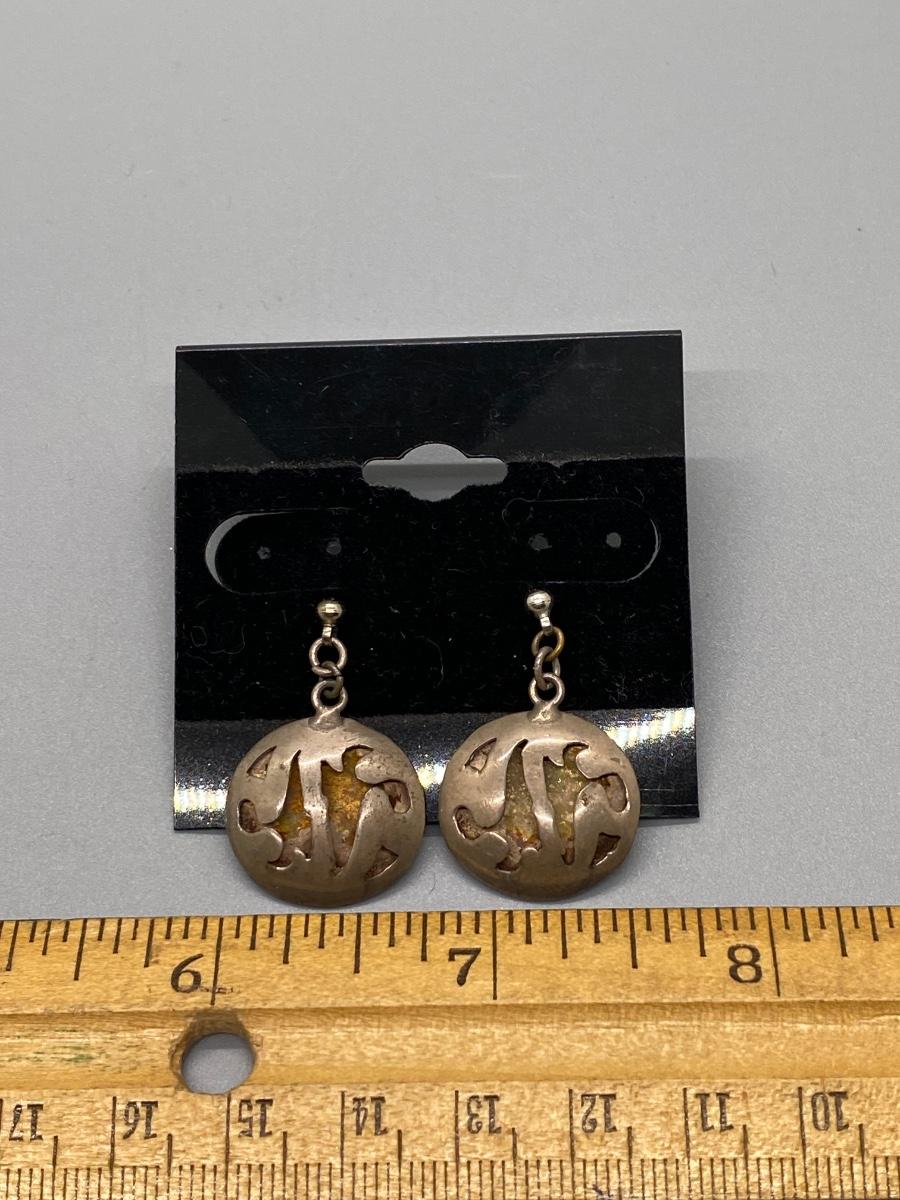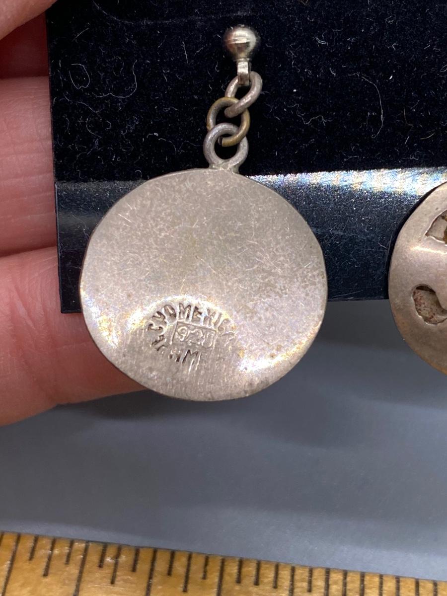 Pair of sterling silver round dangling earrings. Made in Mexico. Each medallion is about 3/4" size. Need to be cleaned.