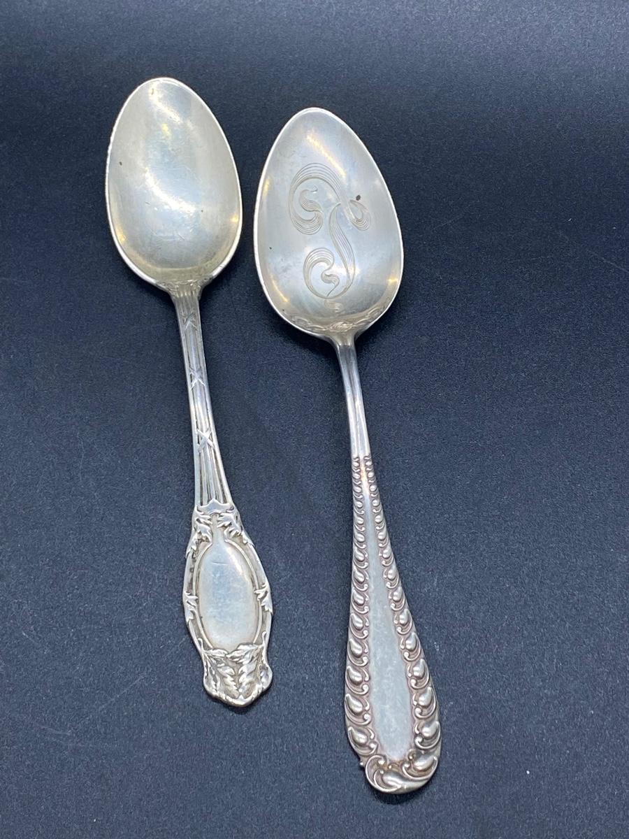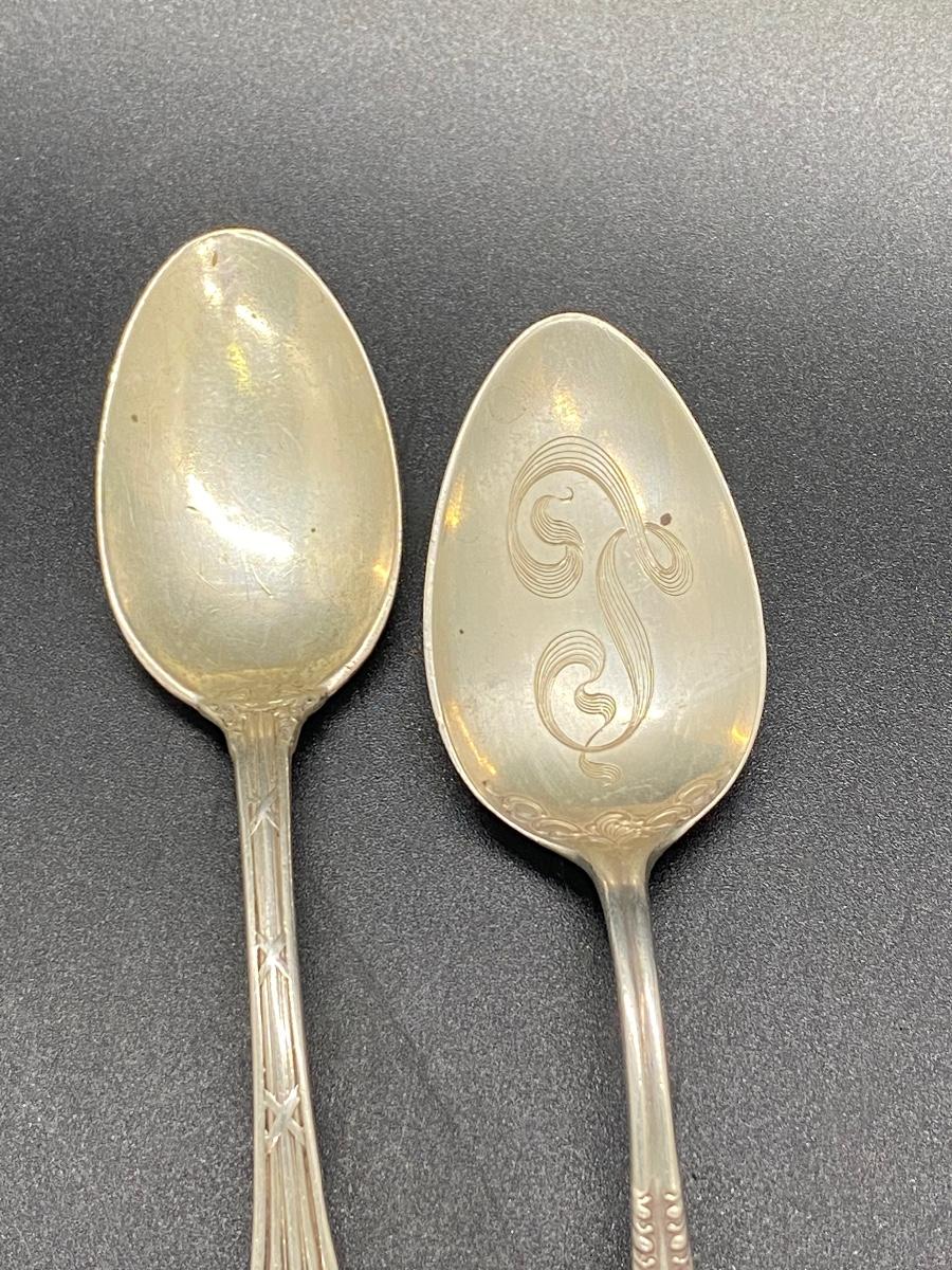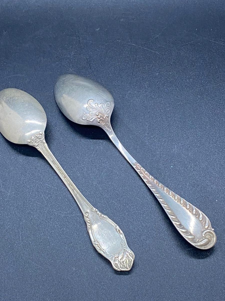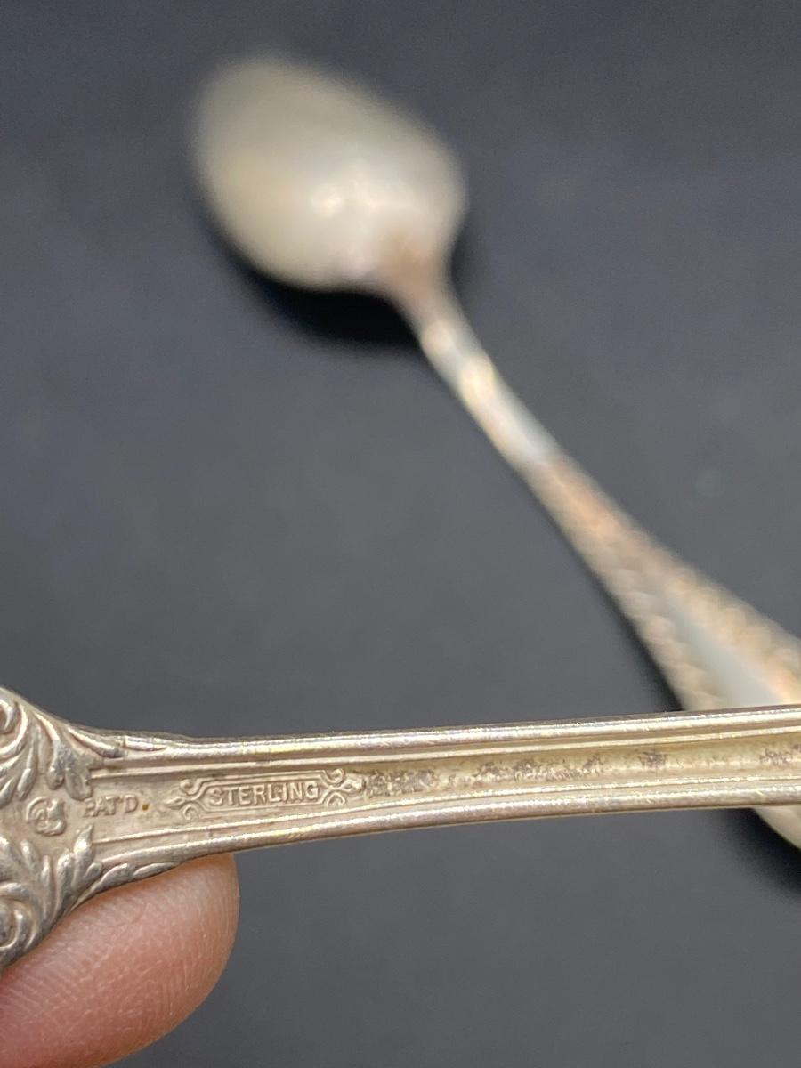 Pair of sterling silver teaspoons. Different patterns. Both are marked sterling on the back. In good condition. Great for collector or upcycle into spoon rings.