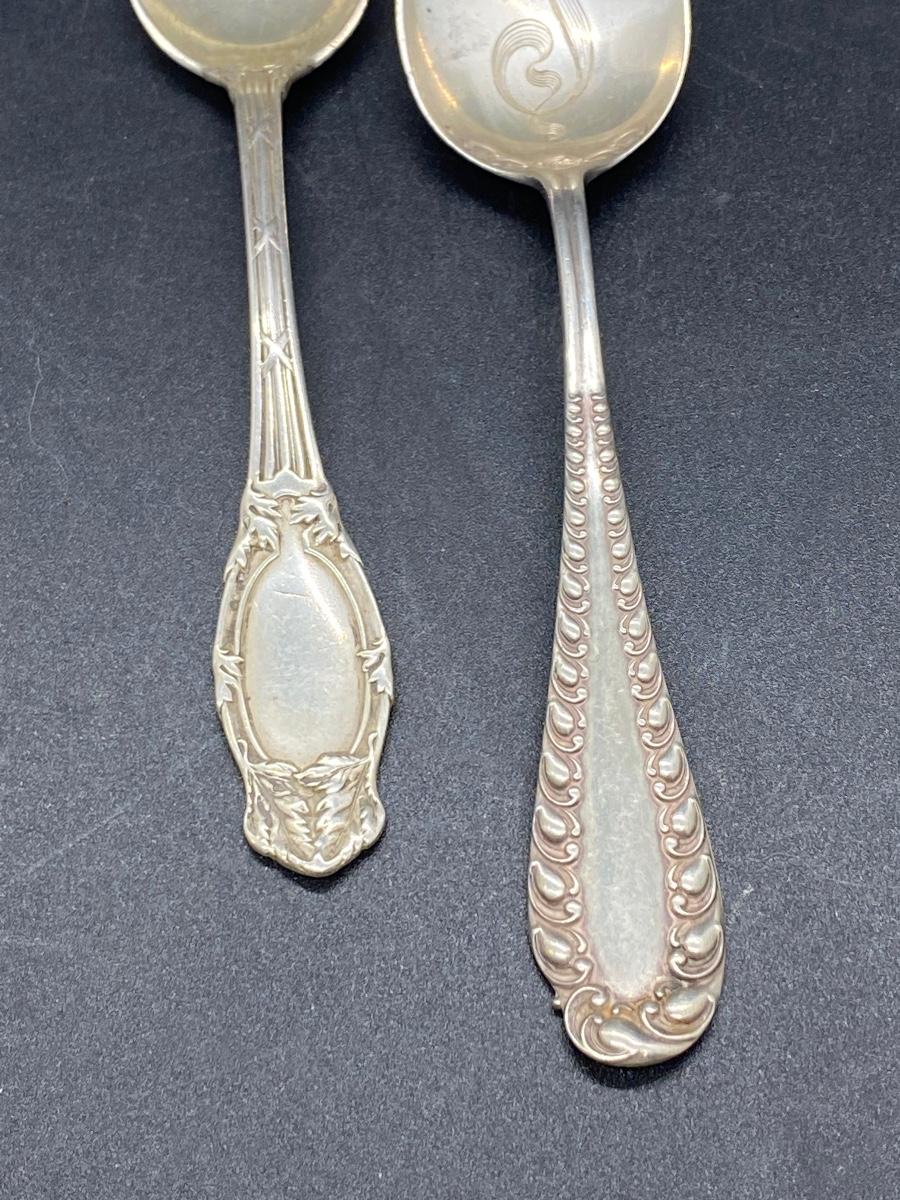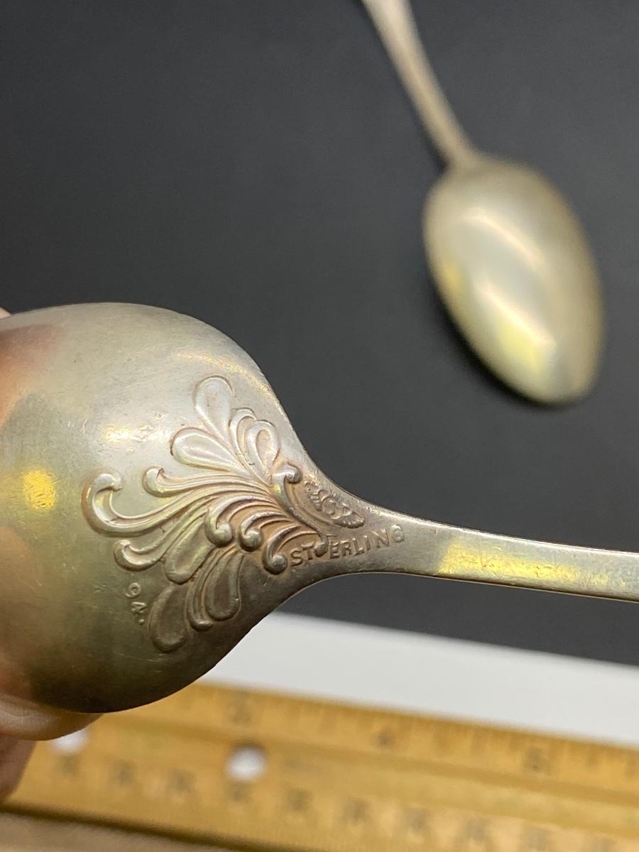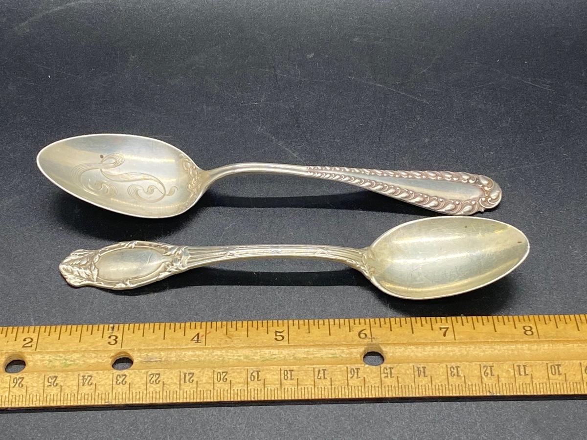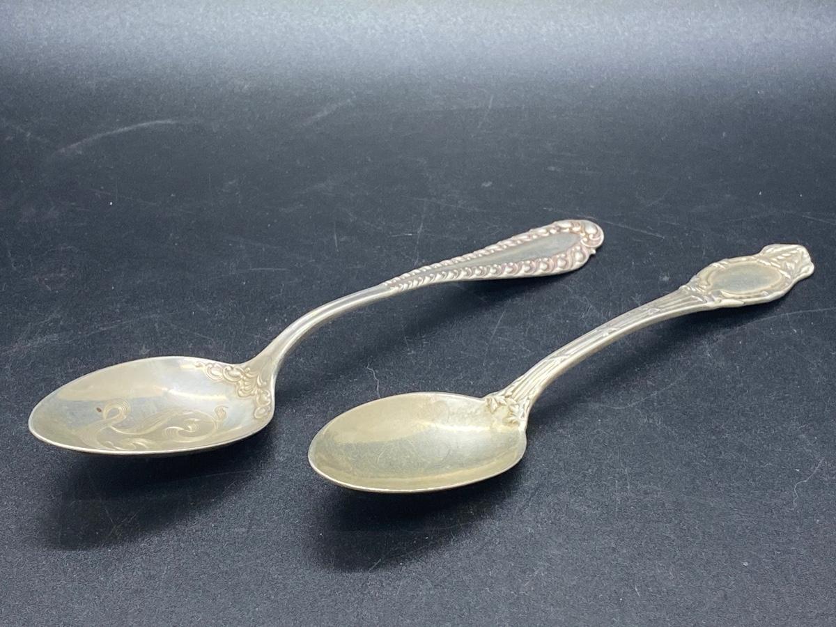 Pair of sterling silver teaspoons. Different patterns. Both are marked sterling on the back. In good condition. Great for collector or upcycle into spoon rings.