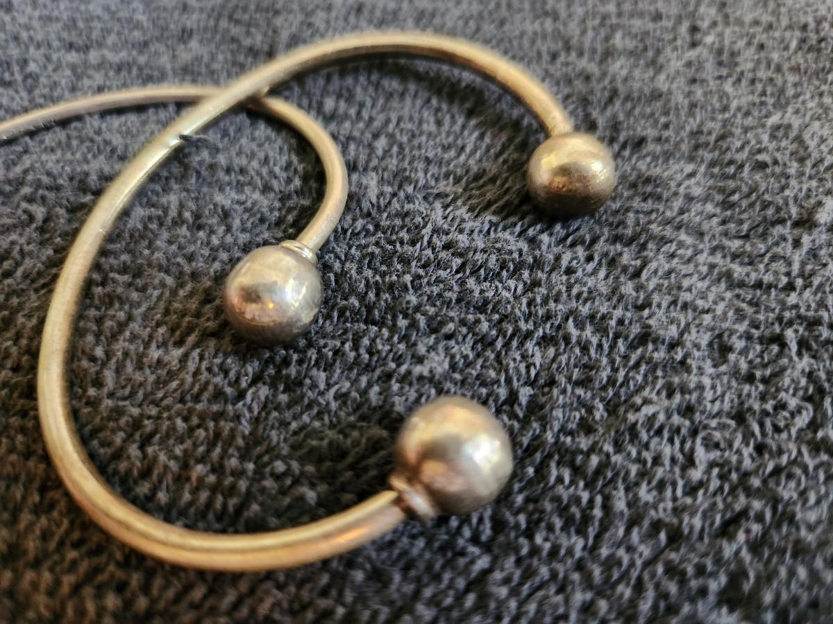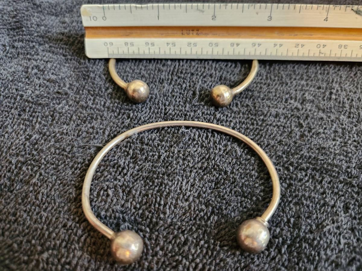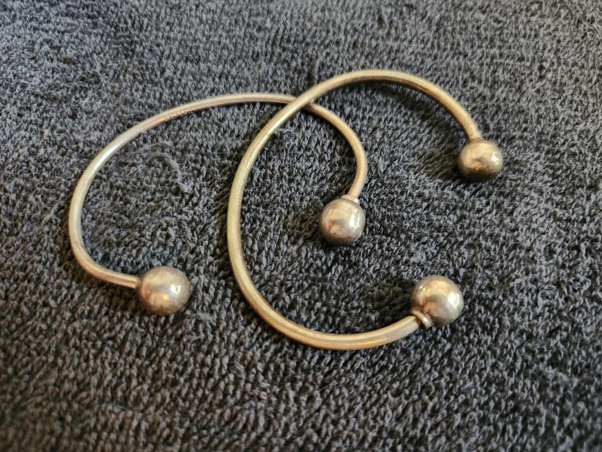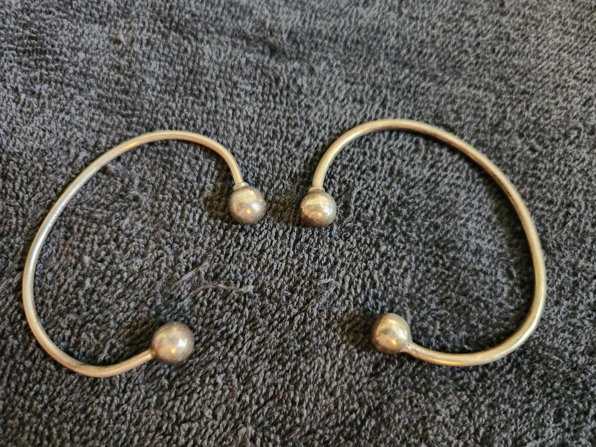 This auction lot is for a Pair of Sterling Wrist Bracelets. Only one of these bracelets are marked Mexico 925 but we feel certain the other is sterling also. See photos for band size. One ball on each of these bracelets screws off - so maybe they could be uses as dangling earrings - pretty heavy though. Both weigh about a combined 28.1 grams.