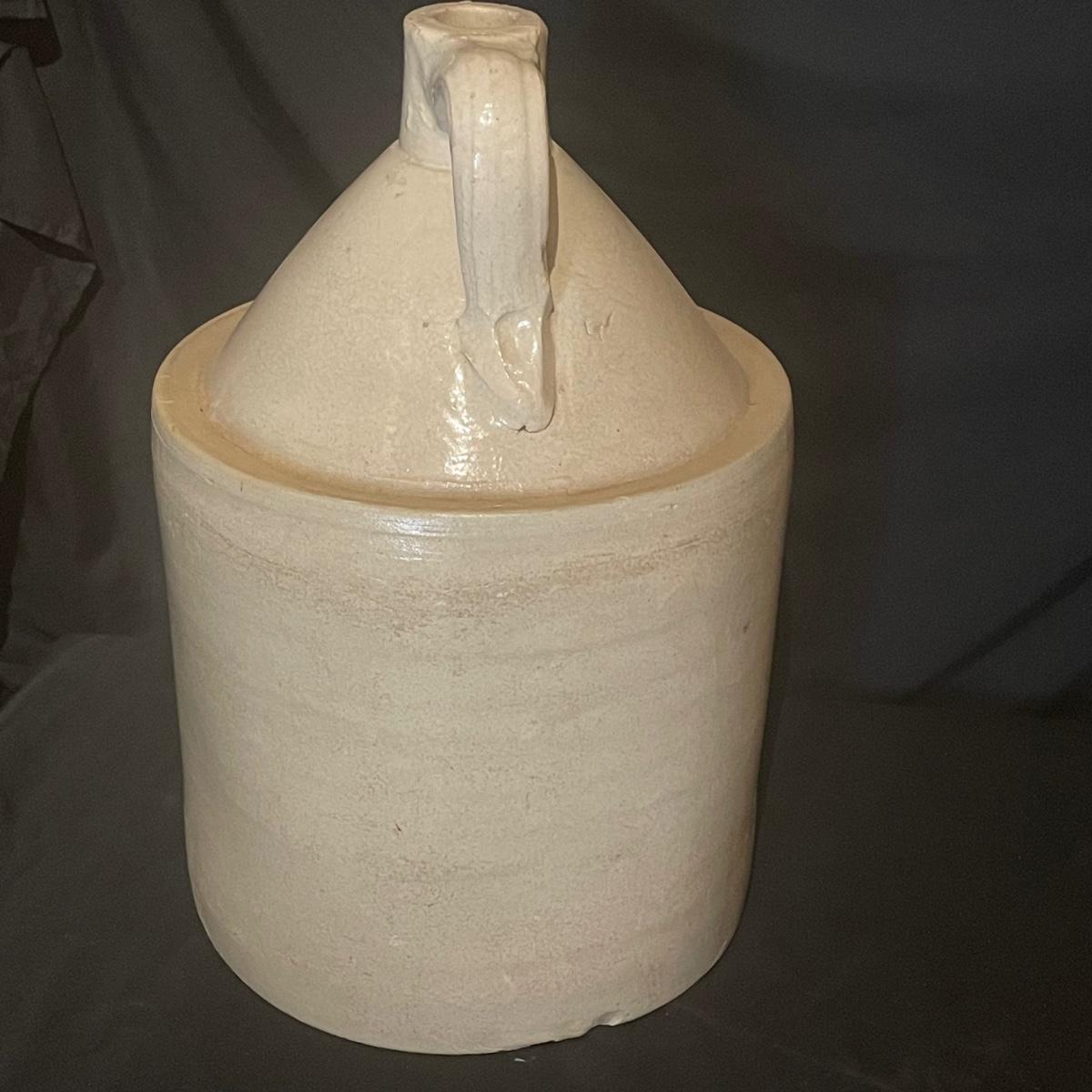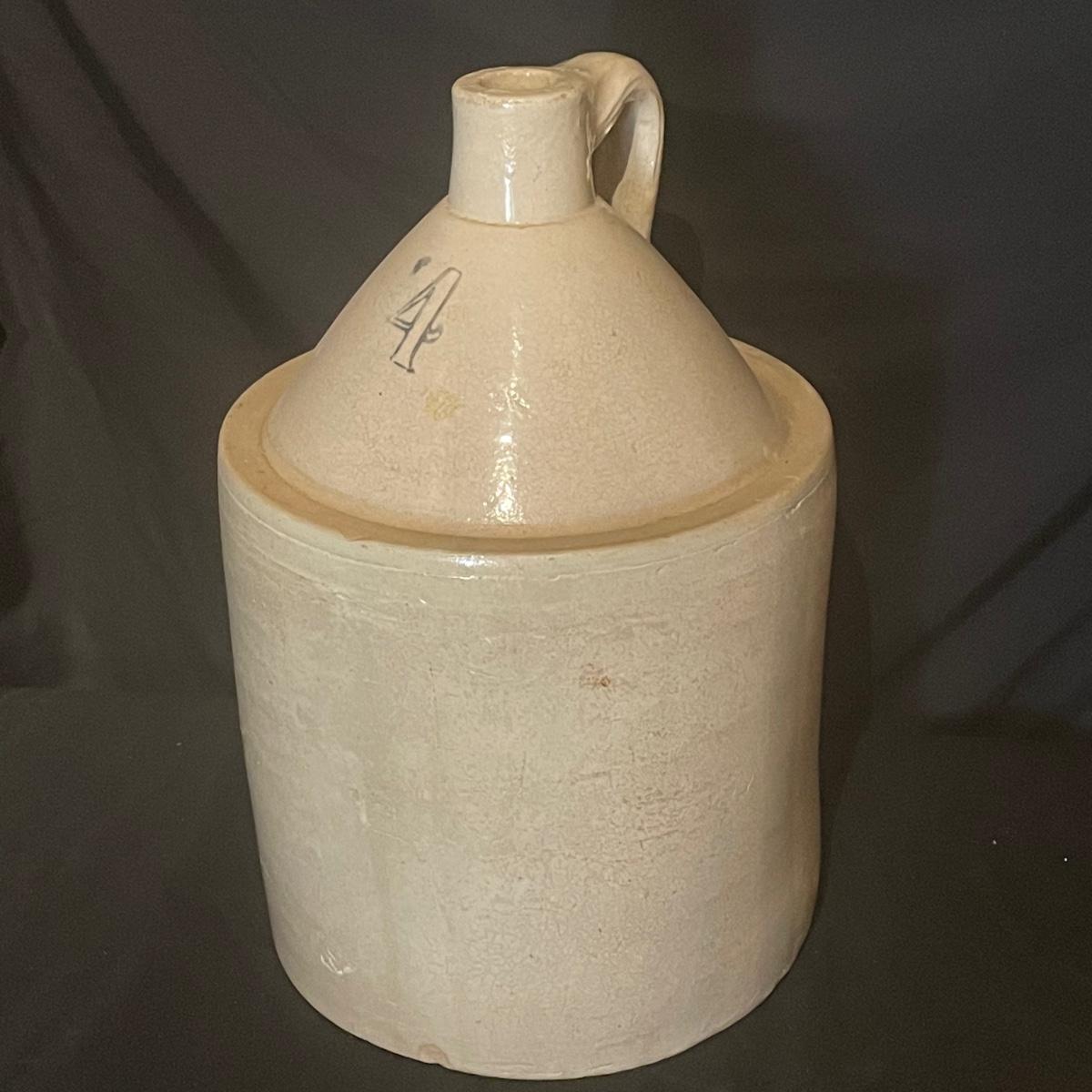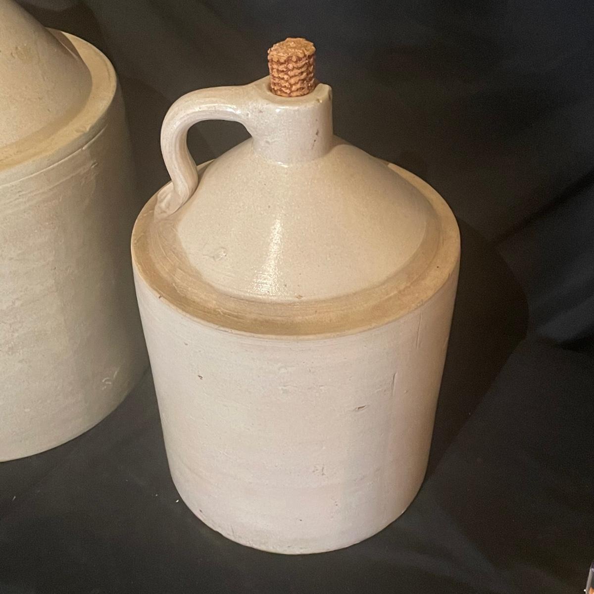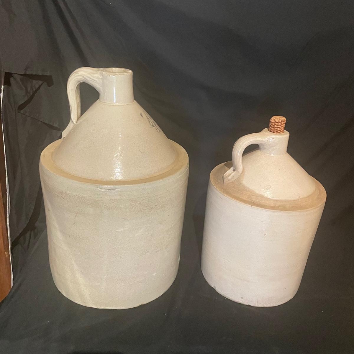 These two jugs are very similar to one another but different in size. The larger (4 gallon) jug measures 10.5” d x 19” tall. Both have just a few minor chips, see images.