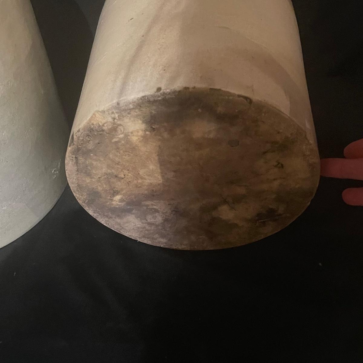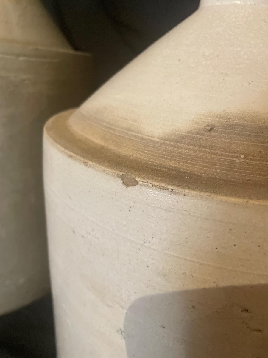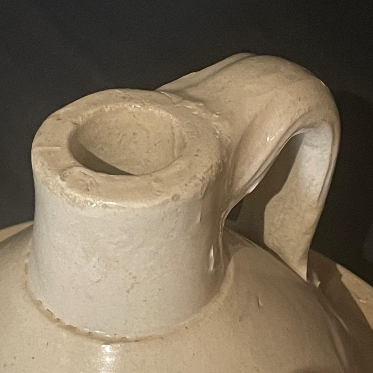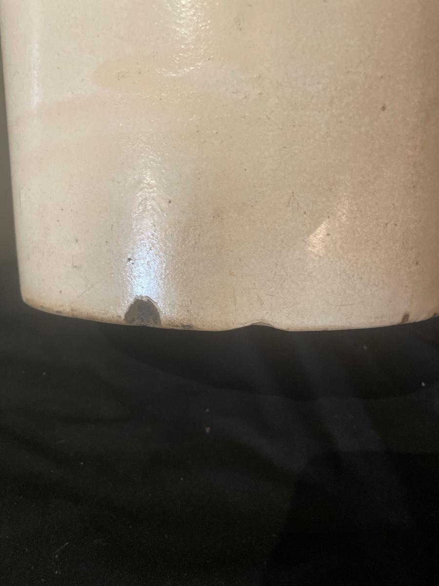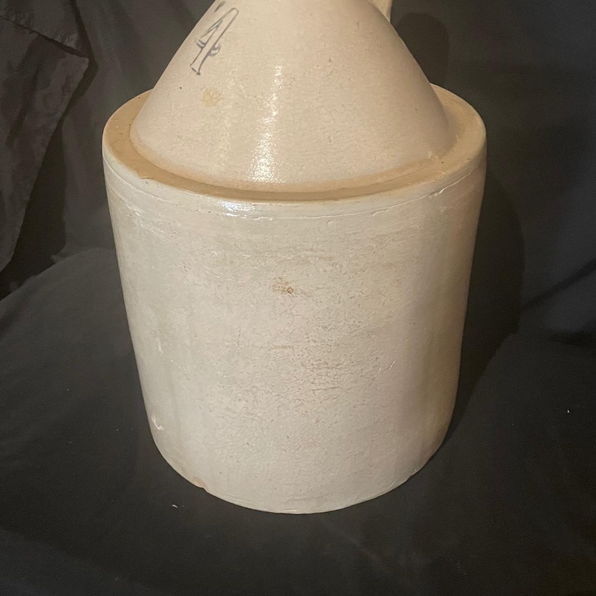 These two jugs are very similar to one another but different in size. The larger (4 gallon) jug measures 10.5” d x 19” tall. Both have just a few minor chips, see images.