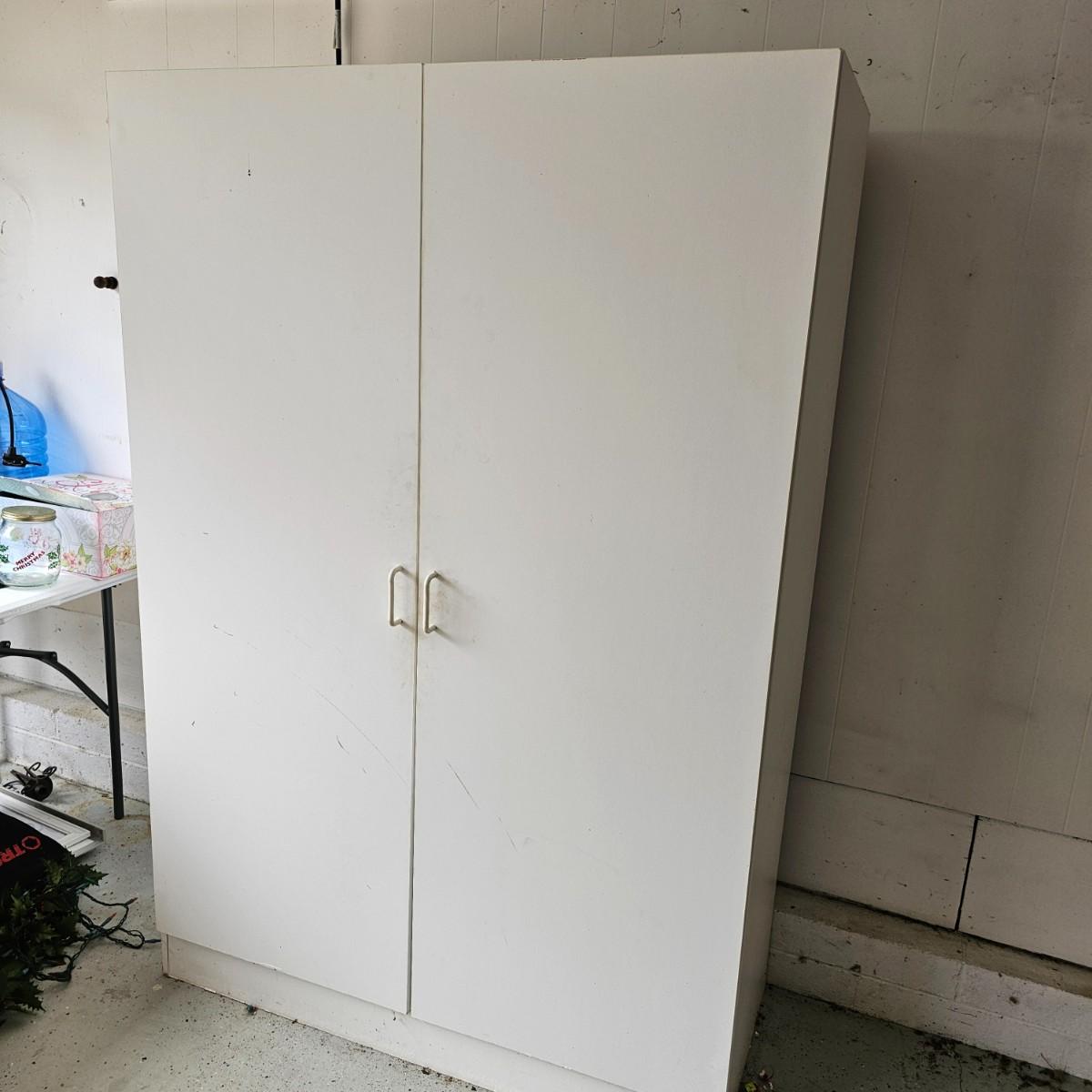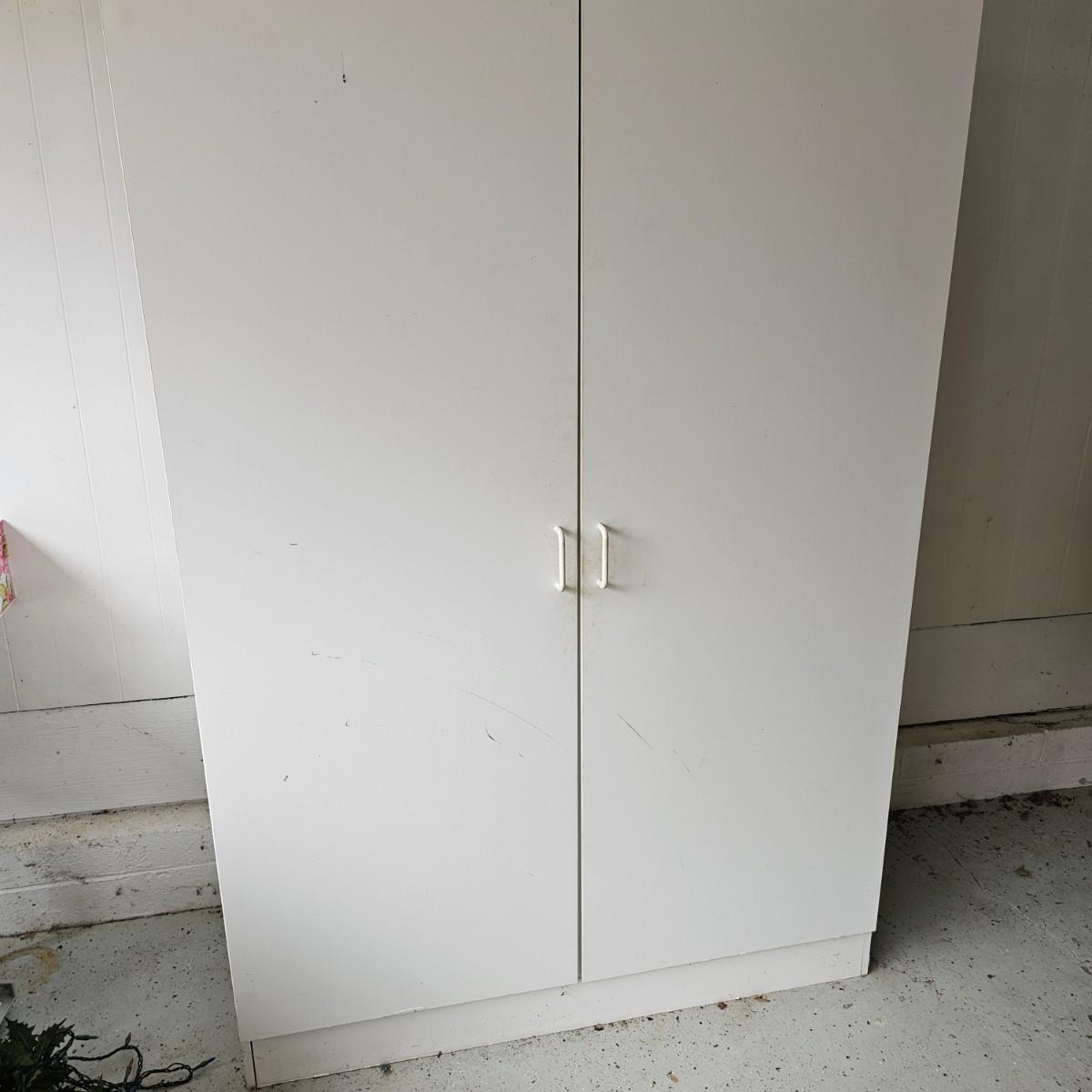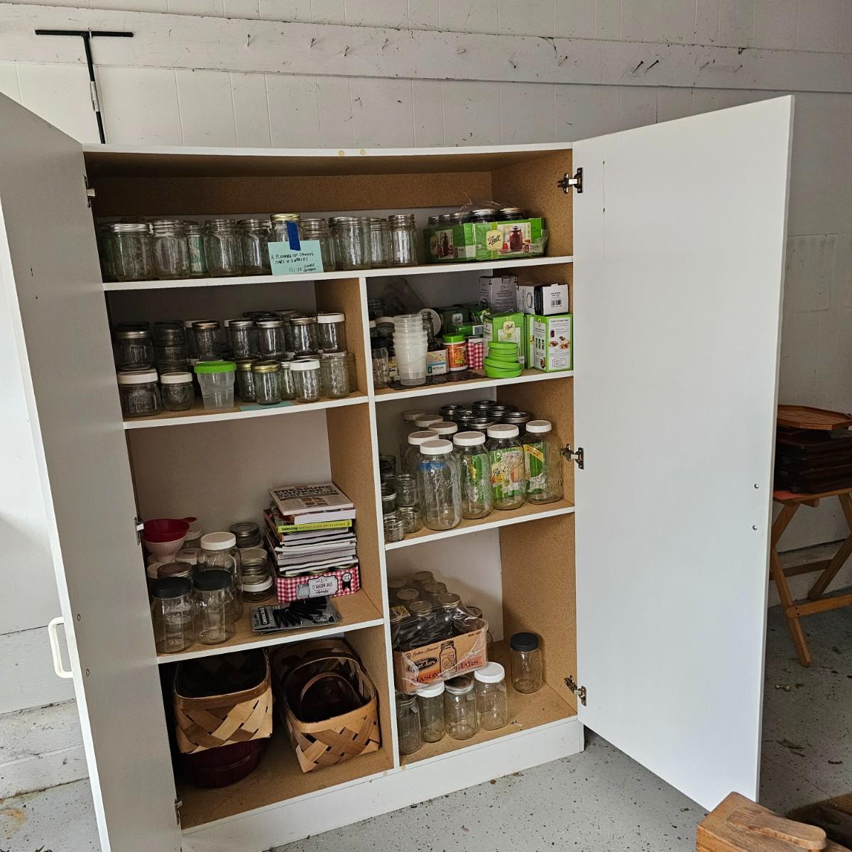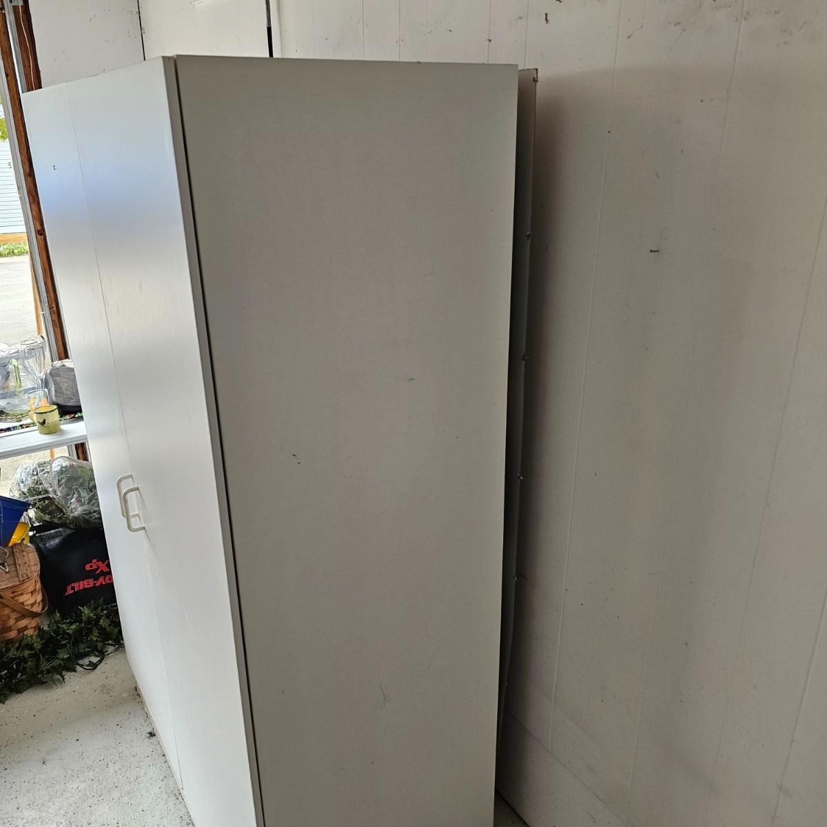 Two storage cabinets made of manufactured wood One large white unit and one wood tone piece. White cabinet measures 21" x 47" x 70.5"H, wood tone is 15.5" x 29" x 60"H. Please note, cabinets are in two different spots. One in garage, other on second floor. White cabinet, part of back cover is loose, and does not include contents shown in photos. See separate lot for canning jars. Tan cabinet has locking door with keys. See photos for details. Local pickup only. Winning bidder must bring assistance to help move and load this item due to its weight and/or size.