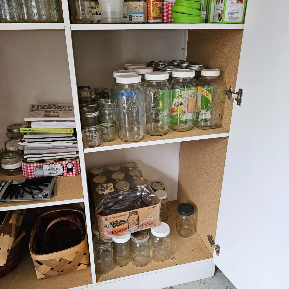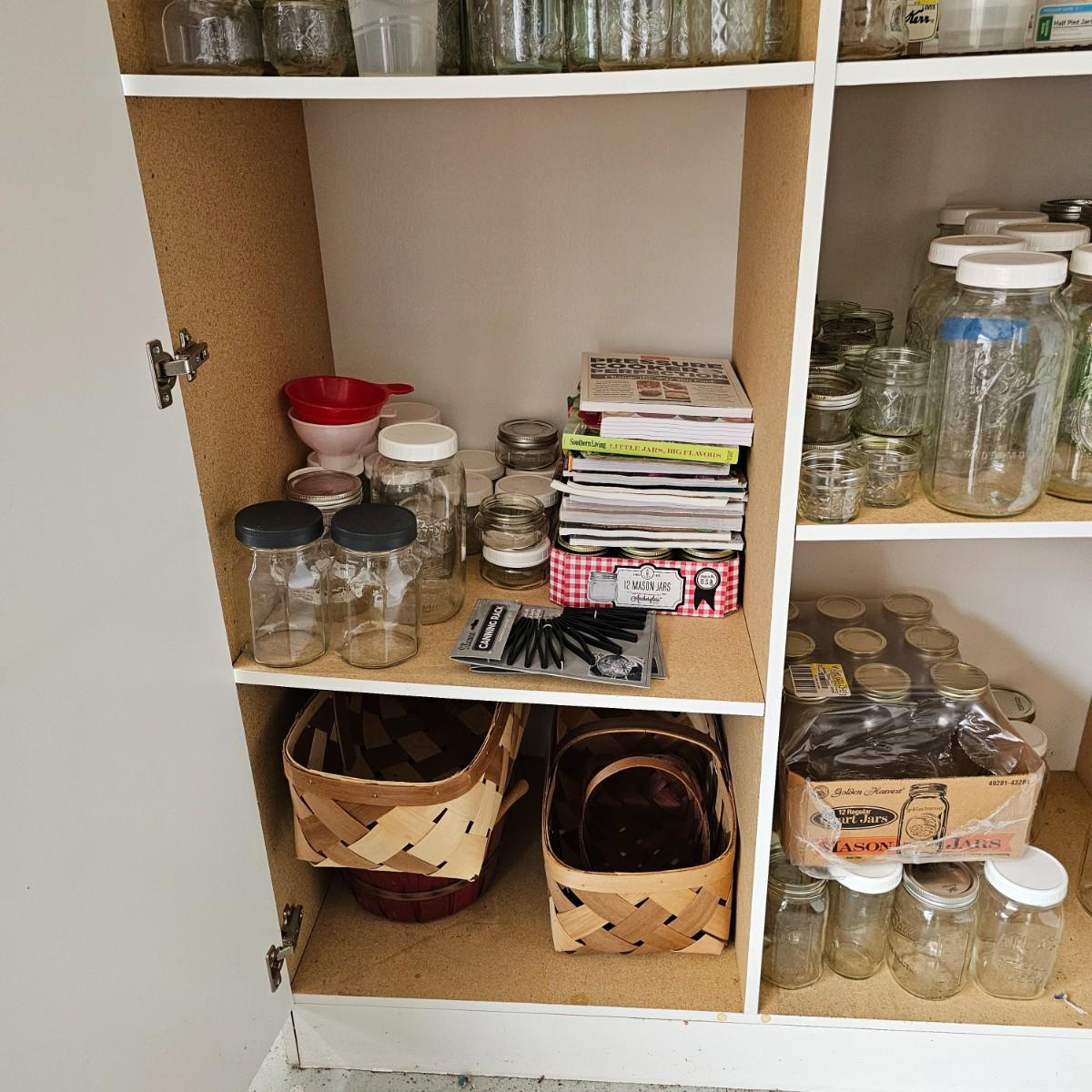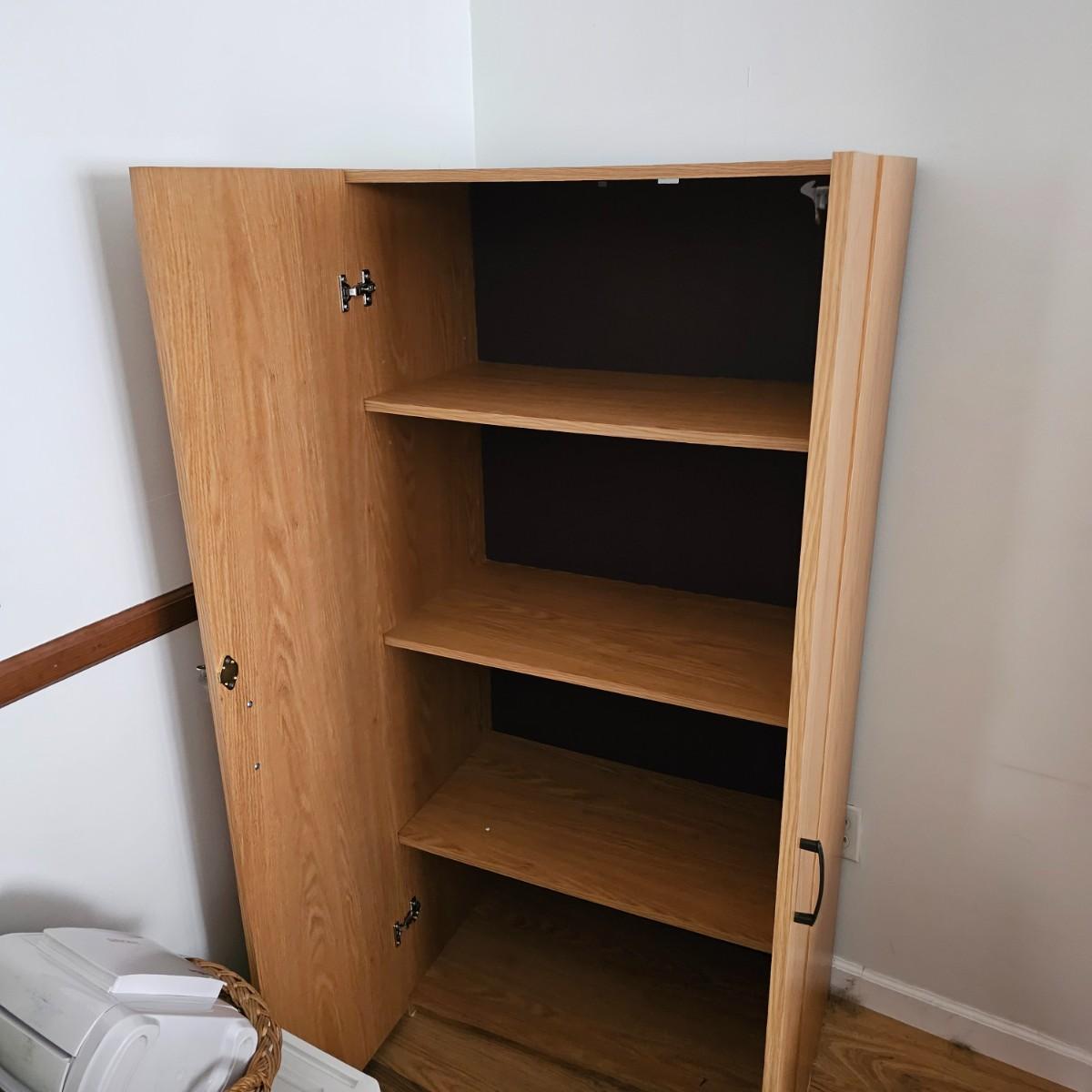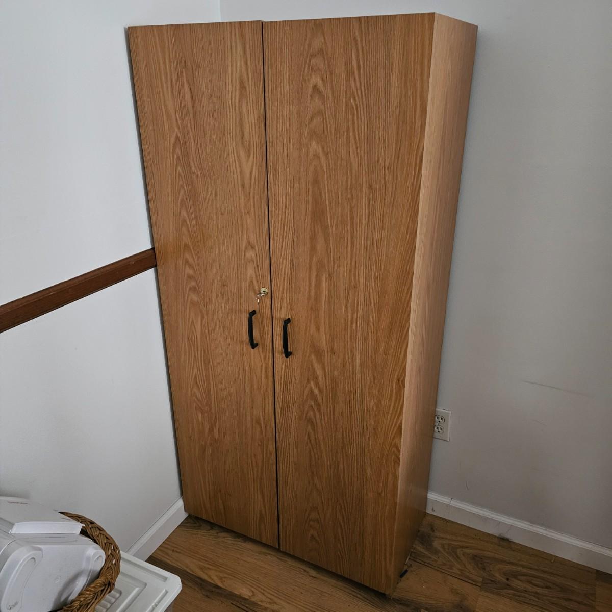 Two storage cabinets made of manufactured wood One large white unit and one wood tone piece. White cabinet measures 21" x 47" x 70.5"H, wood tone is 15.5" x 29" x 60"H. Please note, cabinets are in two different spots. One in garage, other on second floor. White cabinet, part of back cover is loose, and does not include contents shown in photos. See separate lot for canning jars. Tan cabinet has locking door with keys. See photos for details. Local pickup only. Winning bidder must bring assistance to help move and load this item due to its weight and/or size.