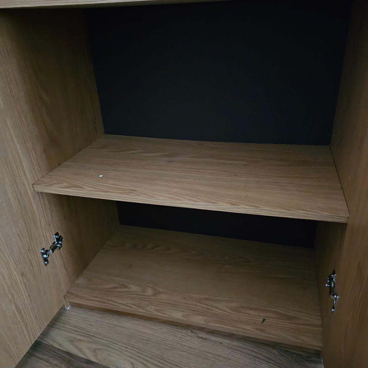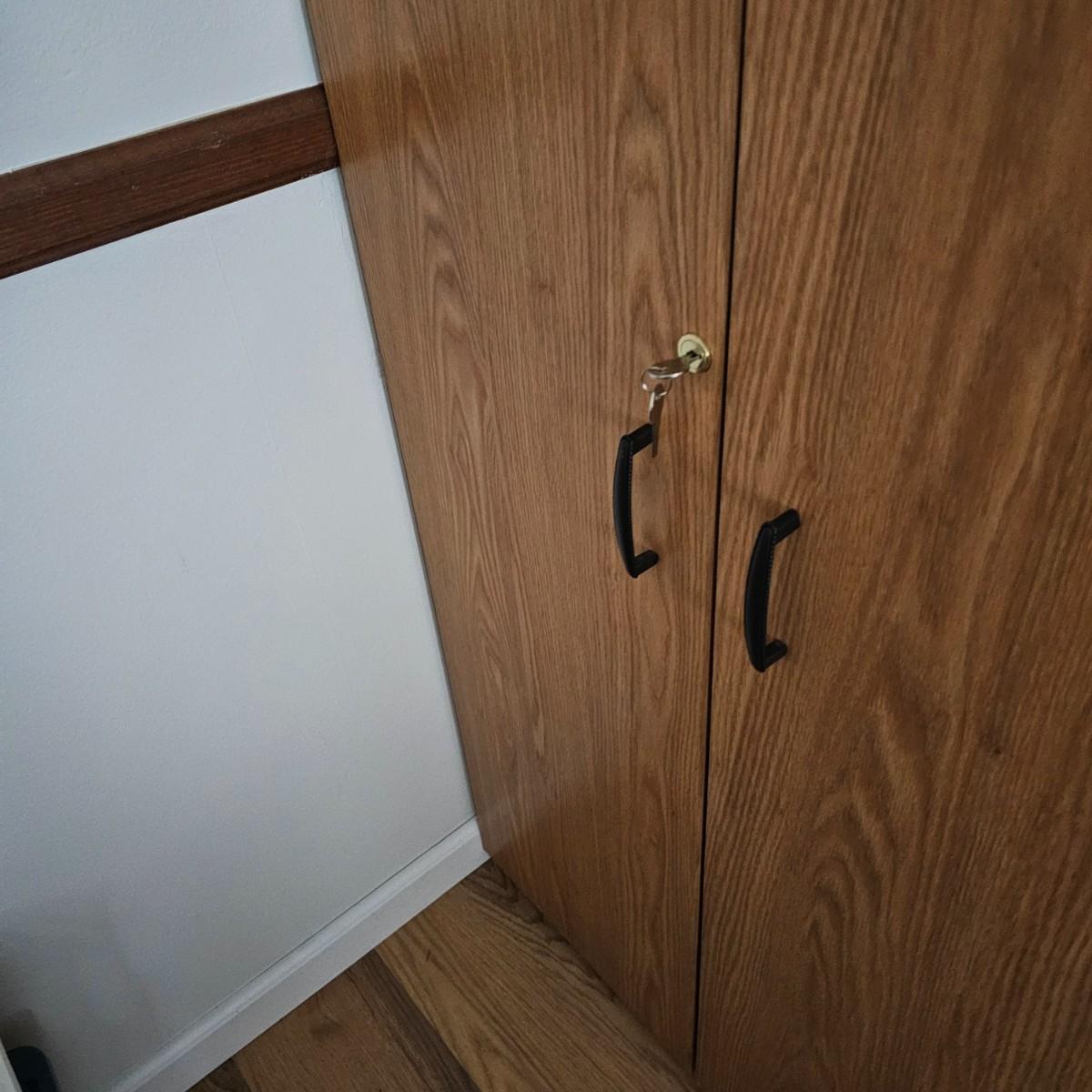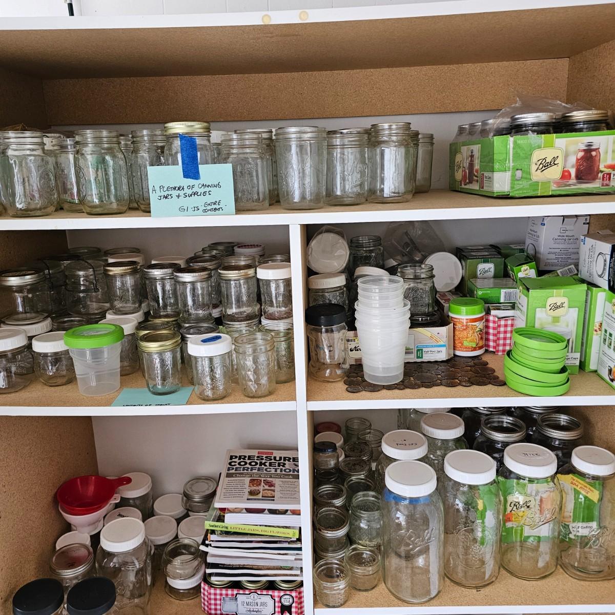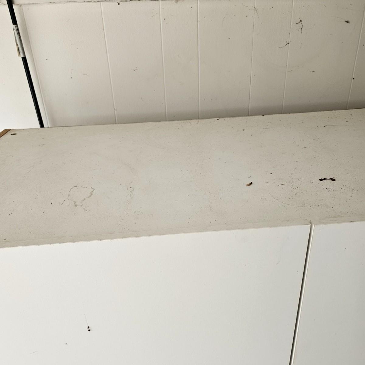 Two storage cabinets made of manufactured wood One large white unit and one wood tone piece. White cabinet measures 21" x 47" x 70.5"H, wood tone is 15.5" x 29" x 60"H. Please note, cabinets are in two different spots. One in garage, other on second floor. White cabinet, part of back cover is loose, and does not include contents shown in photos. See separate lot for canning jars. Tan cabinet has locking door with keys. See photos for details. Local pickup only. Winning bidder must bring assistance to help move and load this item due to its weight and/or size.