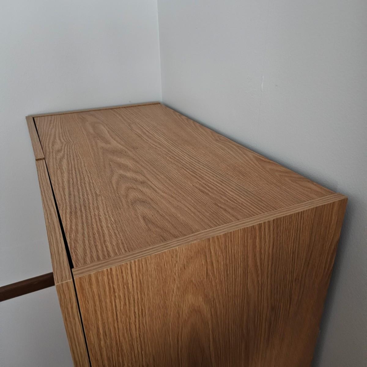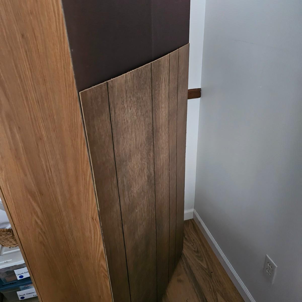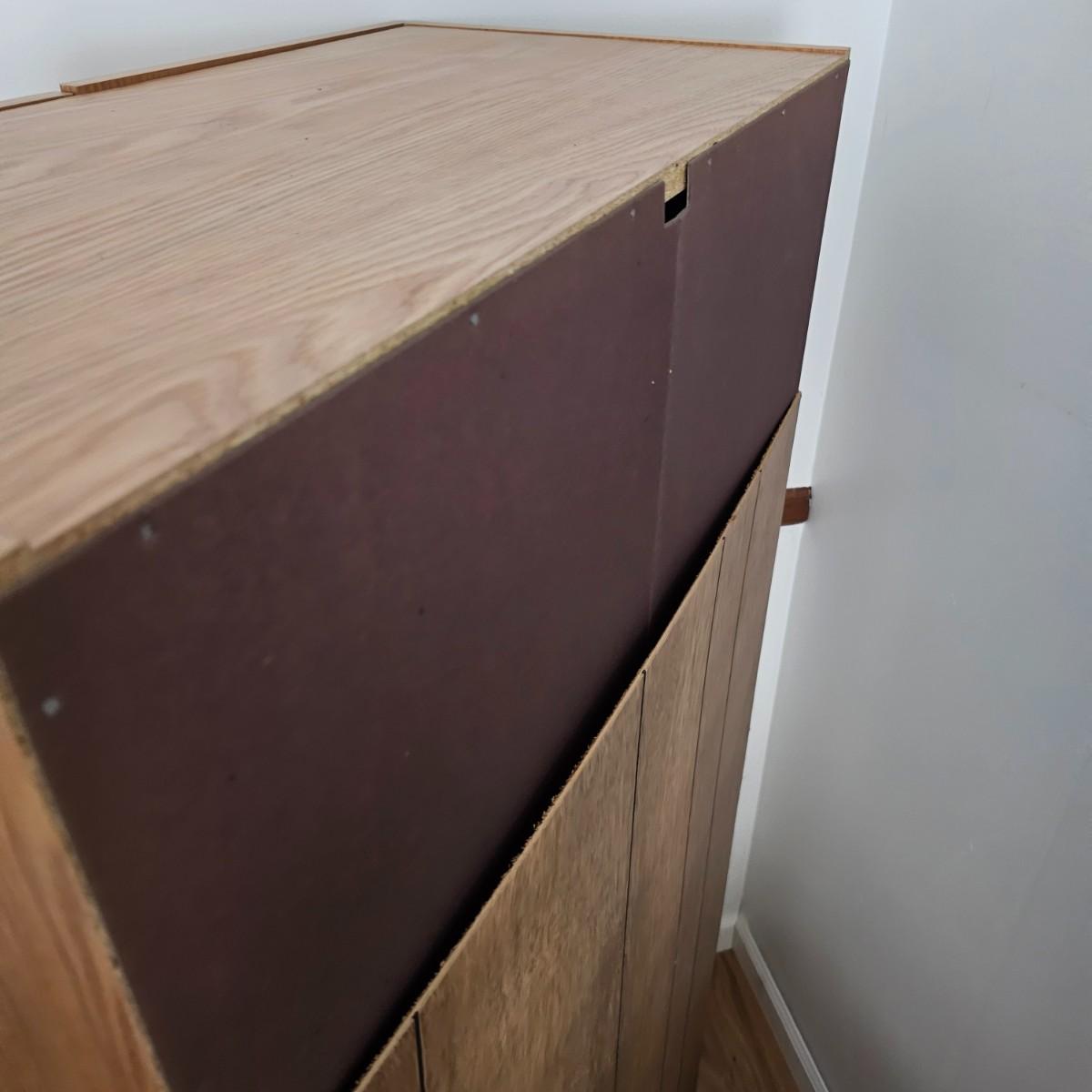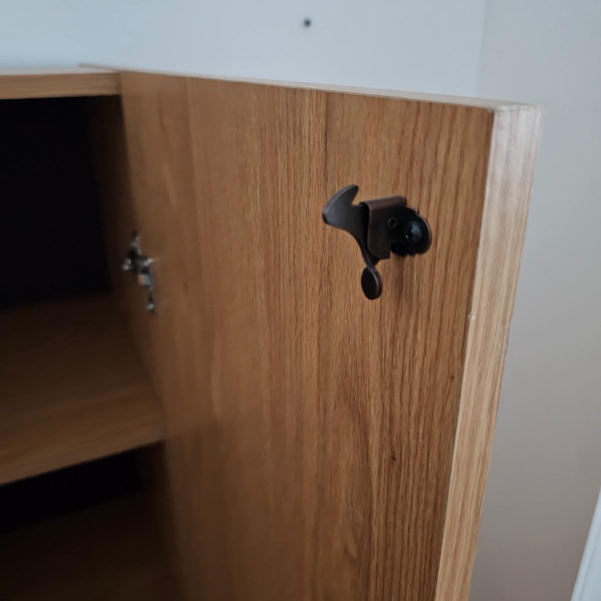 Two storage cabinets made of manufactured wood One large white unit and one wood tone piece. White cabinet measures 21" x 47" x 70.5"H, wood tone is 15.5" x 29" x 60"H. Please note, cabinets are in two different spots. One in garage, other on second floor. White cabinet, part of back cover is loose, and does not include contents shown in photos. See separate lot for canning jars. Tan cabinet has locking door with keys. See photos for details. Local pickup only. Winning bidder must bring assistance to help move and load this item due to its weight and/or size.