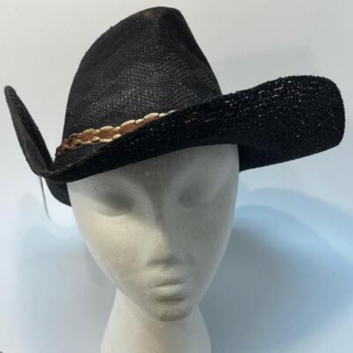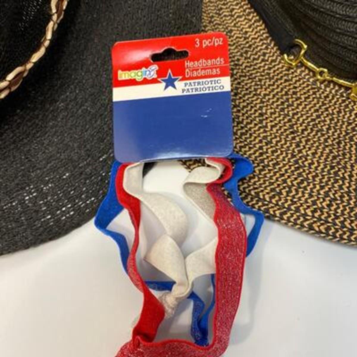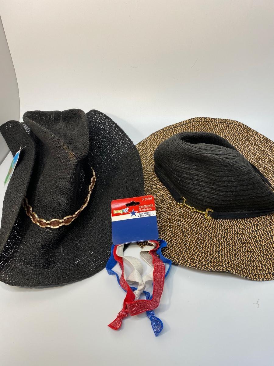 Pair of straw type hats. Black cowboy hat and a floppy hat. Included is a pack of red, white, and blue hair ties