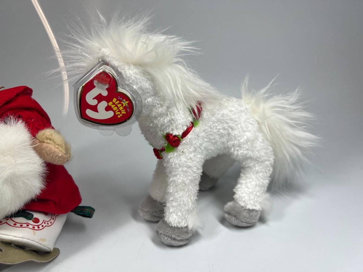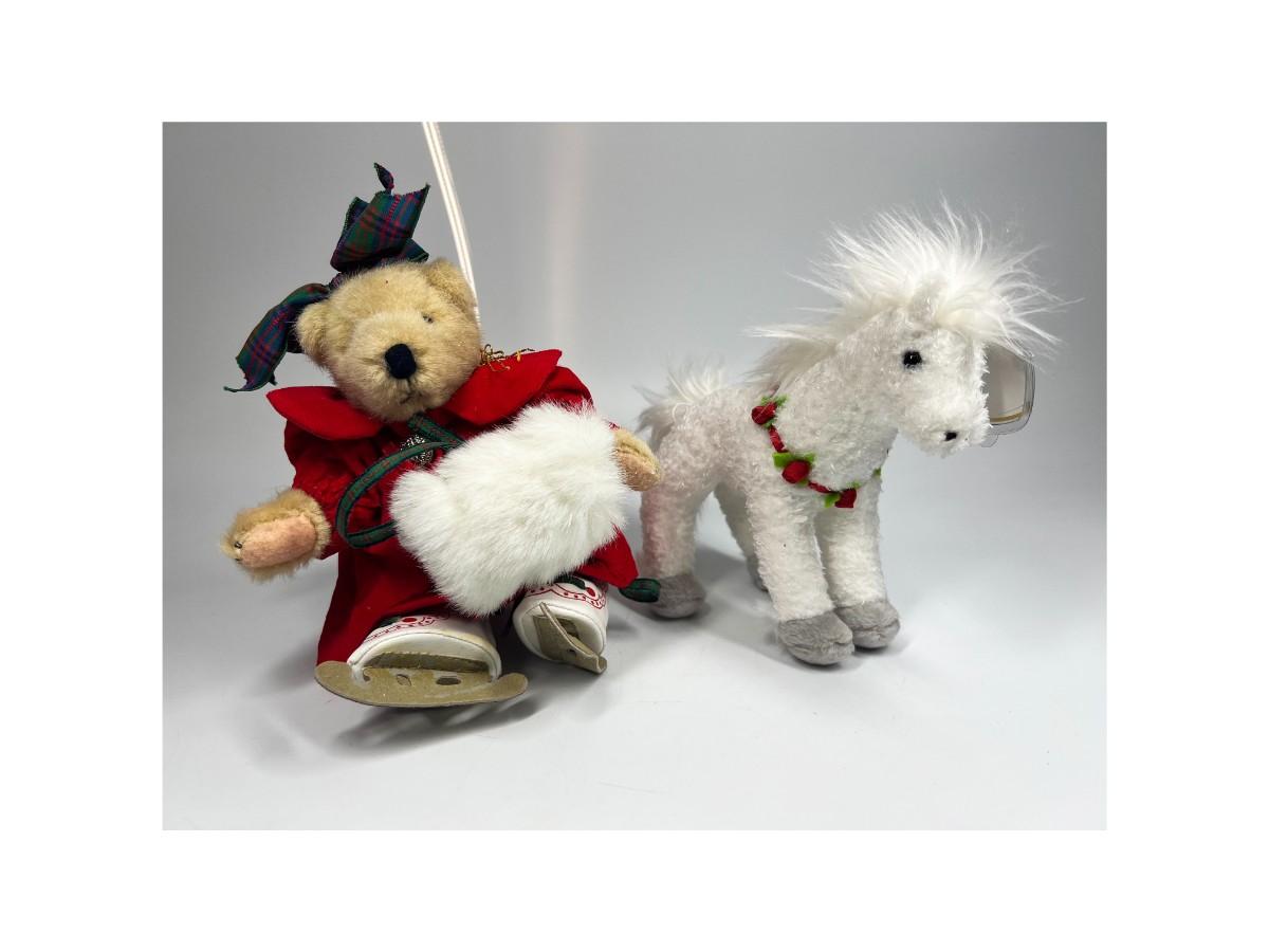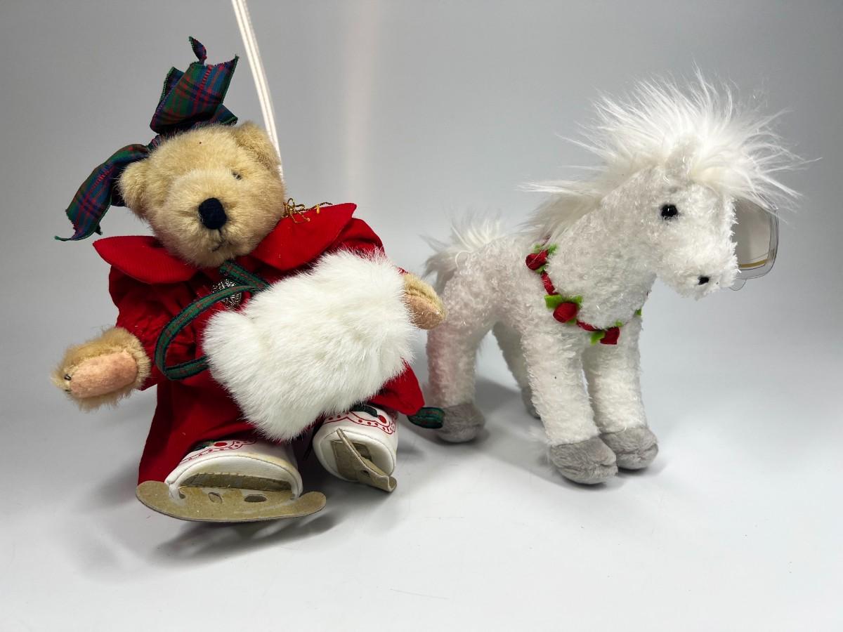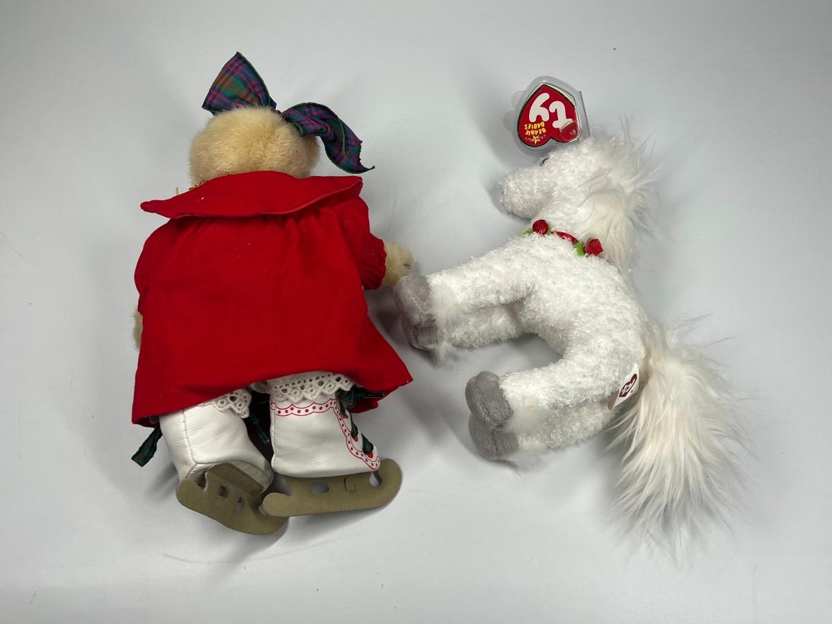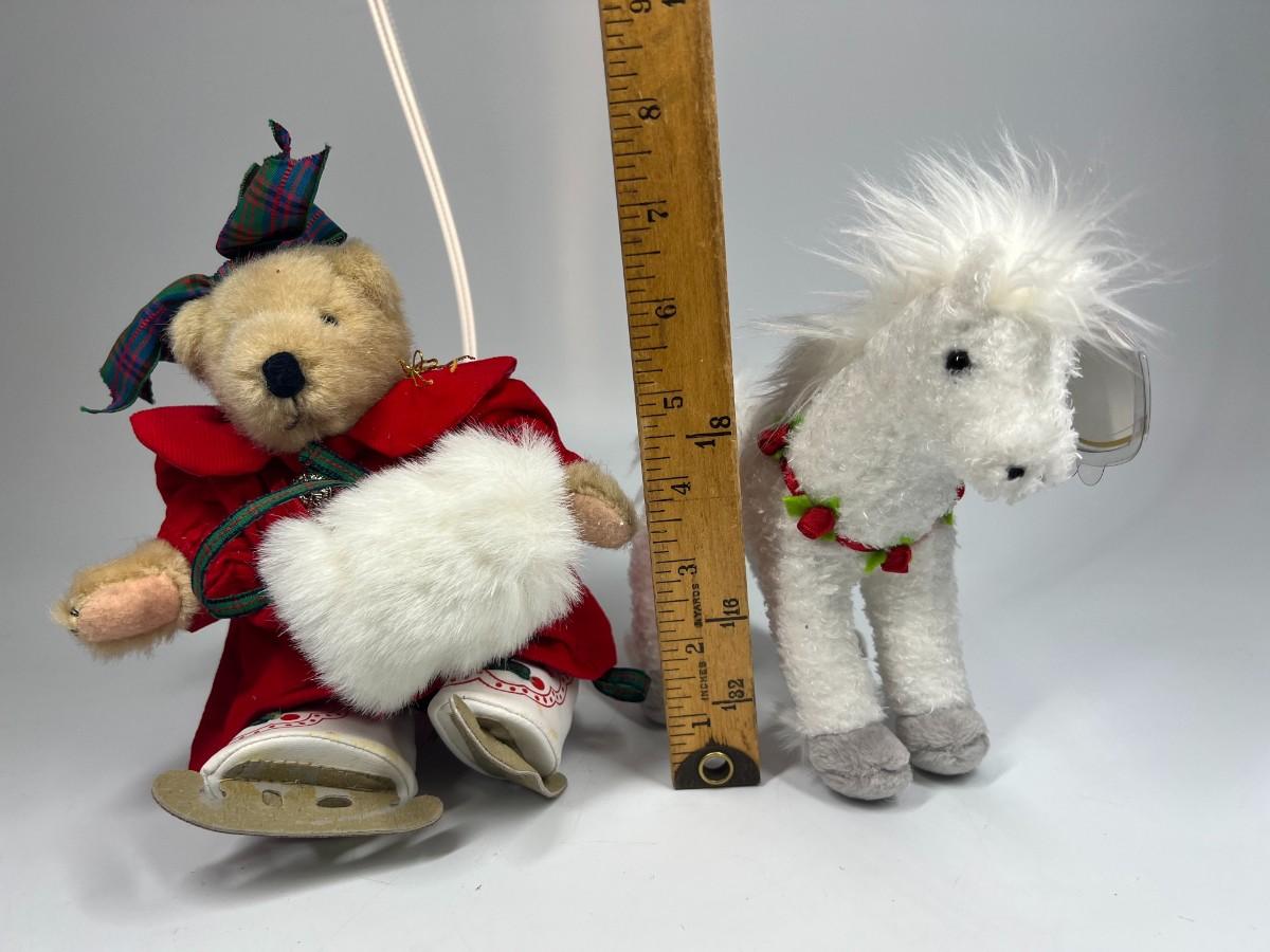 Pair of Stuffed Animal Plushies Ice Skating Christmas Bear and Holly Horse Beanie Baby, there is no significant rips or tears to the plushies and is in good collectible condition. Check pictures for more details and for sizing.