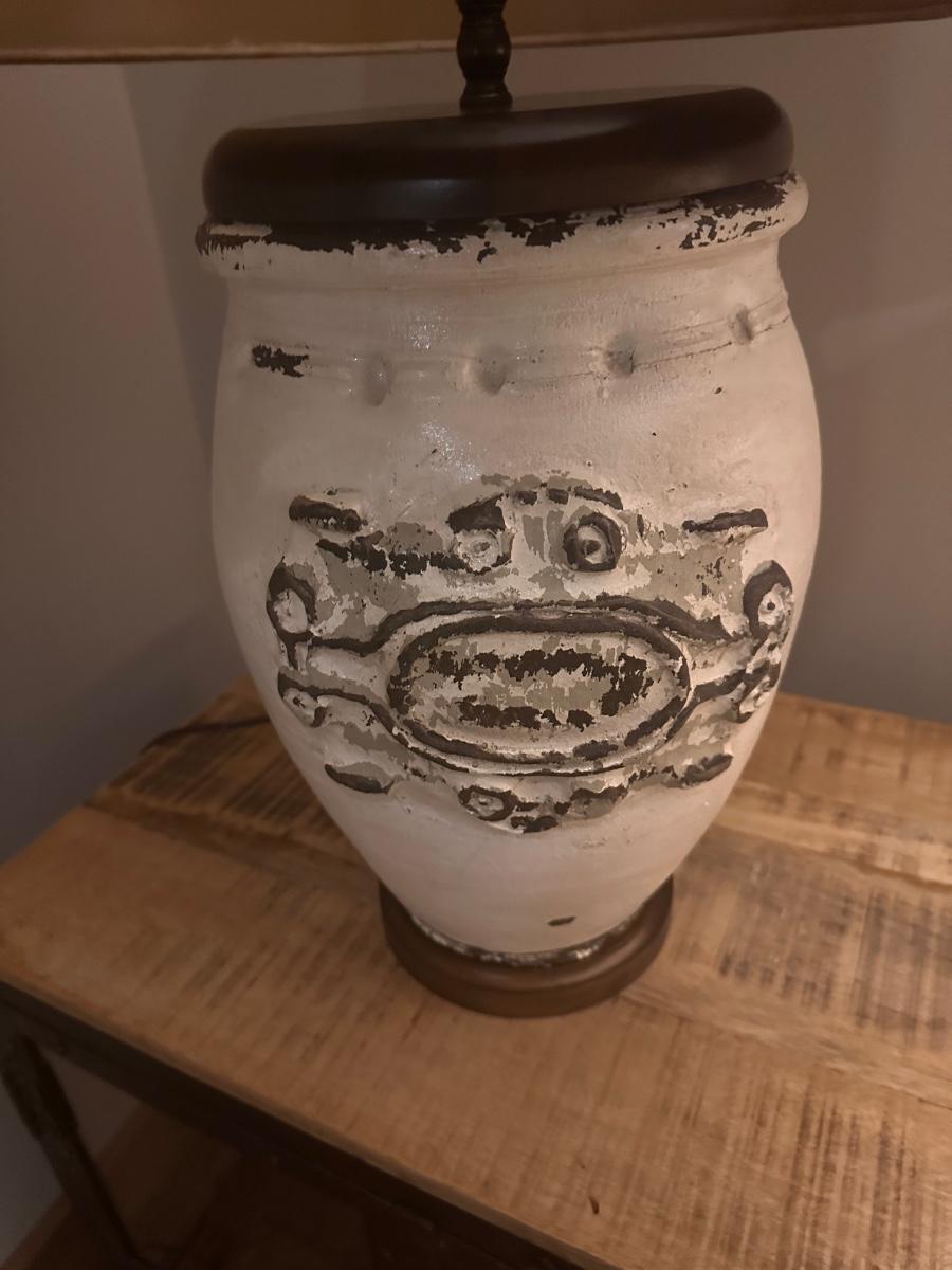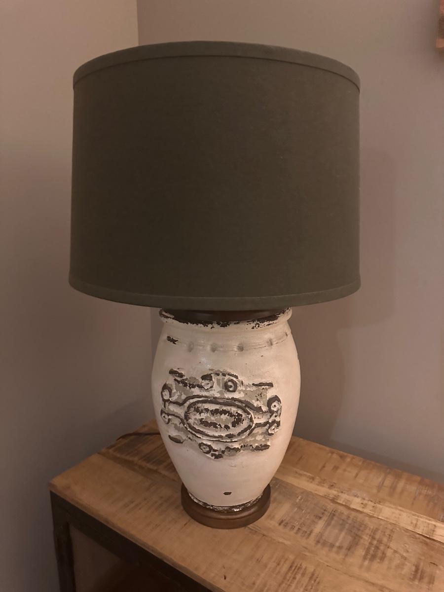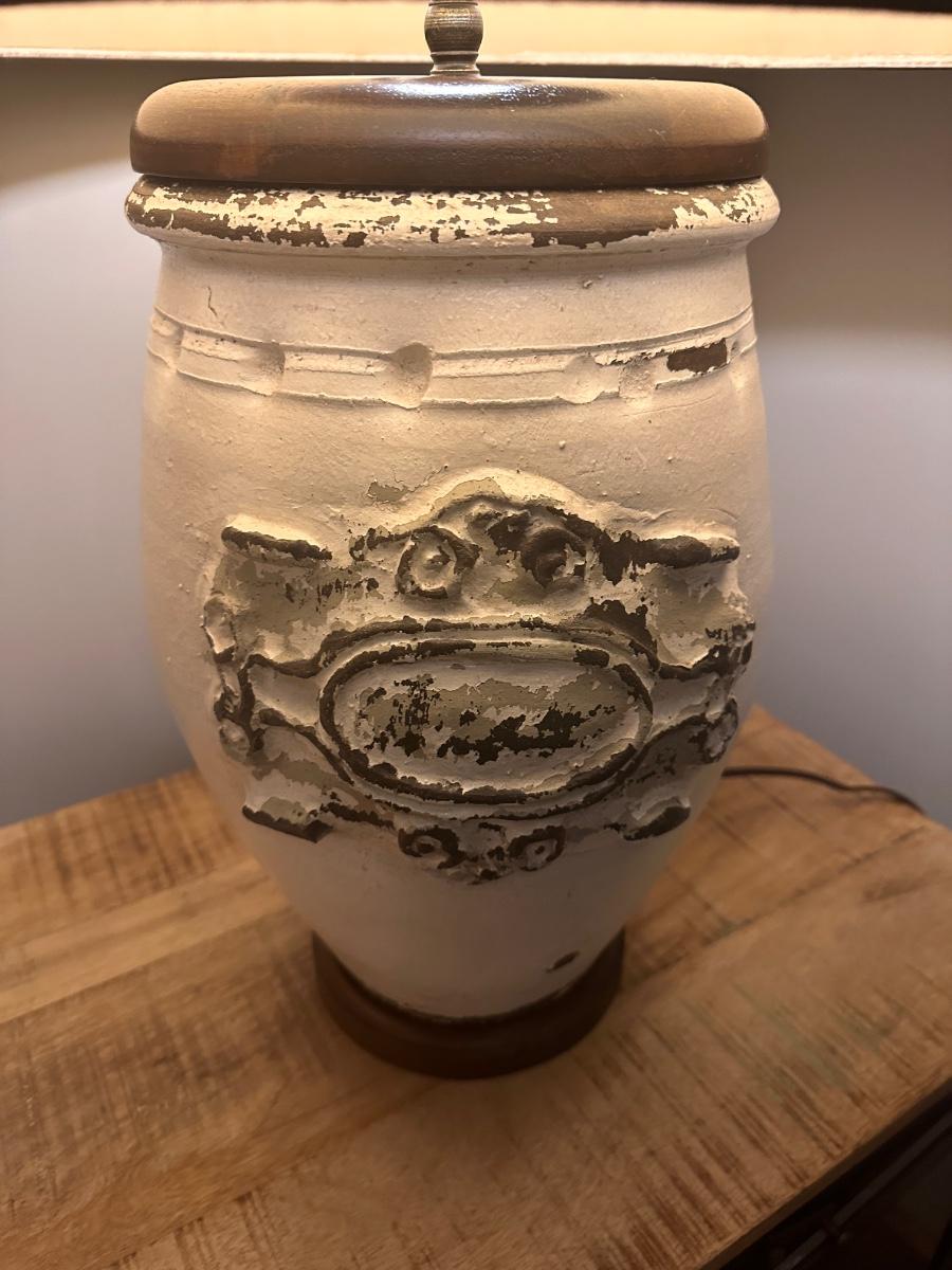 A grand pottery lamp with a grey linen shade, hand made with a wooden base. Produces a warm, rich light and features a layered finish.