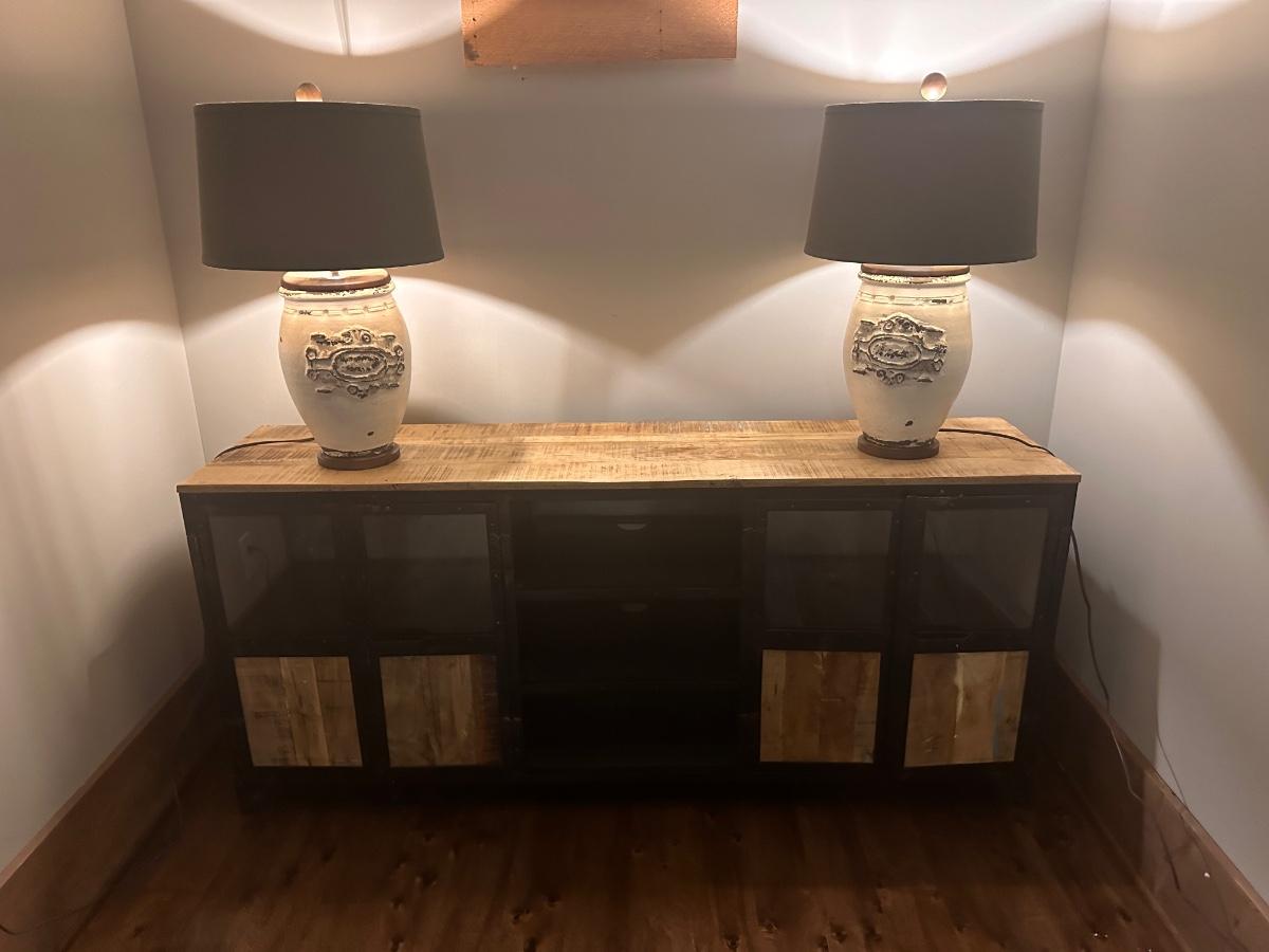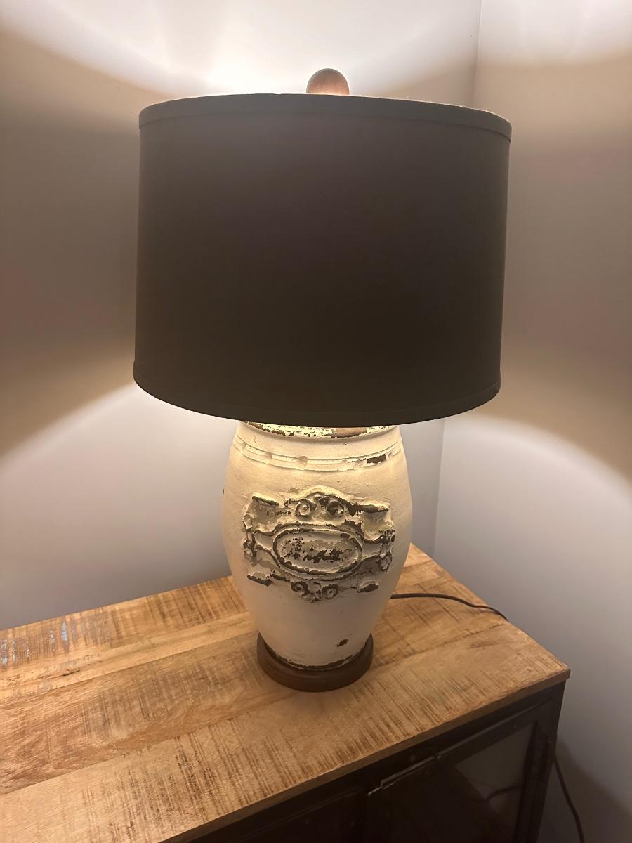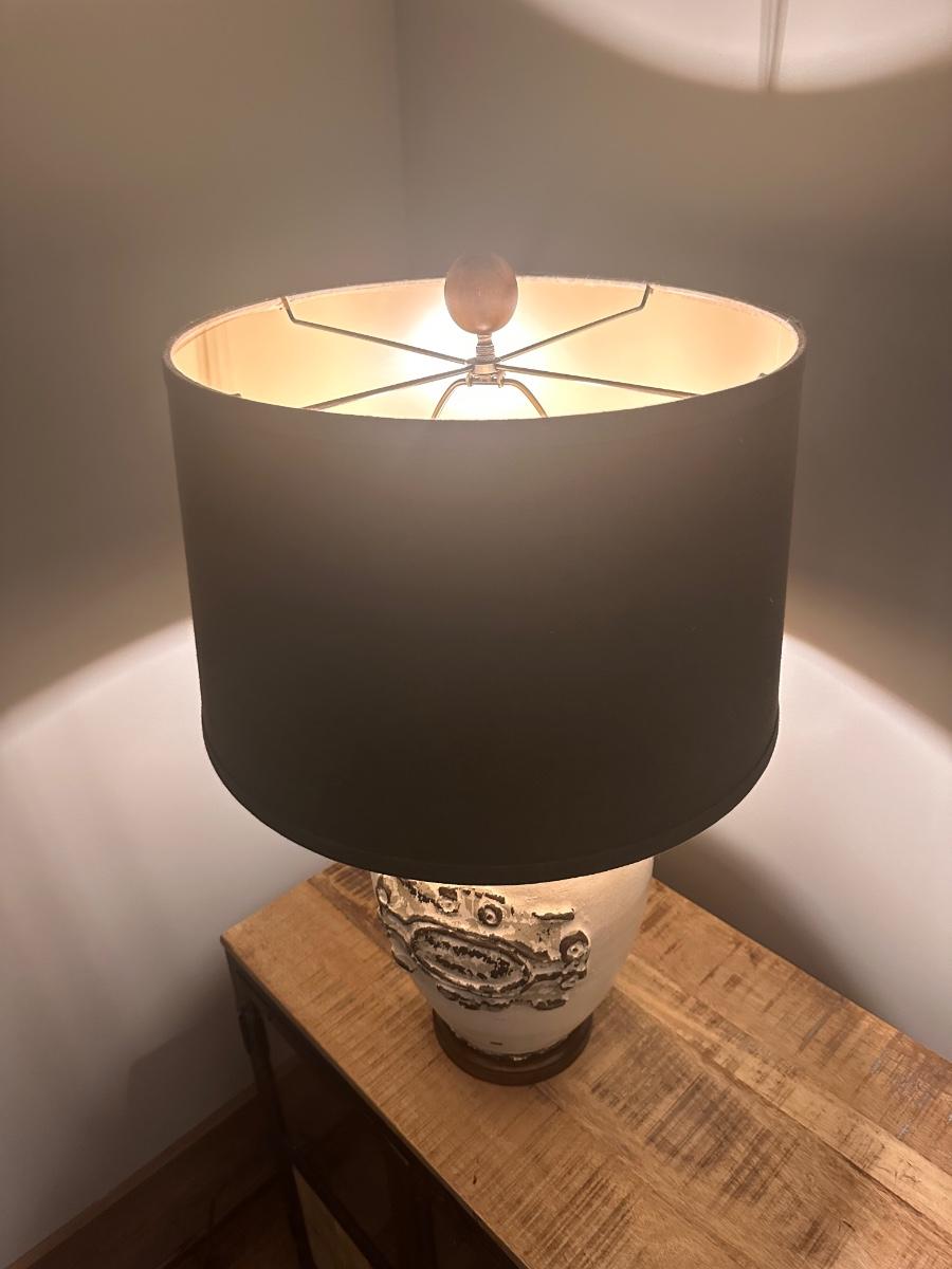 A grand pottery lamp with a grey linen shade, hand made with a wooden base. Produces a warm, rich light and features a layered finish.