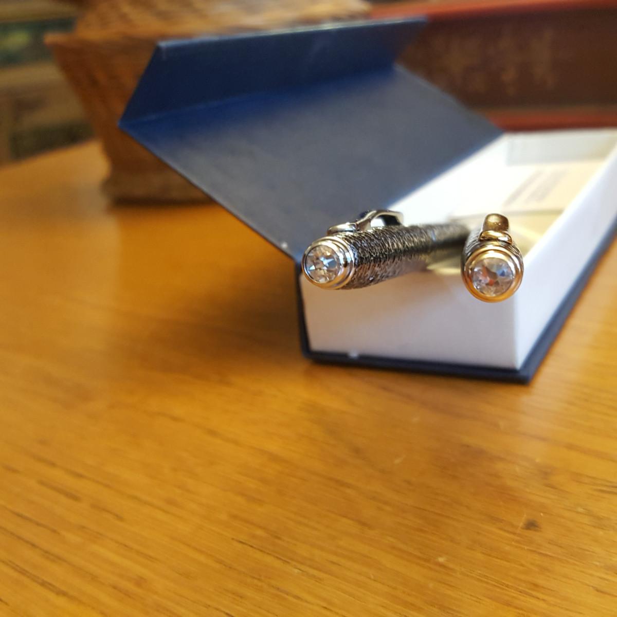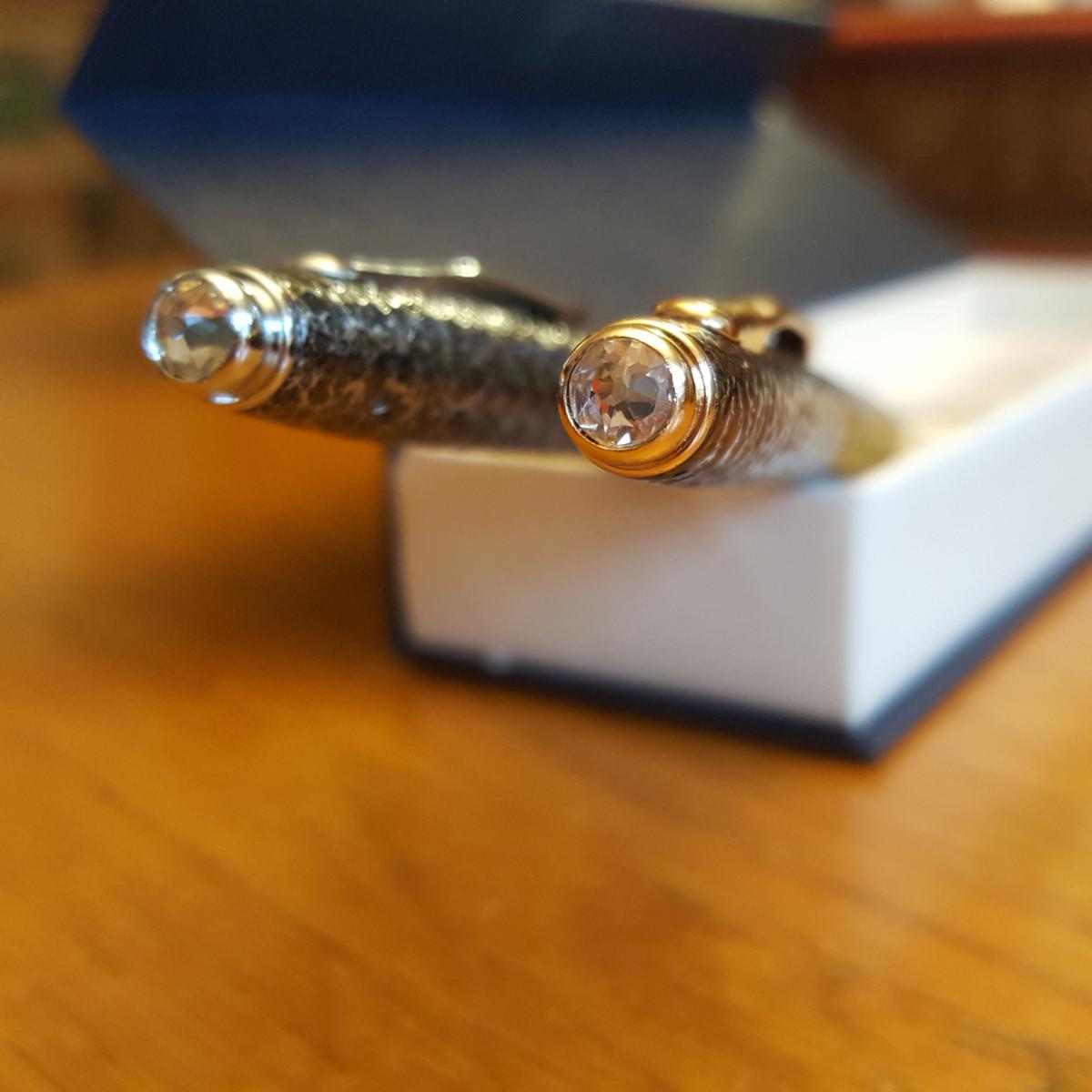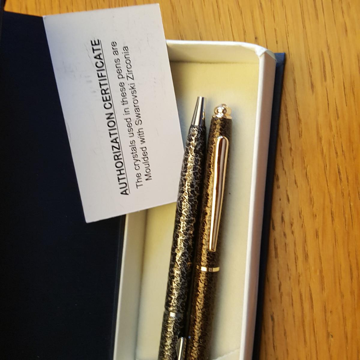 This auction lot is for a Pair of Swarovski Gem Studded Writing Pens. These beautiful writing pens are enhanced by a large clear Swarovski Gem mounted to the top of each. One pen is brown and the other is blue, both have blue ink. Nice showy set - great for gifting or using.