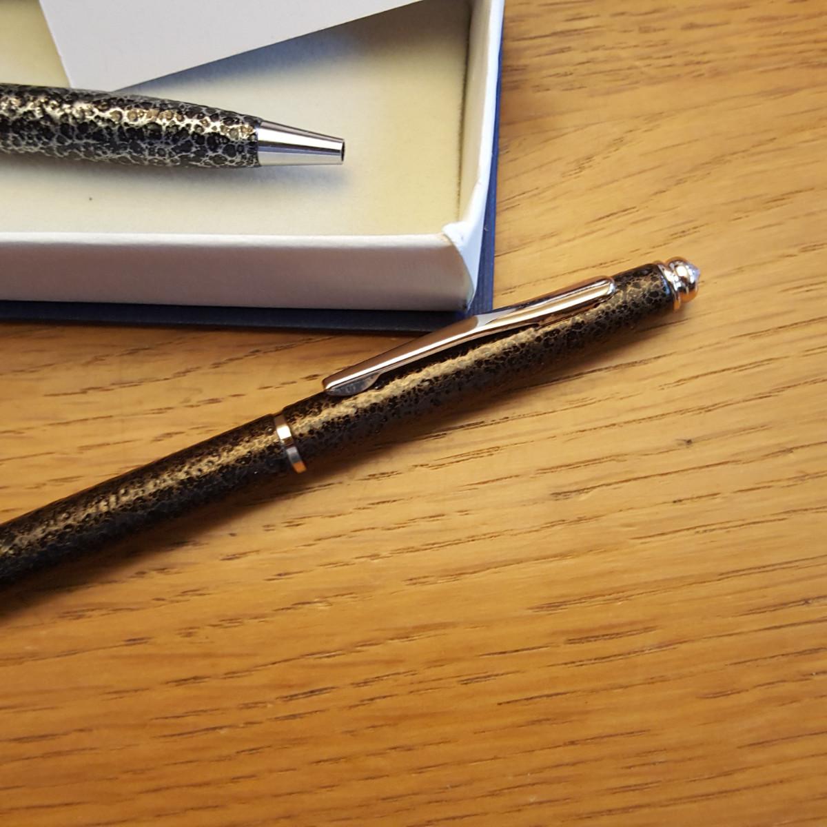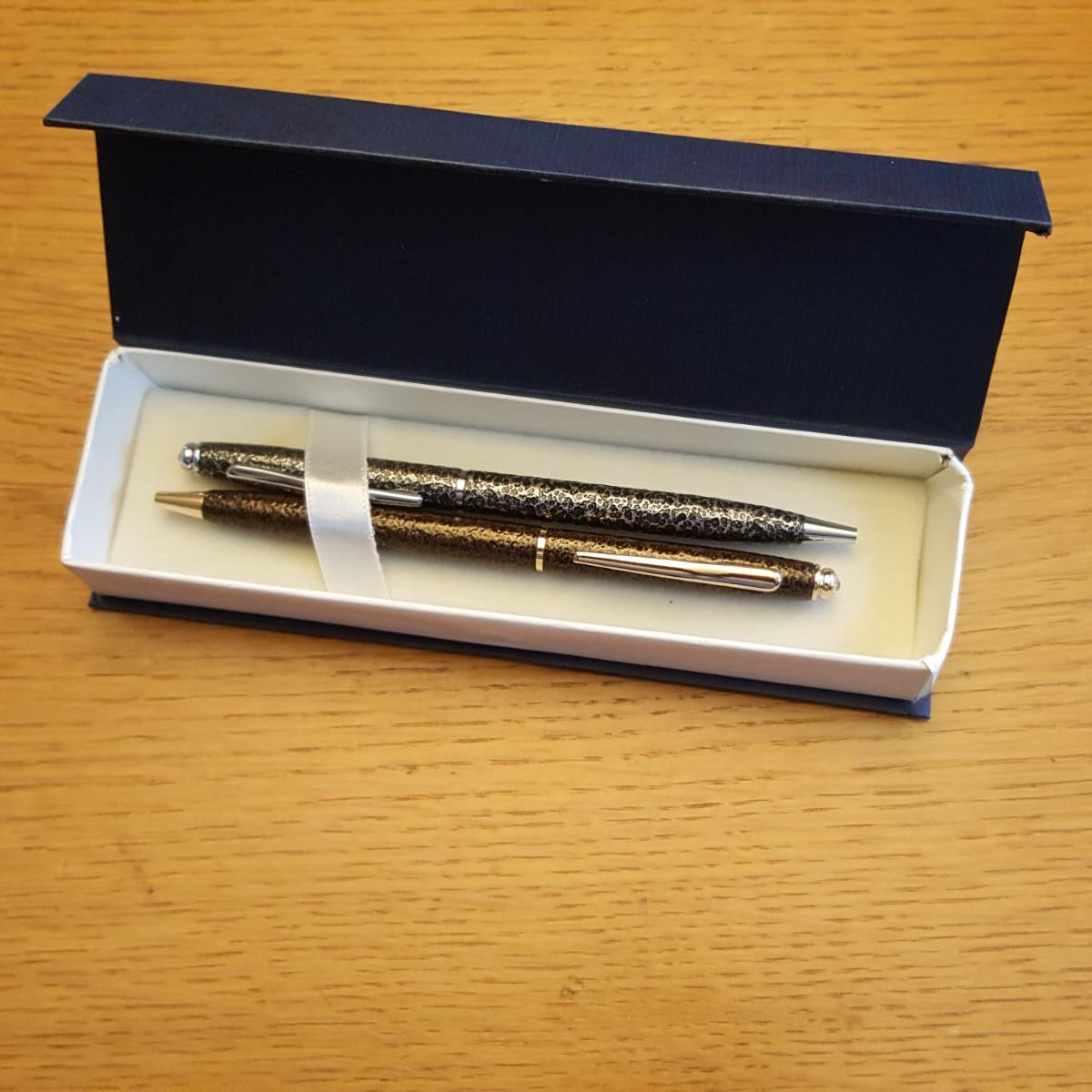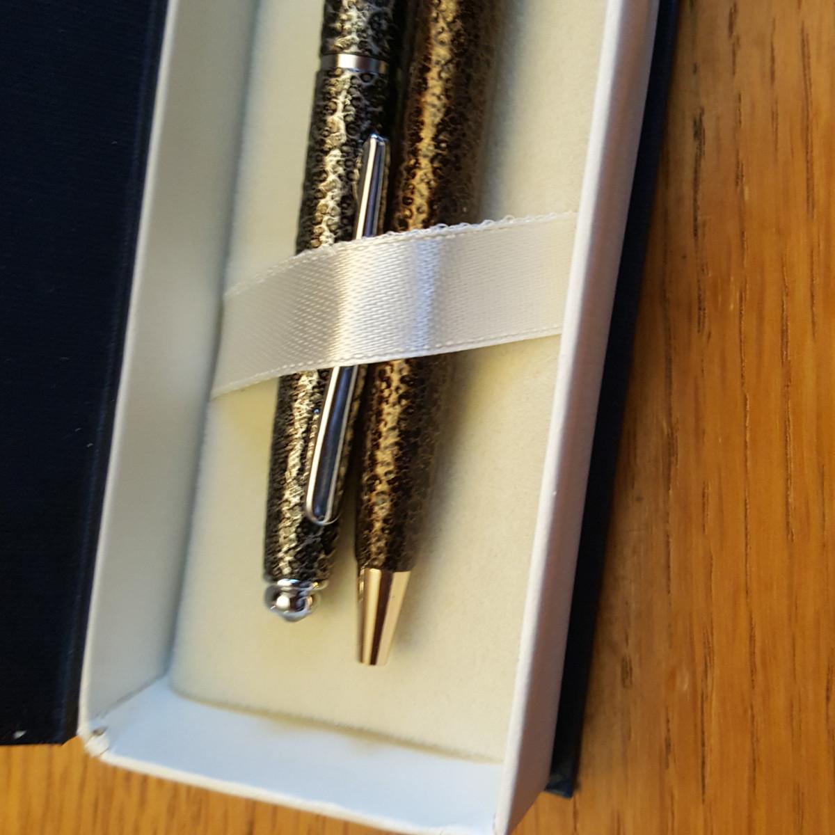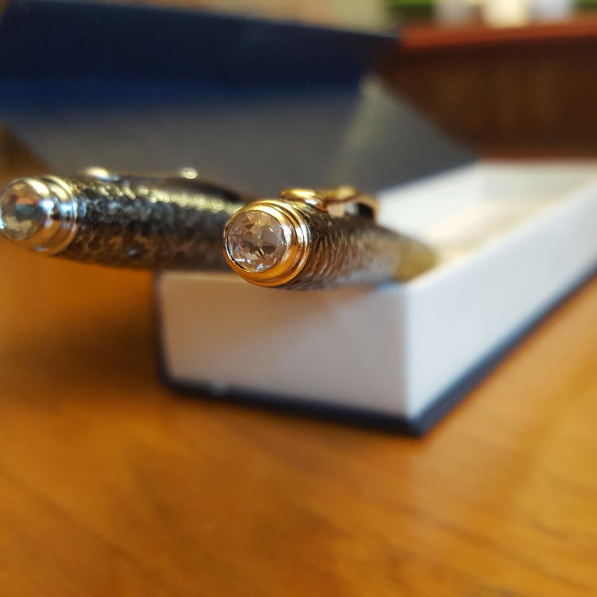 This auction lot is for a Pair of Swarovski Gem Studded Writing Pens. These beautiful writing pens are enhanced by a large clear Swarovski Gem mounted to the top of each. One pen is brown and the other is blue, both have blue ink. Nice showy set - great for gifting or using.