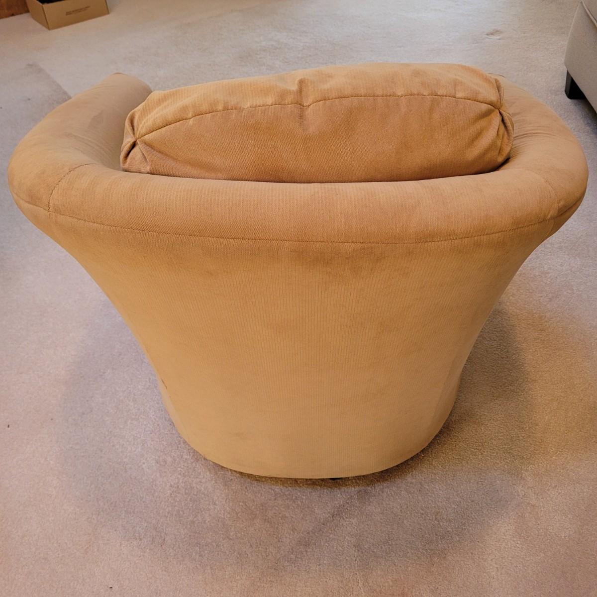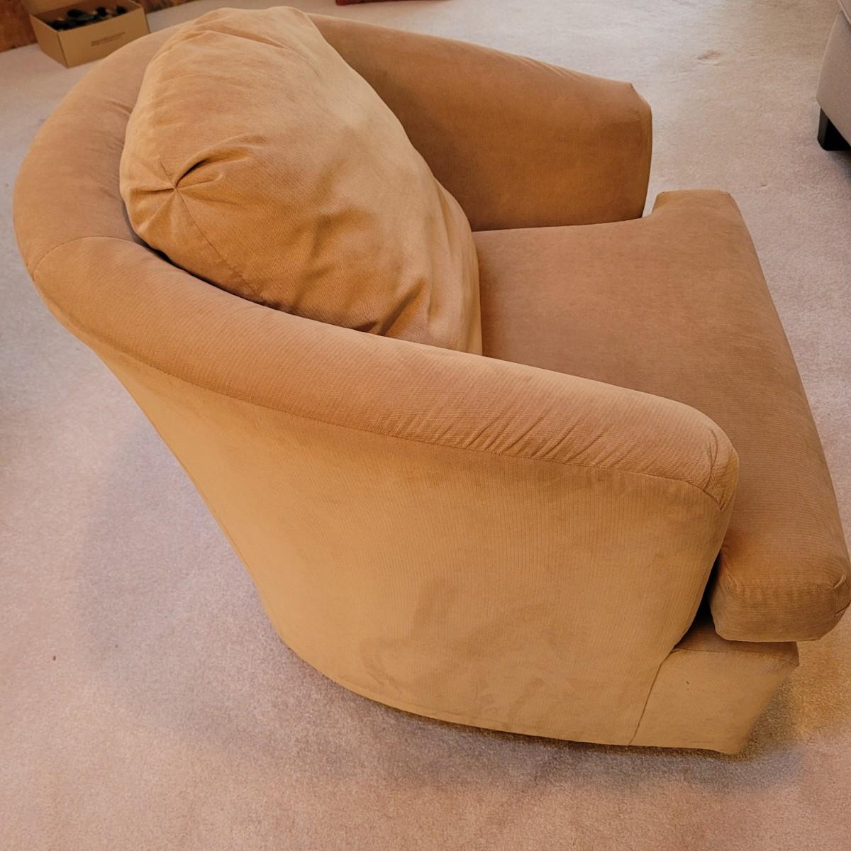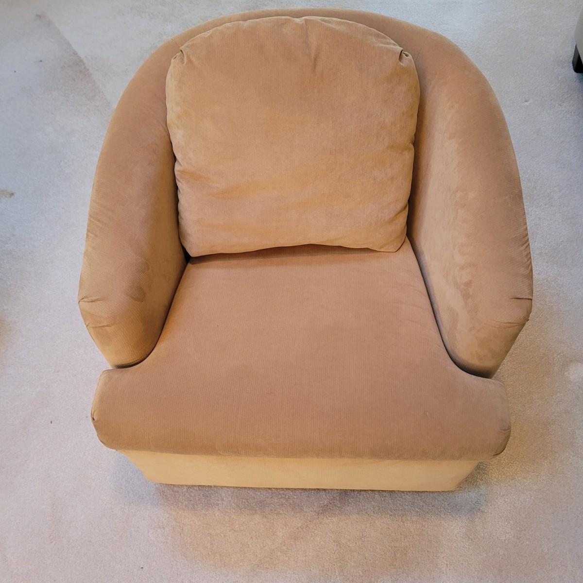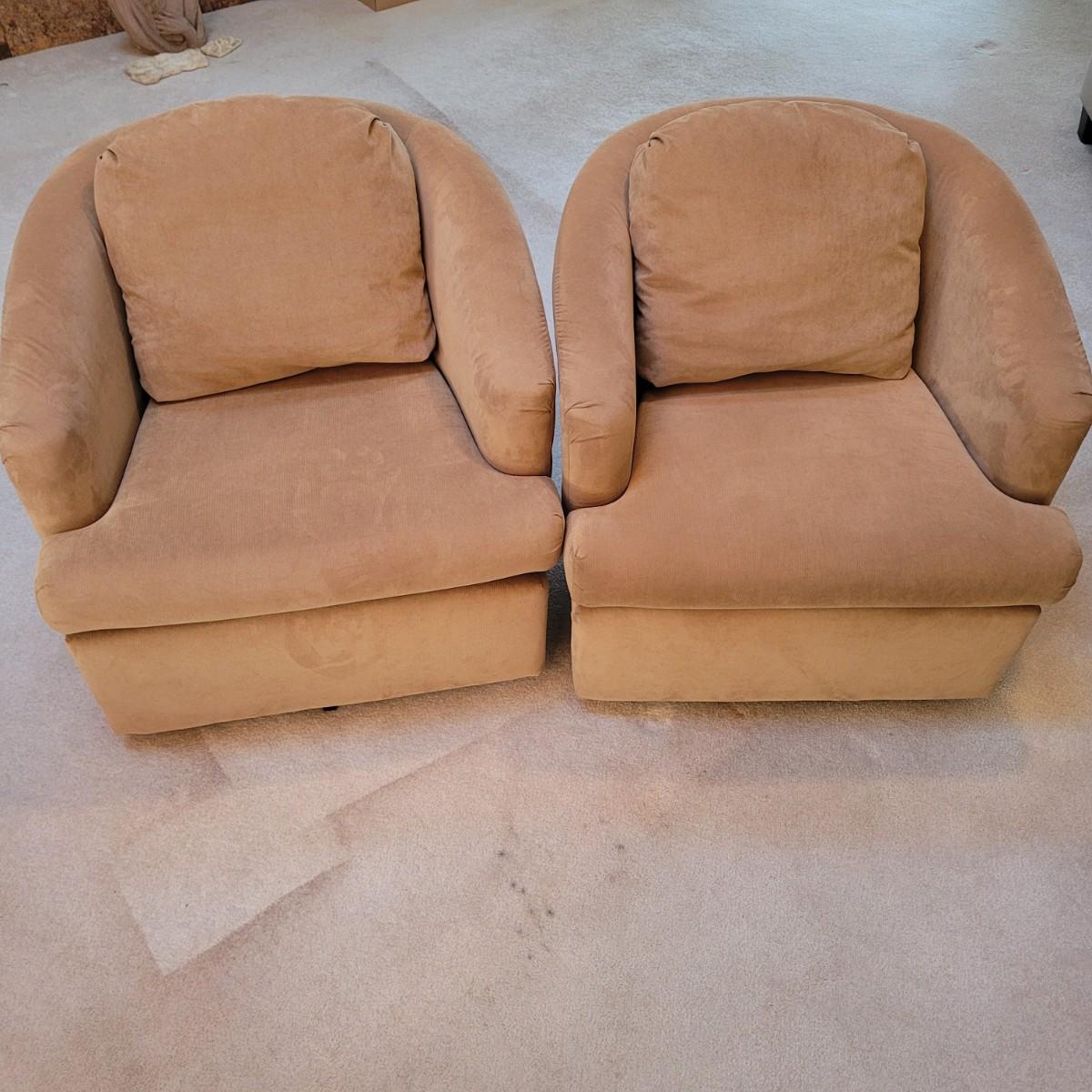 This lot includes a pair of swivel chairs made by Best Chairs Inc. in Indiana. Made from 100% polyester. Featuring removable cushions for easy cleaning. Chairs swivel freely 360°. Both chairs are in good condition with no stains or tears. Individually, the chairs measure 30" x 33" x 33"H, with a seat height of 17".