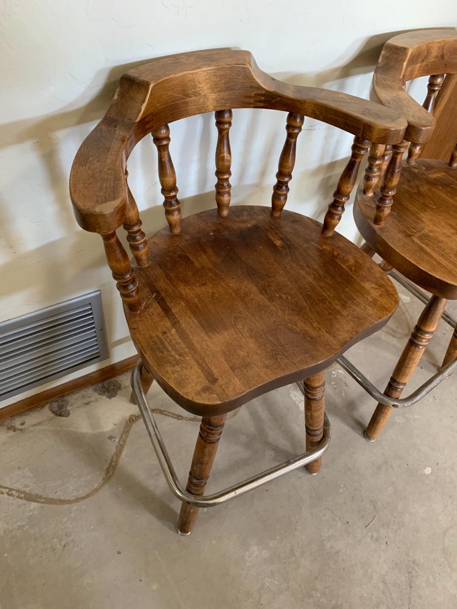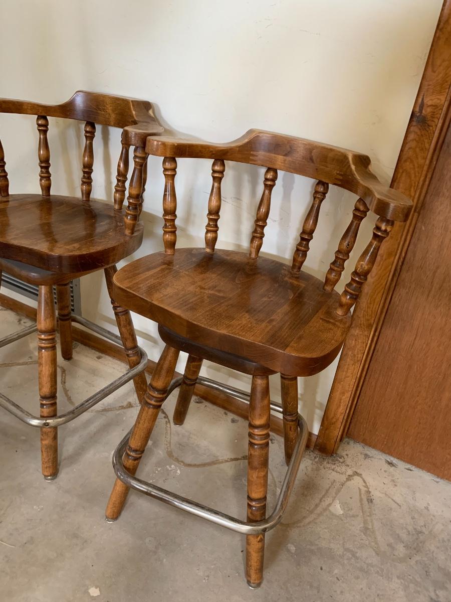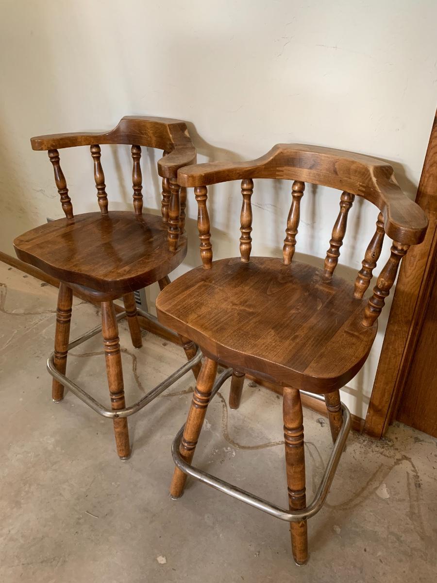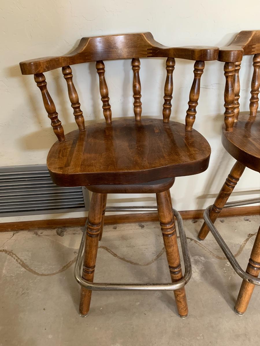 Vintage wood bar stools with spindle details. Stools swivel. There is a wear mark on the side of the back (on both) where is looks like it bumped into something, otherwise good condition. There is a metal foot rest on the bottom. Back height 35”, seat height 25”, seat depth 16”, seat width 18”.
