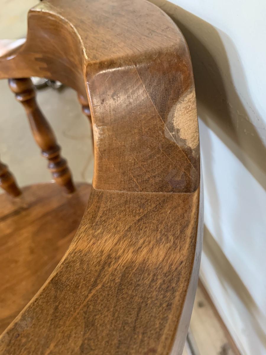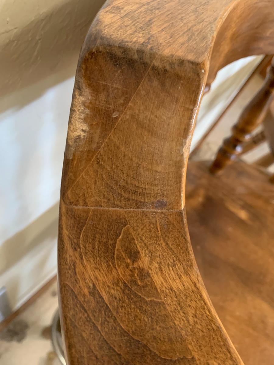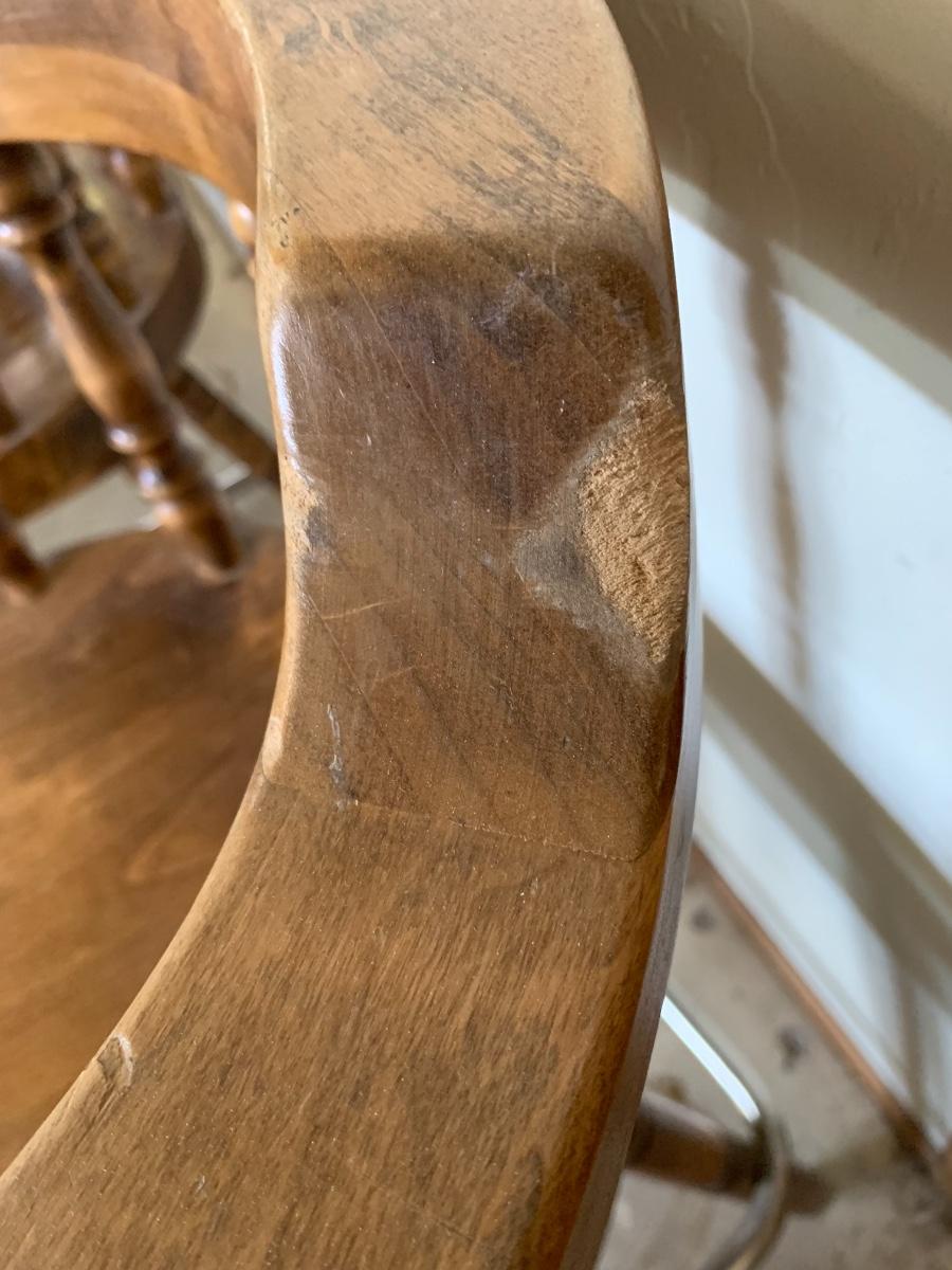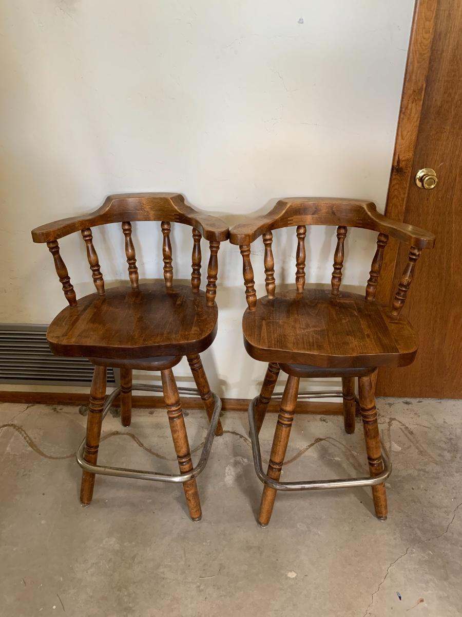 Vintage wood bar stools with spindle details. Stools swivel. There is a wear mark on the side of the back (on both) where is looks like it bumped into something, otherwise good condition. There is a metal foot rest on the bottom. Back height 35”, seat height 25”, seat depth 16”, seat width 18”.
