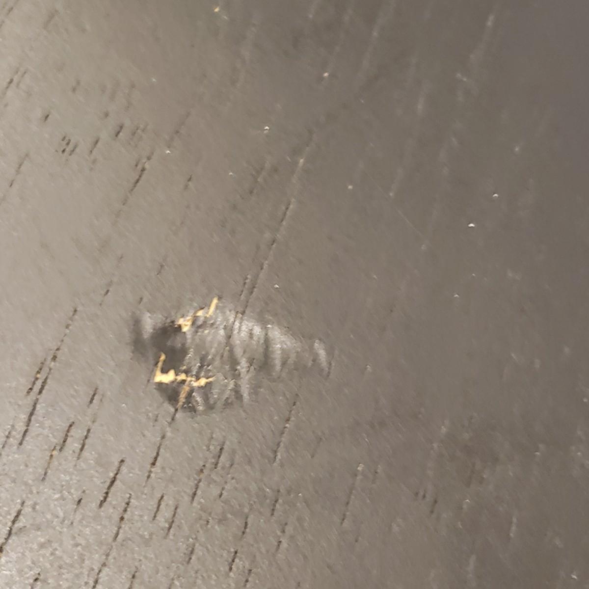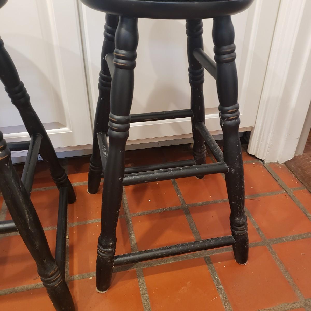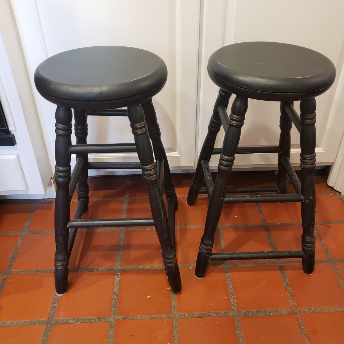 This is a wooden pair of swivel top stools. It has a black finished with stressed spots that are intentional on the rim of seat and legs. There is a dent on the top of the second stool, see picture. Each stool measures 15" x 24"H.