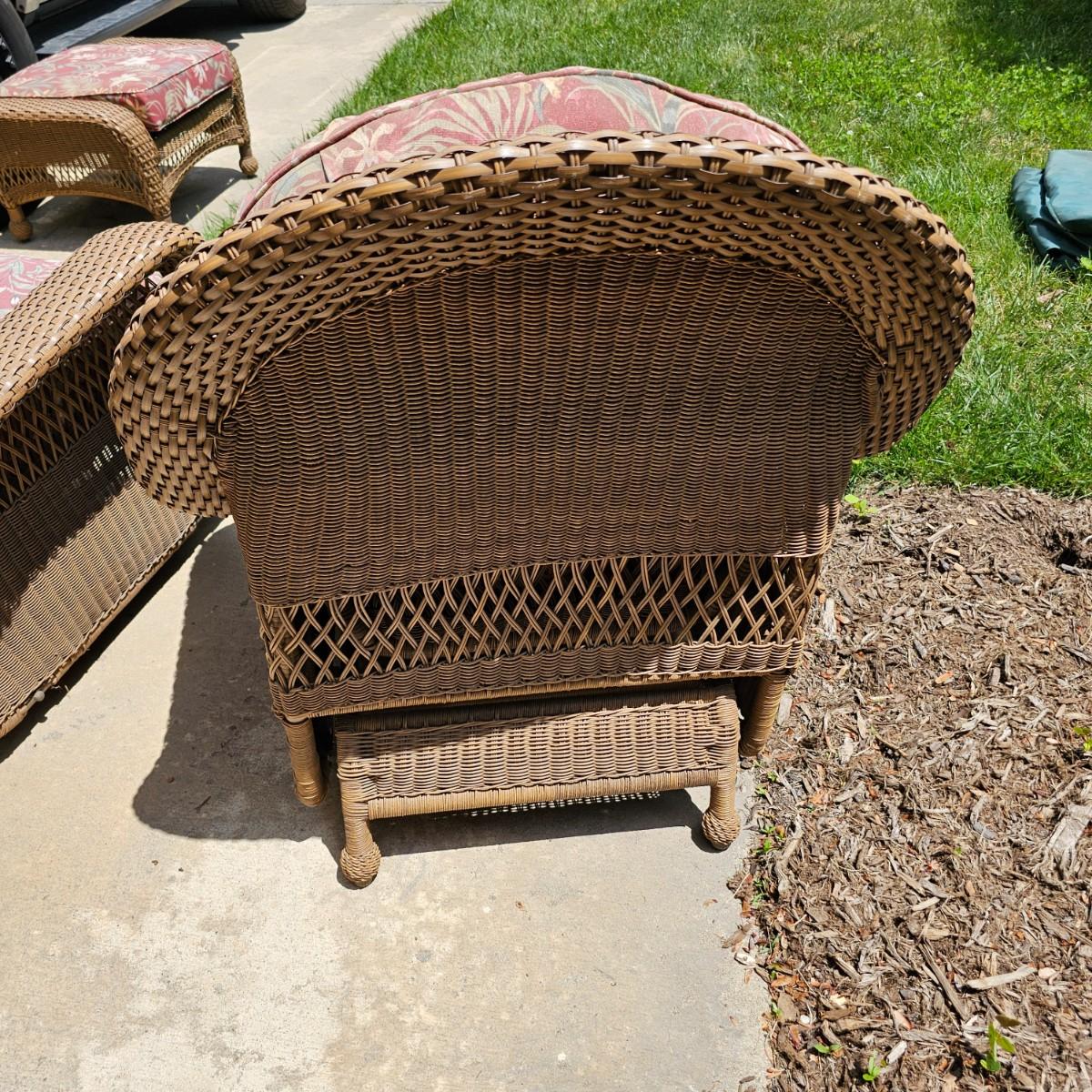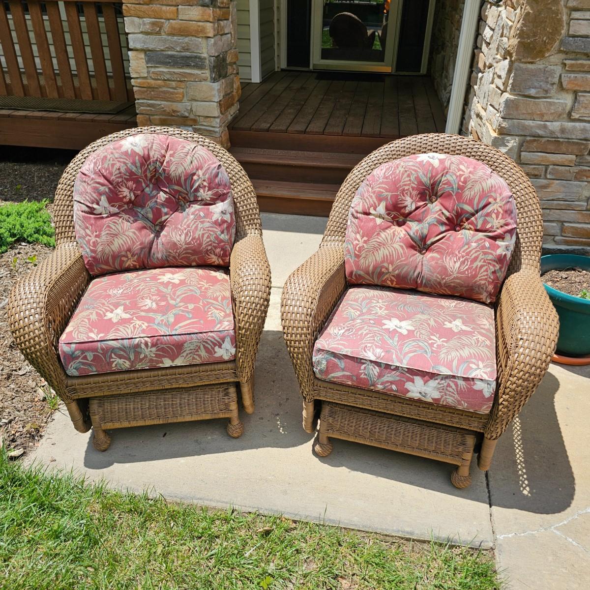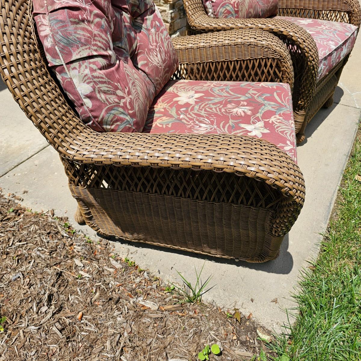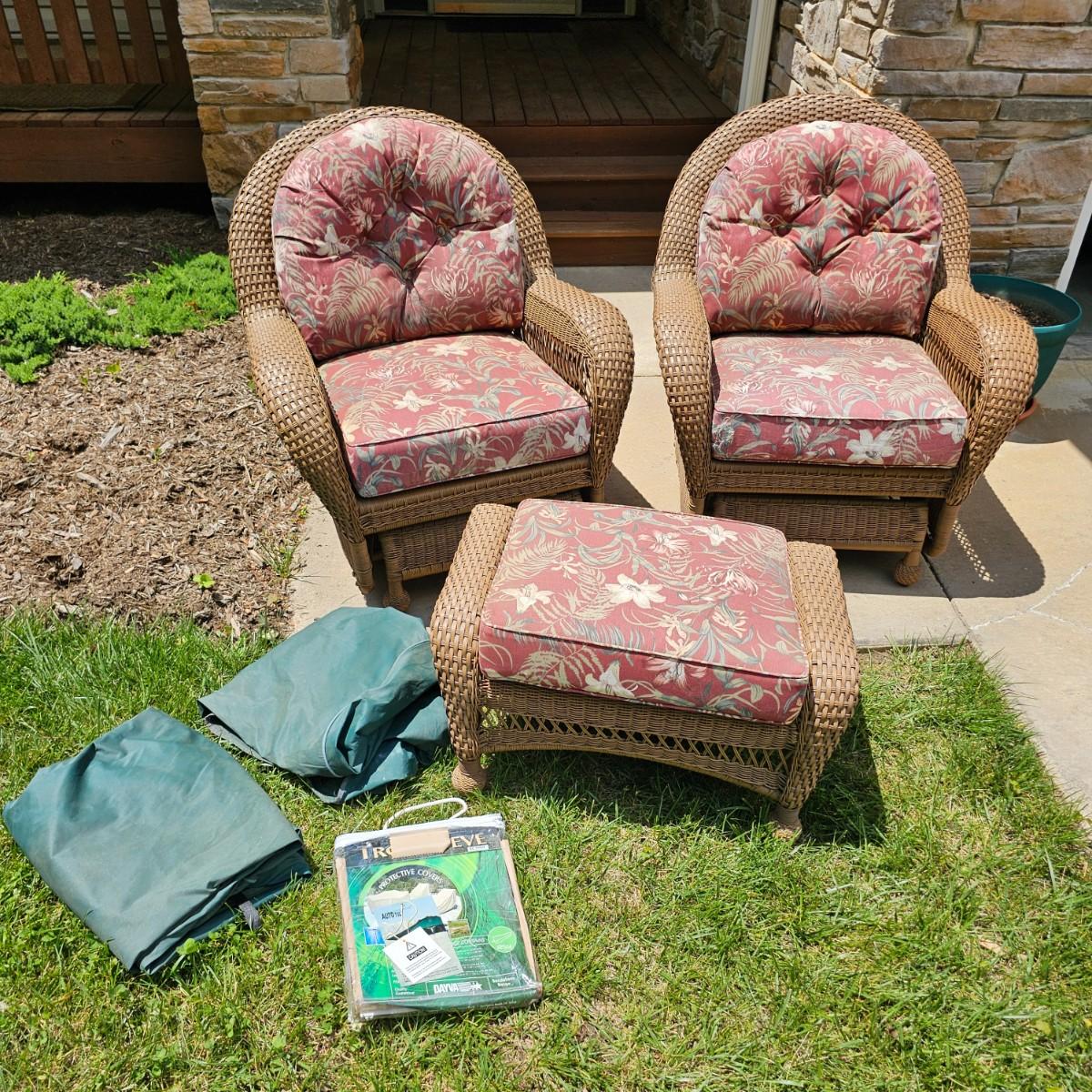 Two brown-tone faux Rattan rockers/gliders with matching ottoman, cushions and covers. Rounded backs and wide armrests, they measure 34" x 32" x 37"H with a 20" seat height. Ottoman is 29" x 20" x 16"H, has 17" seat height. Three protective vinyl covers included. Some sun fade and spots on cushions. See photos for details. Local pickup only.