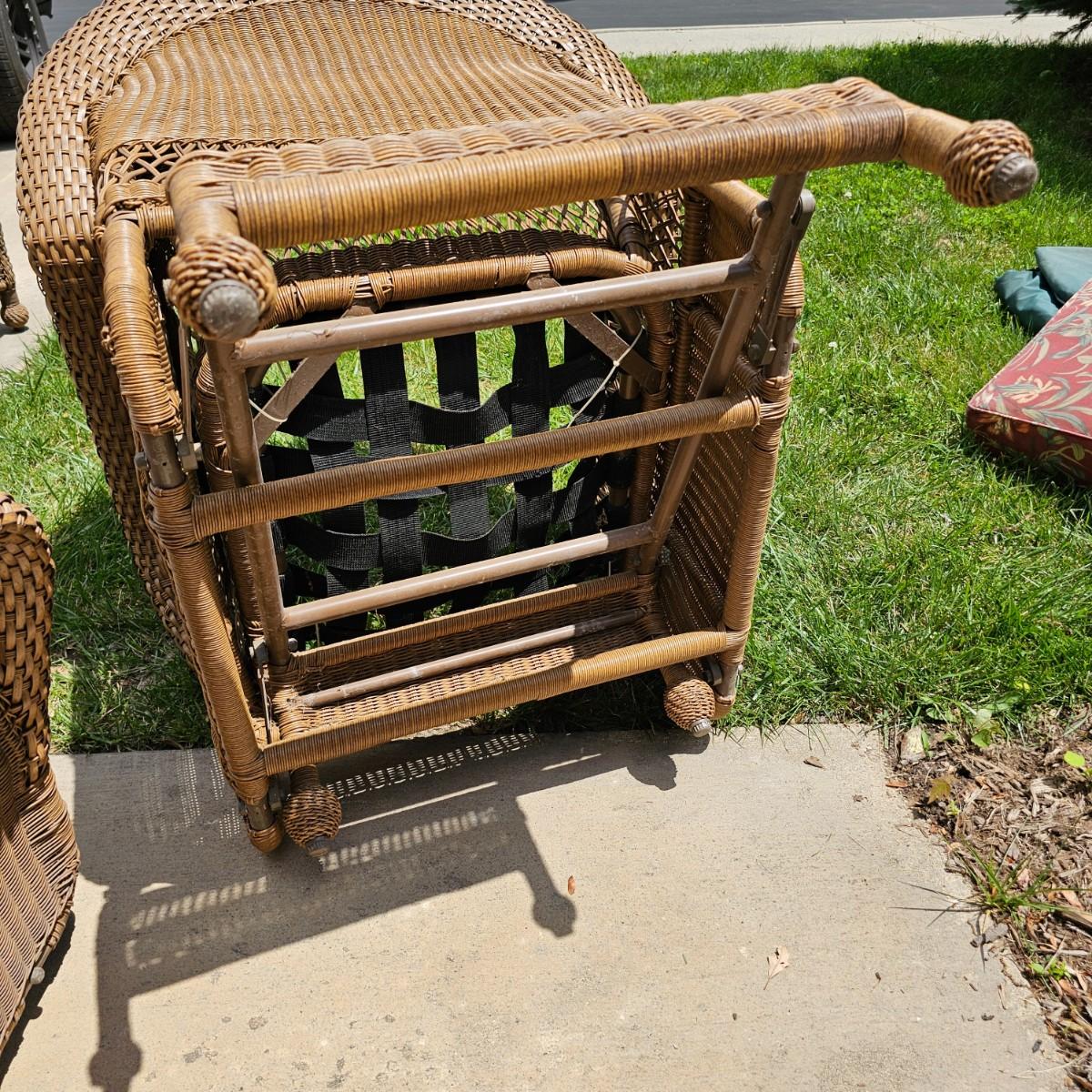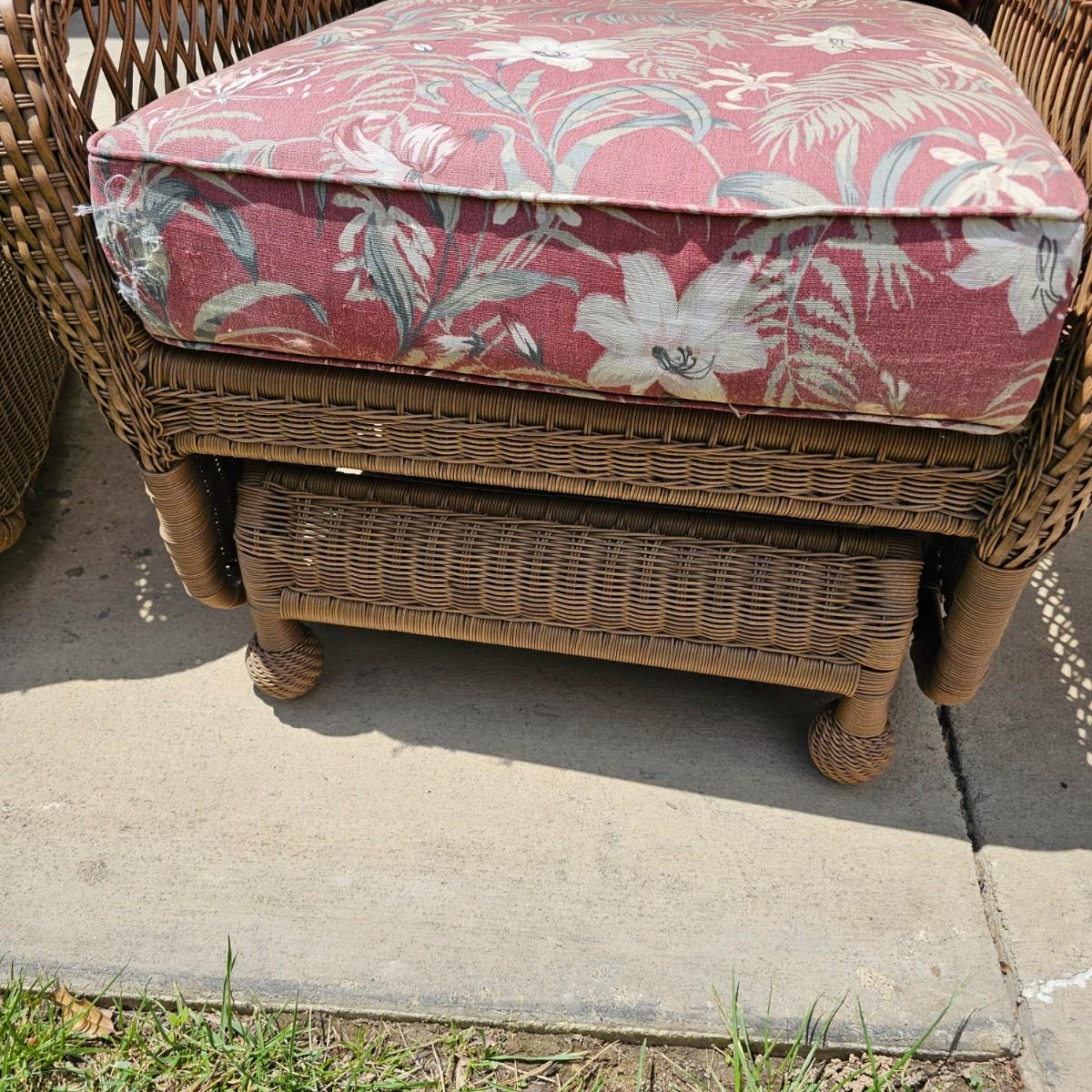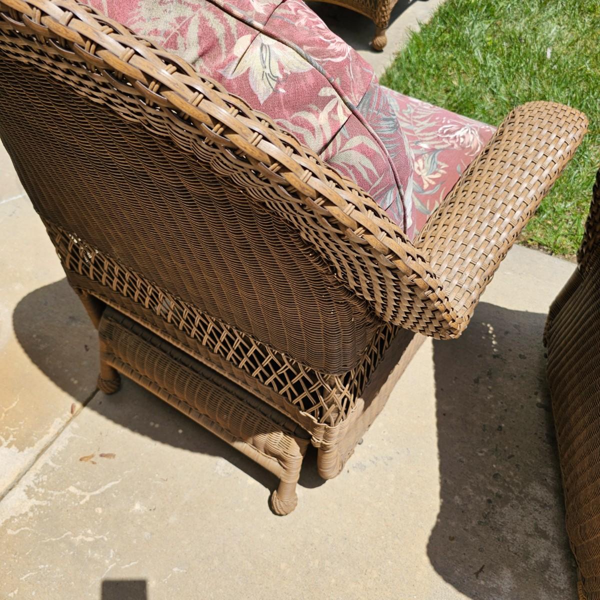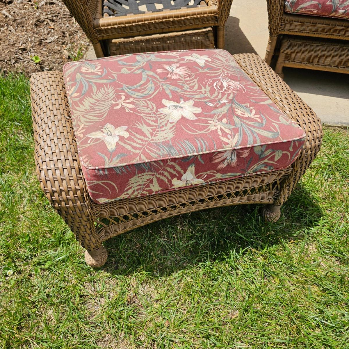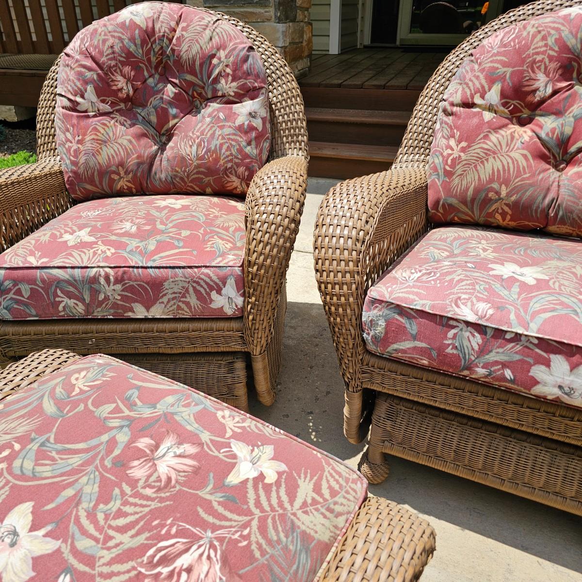 Two brown-tone faux Rattan rockers/gliders with matching ottoman, cushions and covers. Rounded backs and wide armrests, they measure 34" x 32" x 37"H with a 20" seat height. Ottoman is 29" x 20" x 16"H, has 17" seat height. Three protective vinyl covers included. Some sun fade and spots on cushions. See photos for details. Local pickup only.