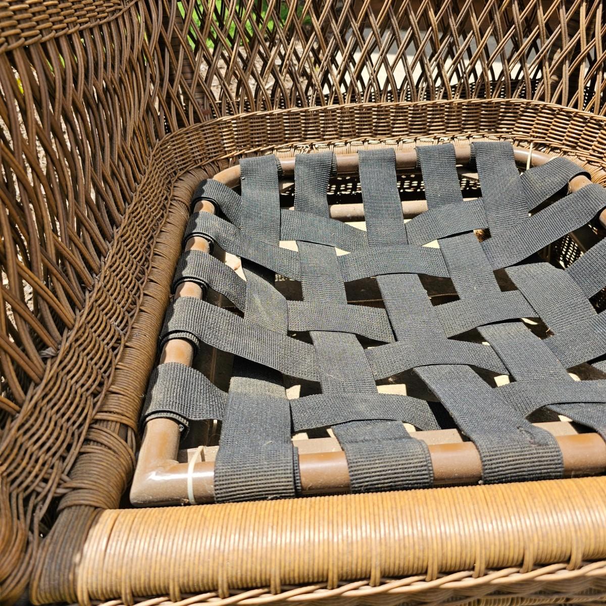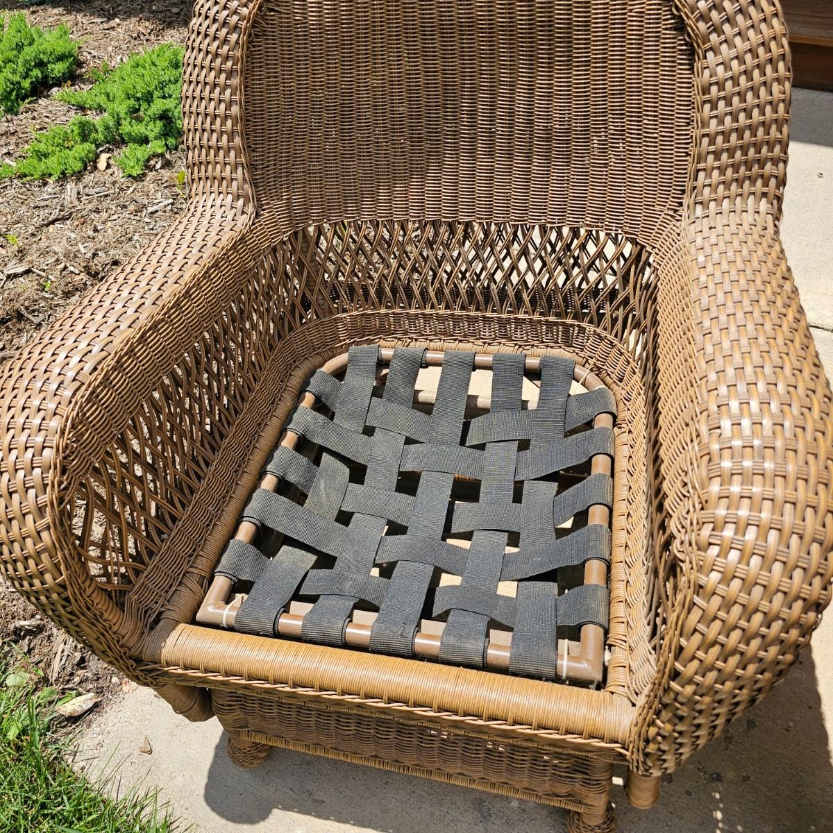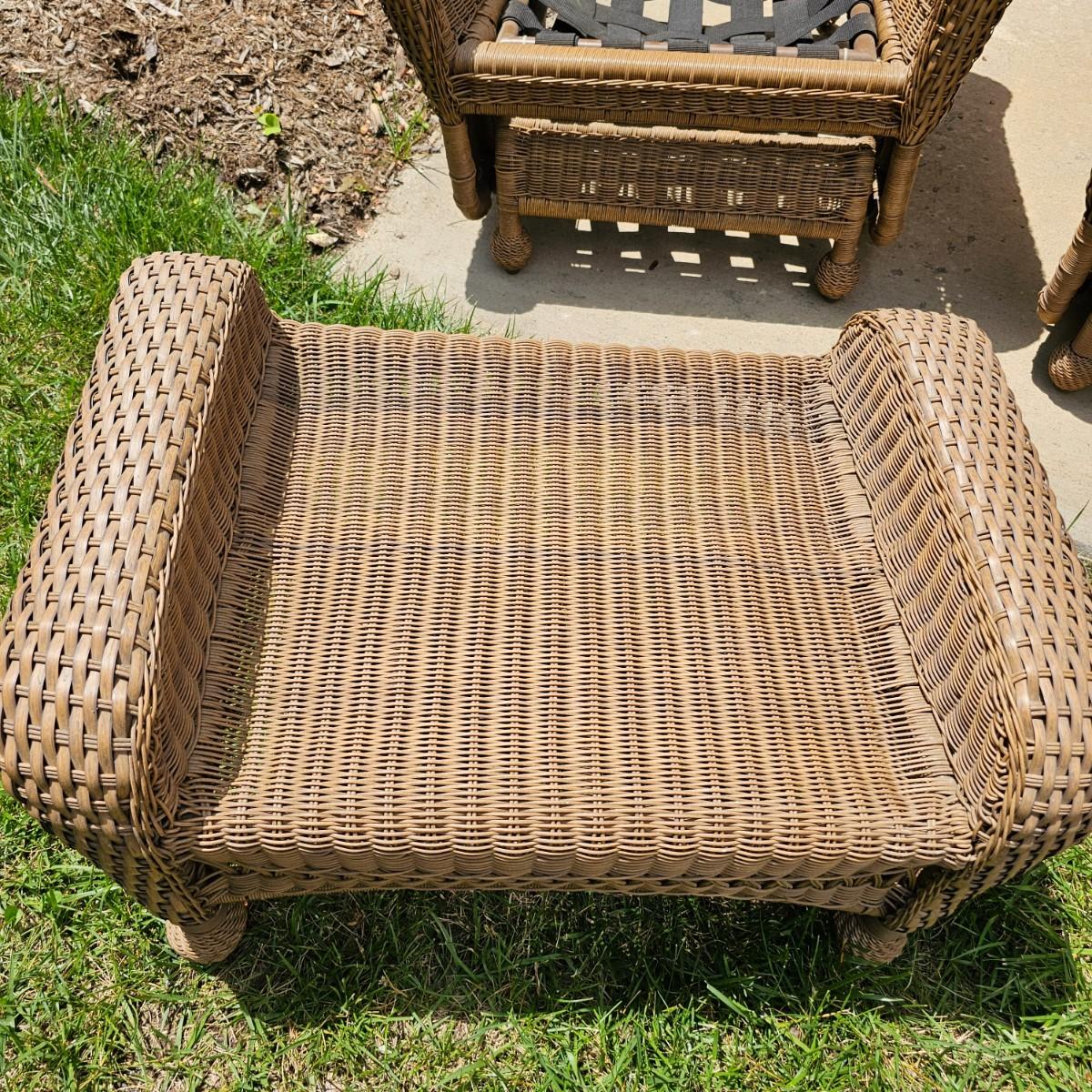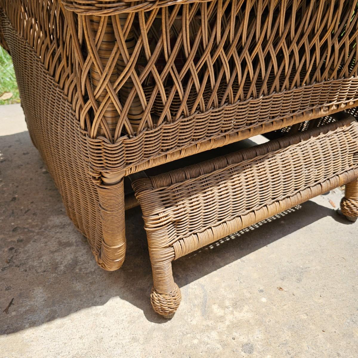 Two brown-tone faux Rattan rockers/gliders with matching ottoman, cushions and covers. Rounded backs and wide armrests, they measure 34" x 32" x 37"H with a 20" seat height. Ottoman is 29" x 20" x 16"H, has 17" seat height. Three protective vinyl covers included. Some sun fade and spots on cushions. See photos for details. Local pickup only.